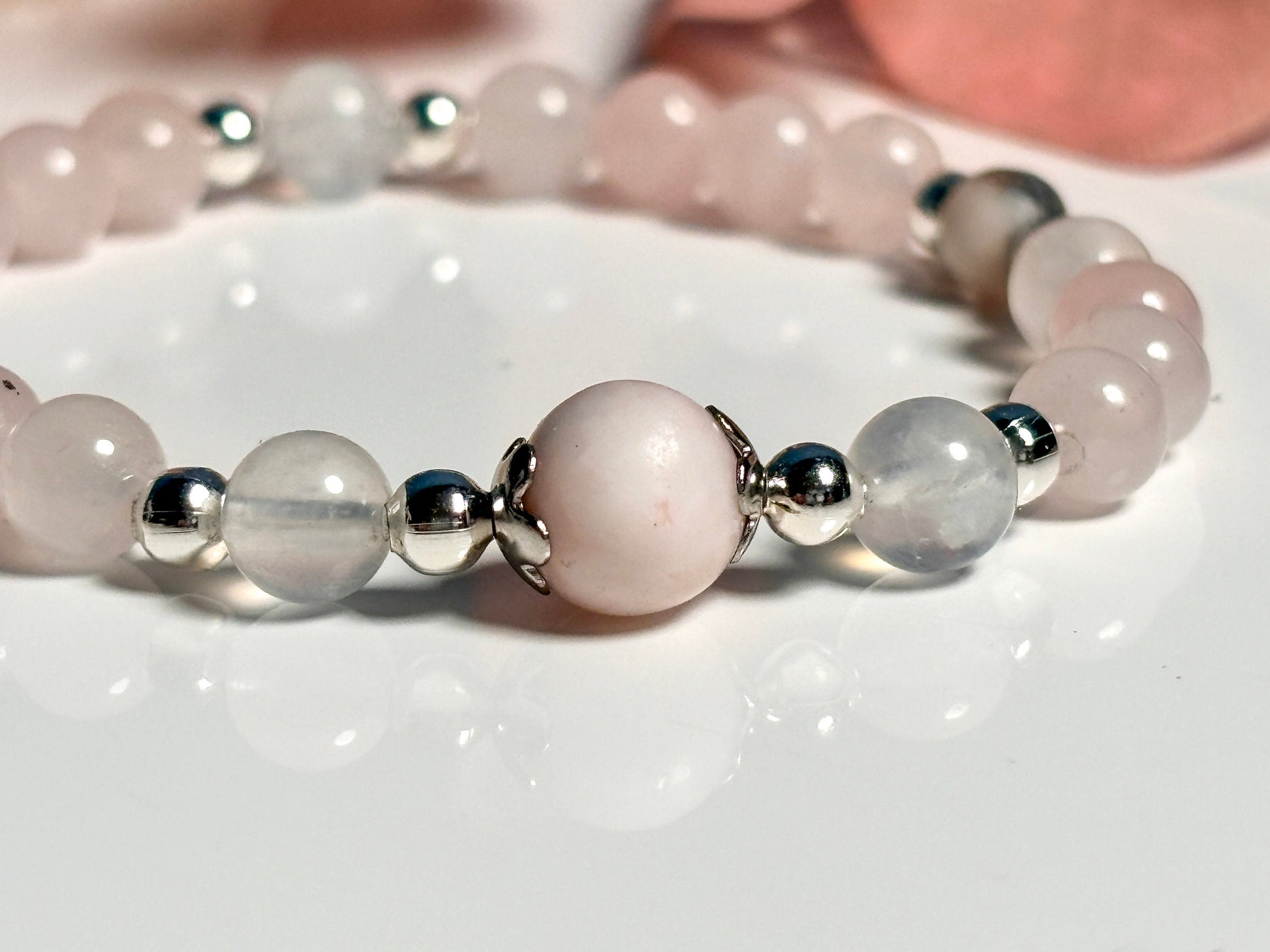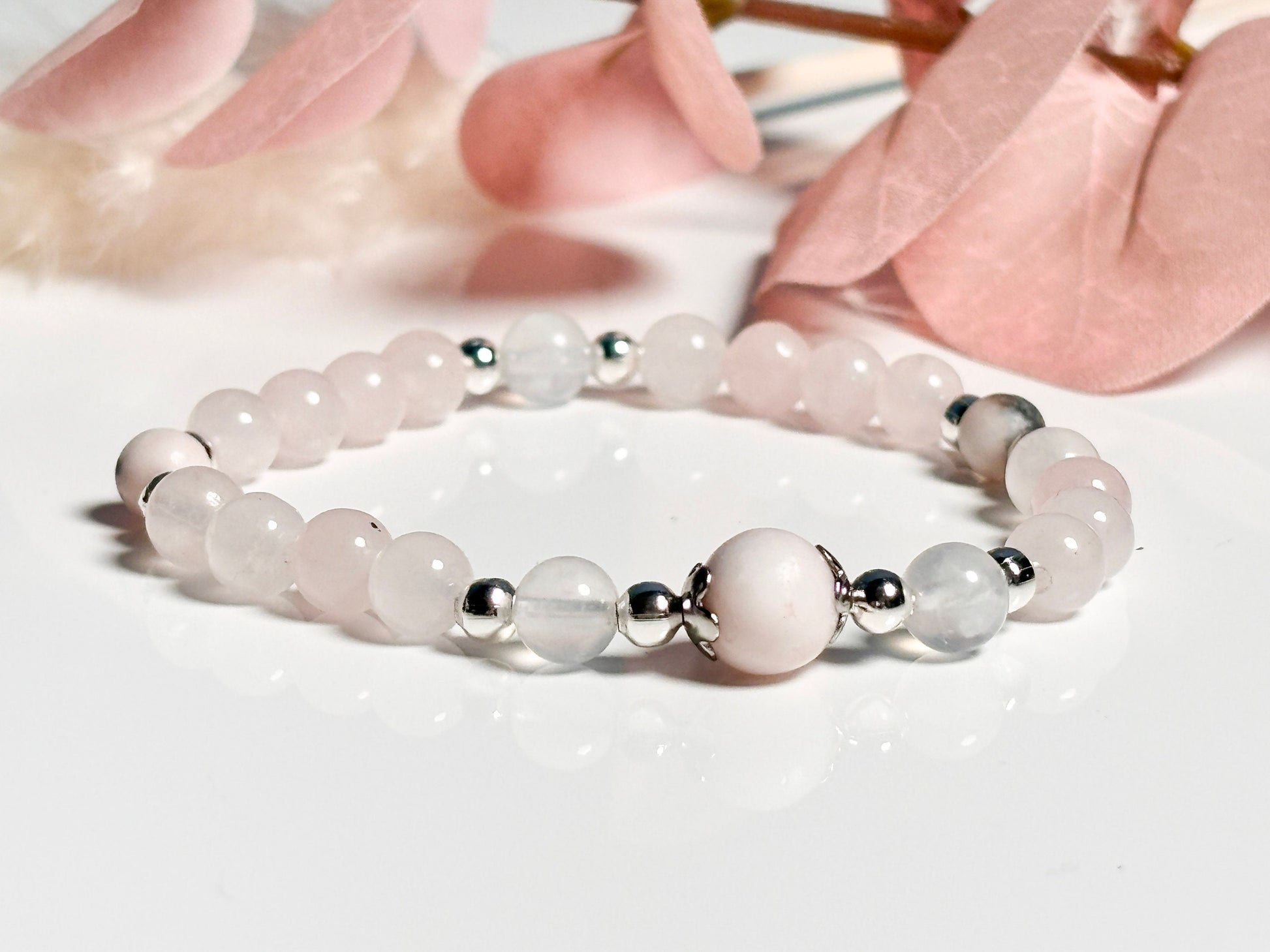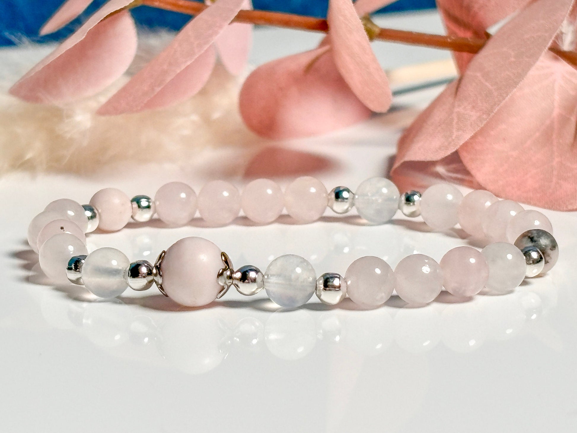 Beautiful elastic bracelet with zebra jasper, moonstone and rose quartz.