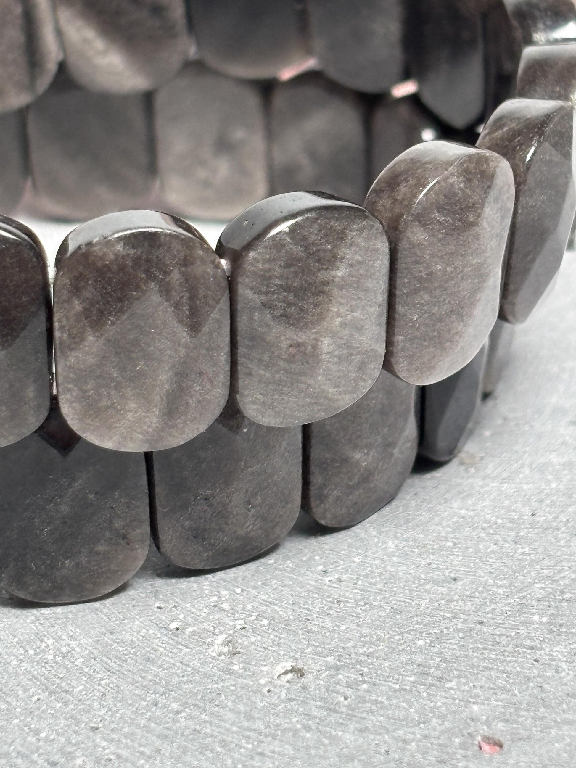 Armreif aus Silber Obsidian ca. 18 cm, elastisch, facettierte rechteckige Perlen, Edelstein Armband Kristall