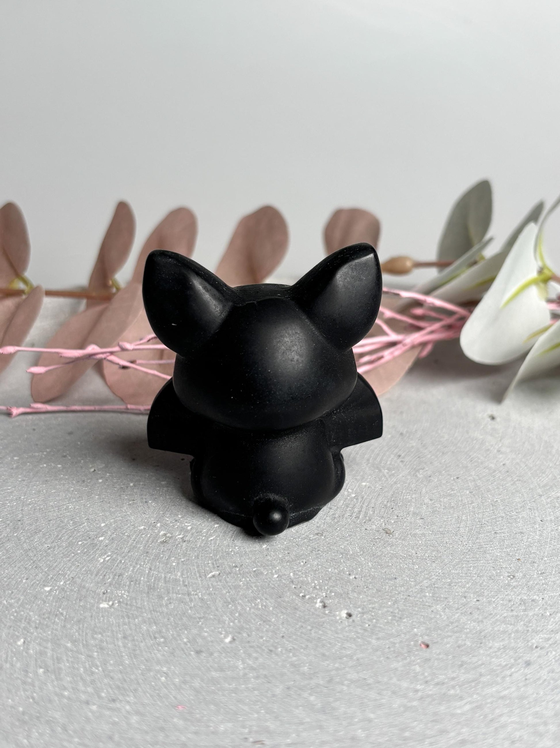 Material: Schwarzer Obsidian (Naturstein, poliert) Größe: ca. 5,7 × 5,1 × 3,4 cm Gewicht: ca. 90 g Form: niedliche Fledermausfigur Farbe: tiefschwarz mit natürlichem Glanz Herkunft: natürliche Obsidianqualität, handgearbeitet Jede Figur ist ein Unikat – leichte Abweichungen in Form, Farbe und Struktur sind naturbedingt und unterstreichen den individuellen Charakter des Steins.