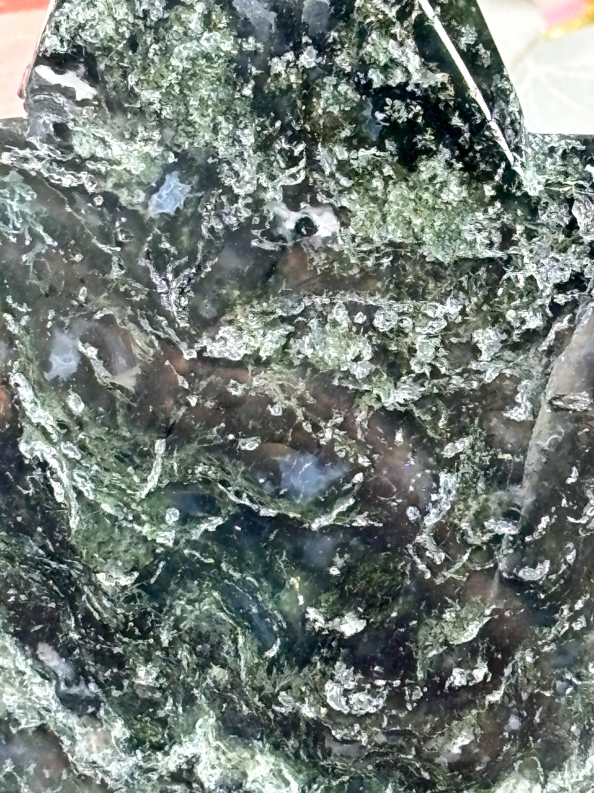 Dieser wunderschöne Moosachat Stern ist ein echtes Unikat! Mit seiner außergewöhnlichen Moosstruktur und den natürlichen Einschlüssen bringt er die Schönheit der Natur direkt in dein Zuhause. Der Stern misst ca. 8,3cm im Durchmesser, ist 1,2cm dick und wiegt 124g eine beeindruckende Größe, die ihn zu einem auffälligen Dekorationsstück macht. Perfekt als Schmuck für deinen Altar, als Hingucker auf deinem Regal oder als besonderes Geschenk für Kristallliebhaber:innen. (Bitte beachten: Der abgebildete Halter ist nicht im Lieferumfang enthalten.)