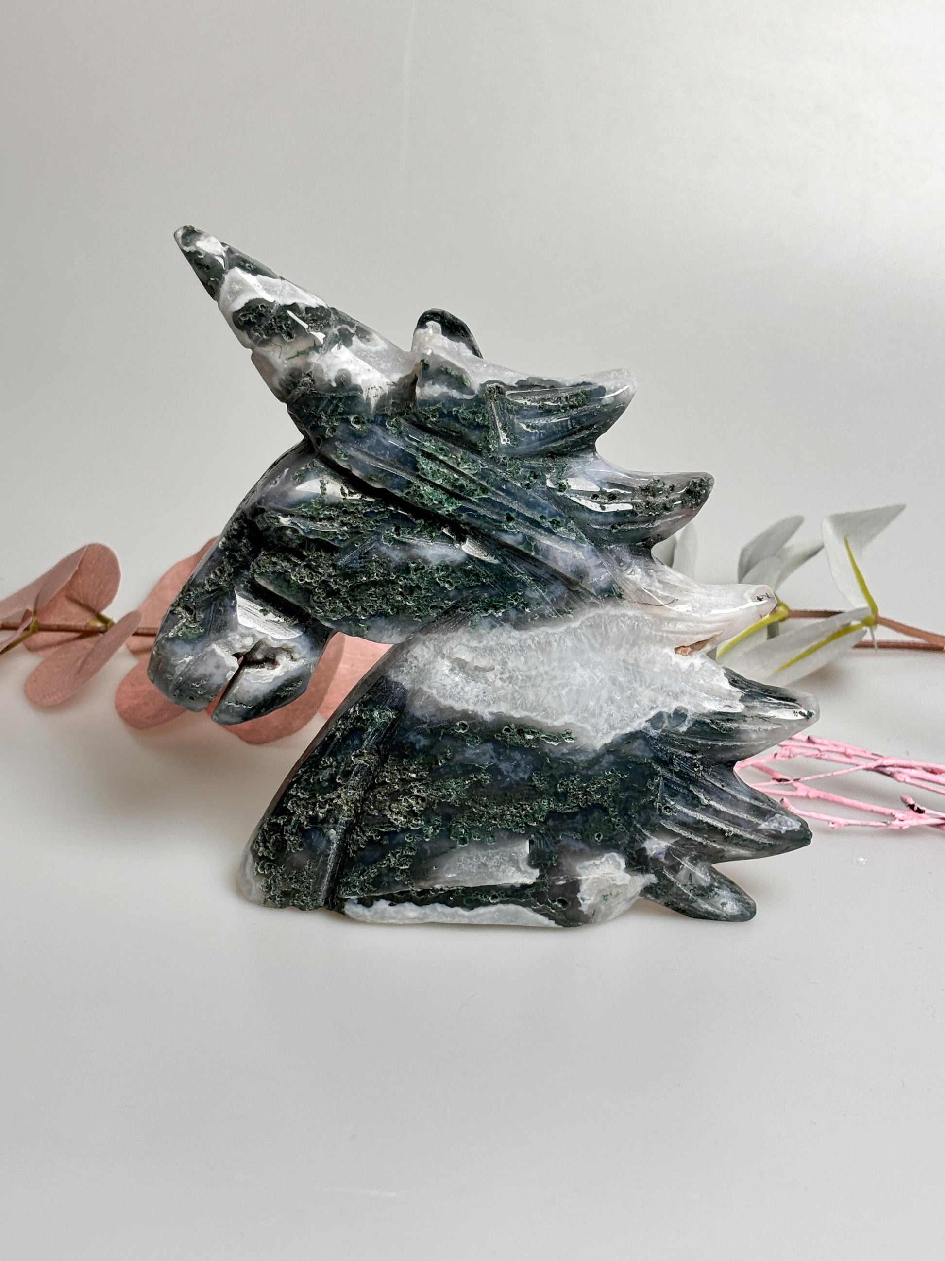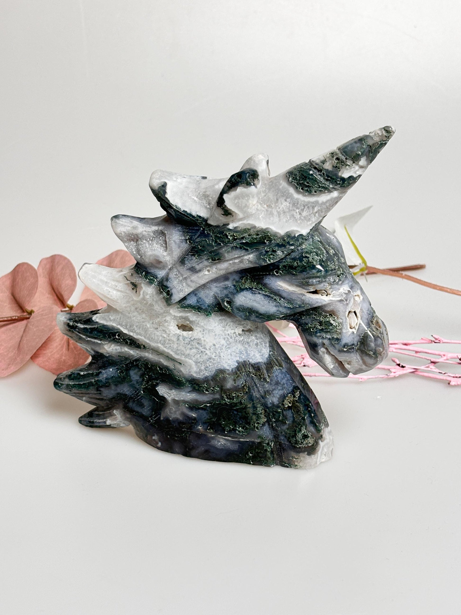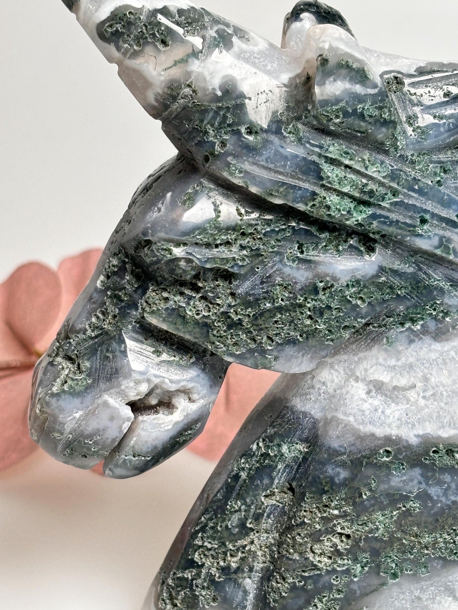 Large unicorn made of moss agate, unique with fascinating moss structure & sparkling druzy. Perfect as decoration!