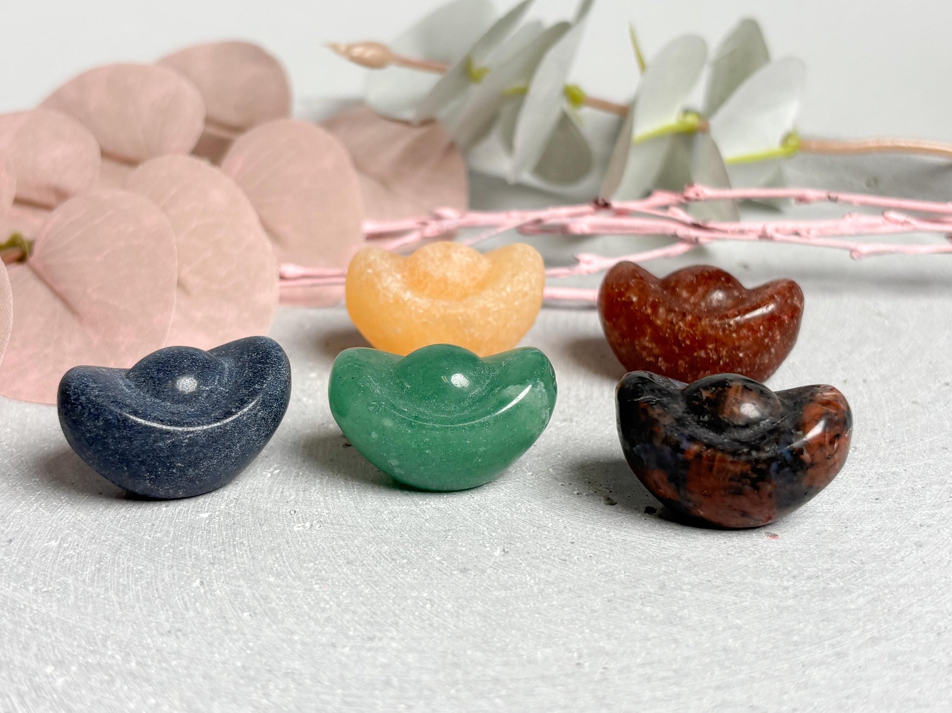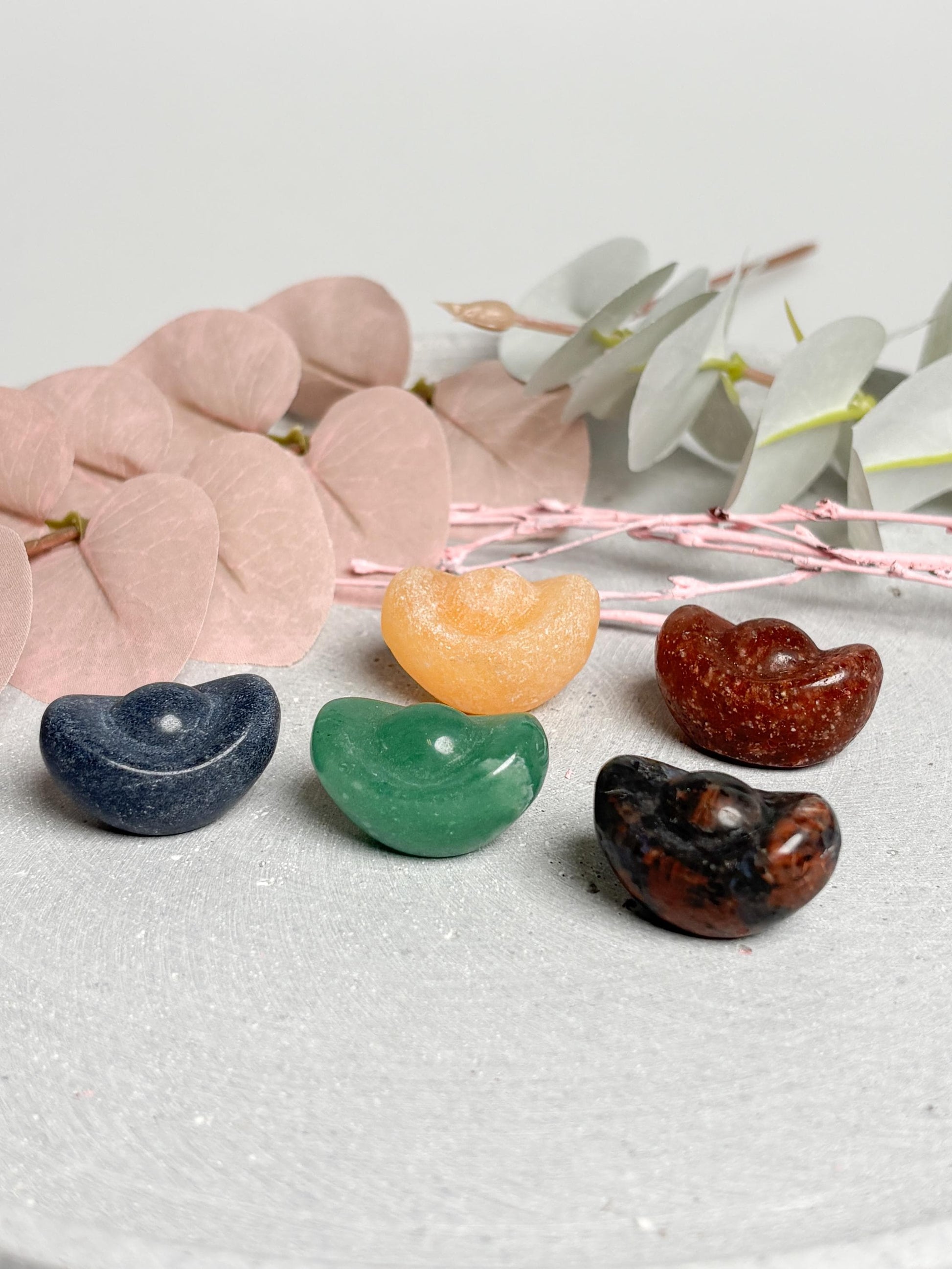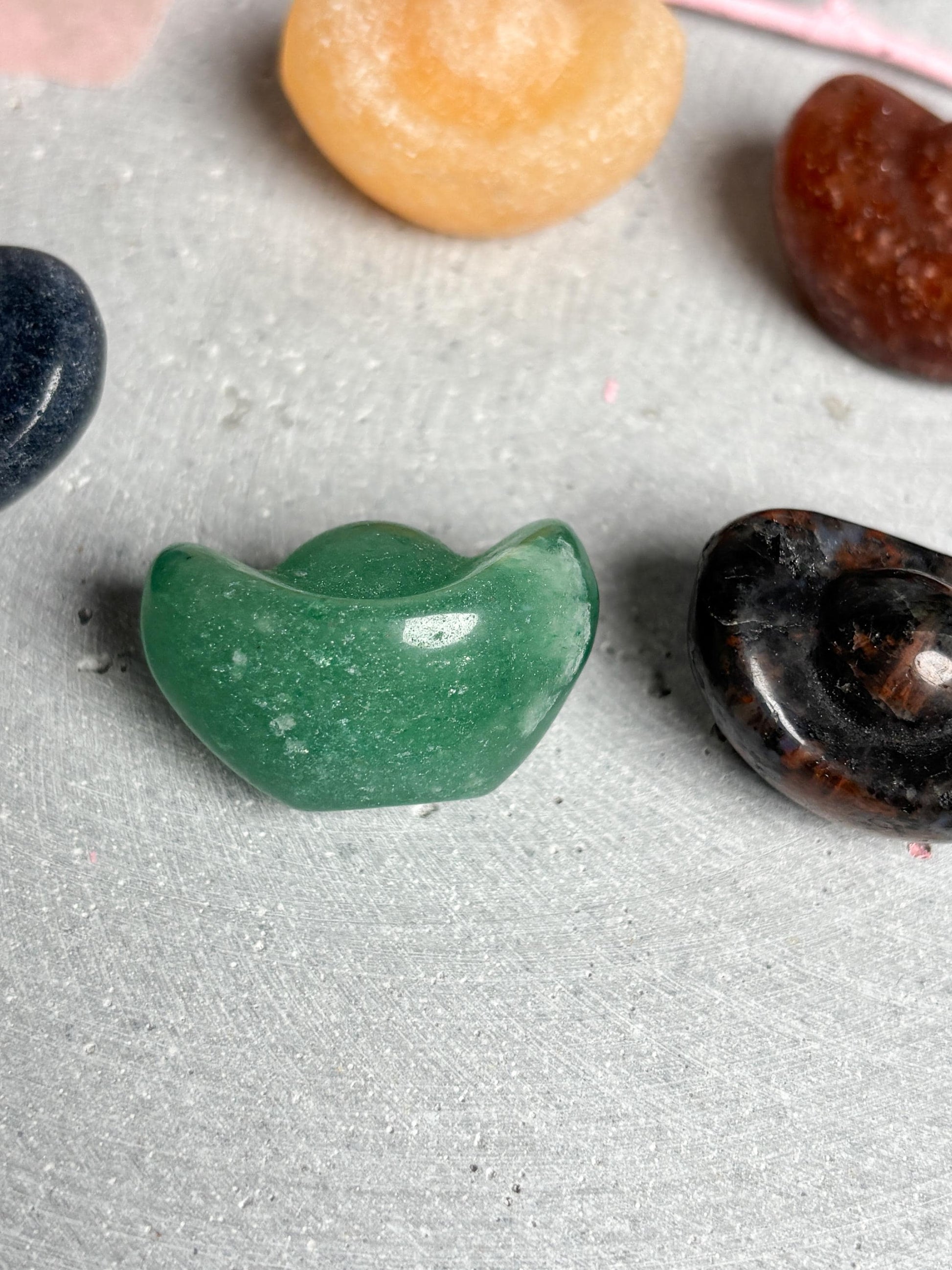 Kleines Money Boat Carving ca. 2,9 cm aus Calcit, grünem Aventurin, Erdbeerquarz, Mahagoni Obsidian und blauem Aventurin