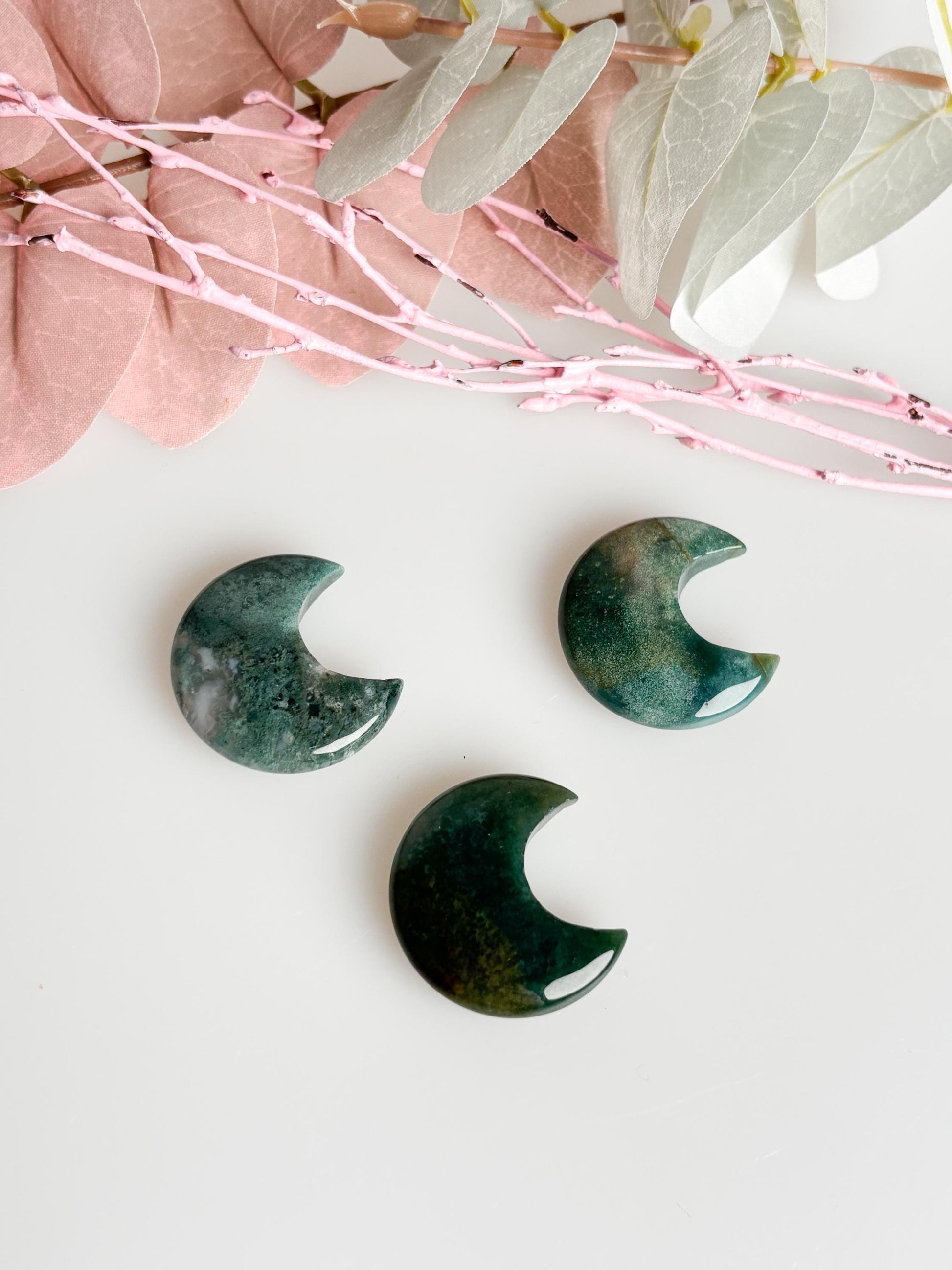 Small Moss Agate Moon Carving – Beautiful decoration for spirituality & home, handcrafted precious detail for your home