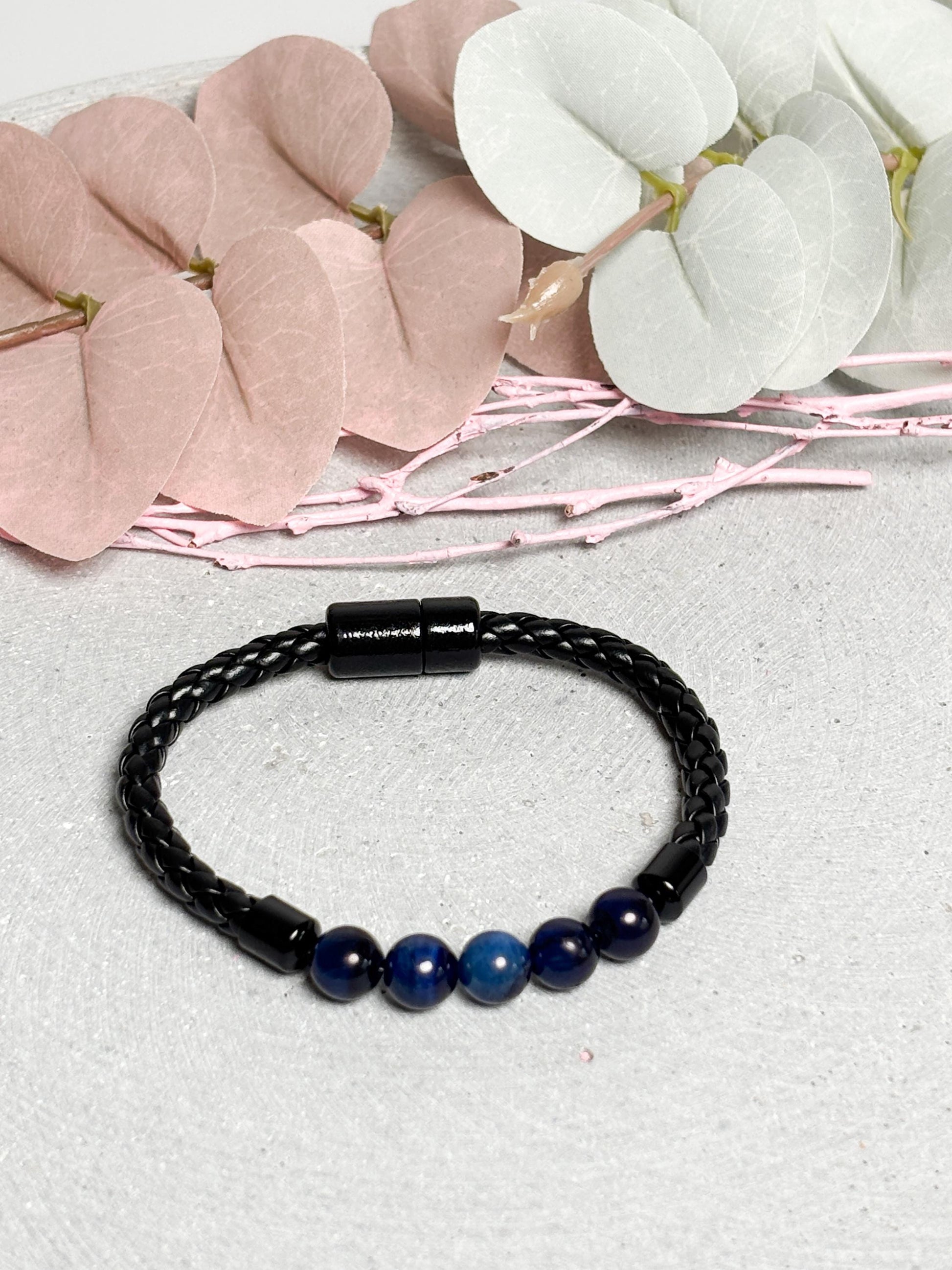Lederarmband mit blauen Tigerauge Perlen und Magnetverschluss, Herren Armband Leder, Perlenarmband MĂ€nner, Schmuck modern