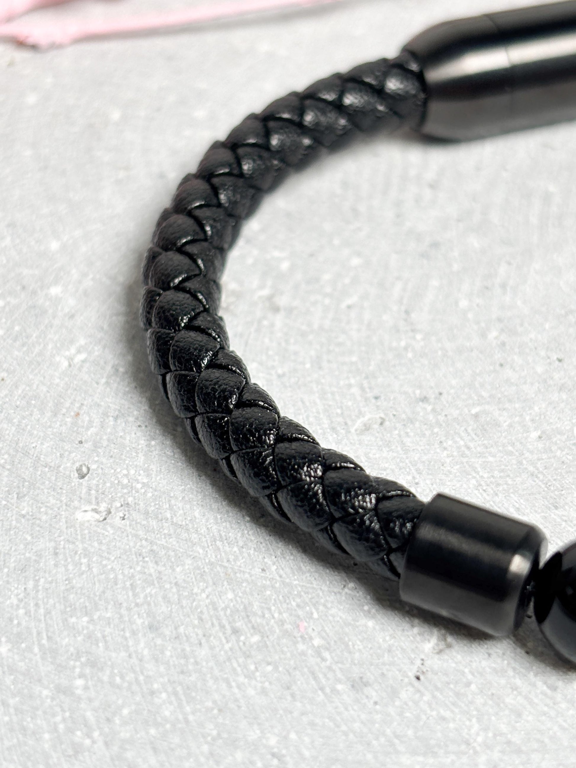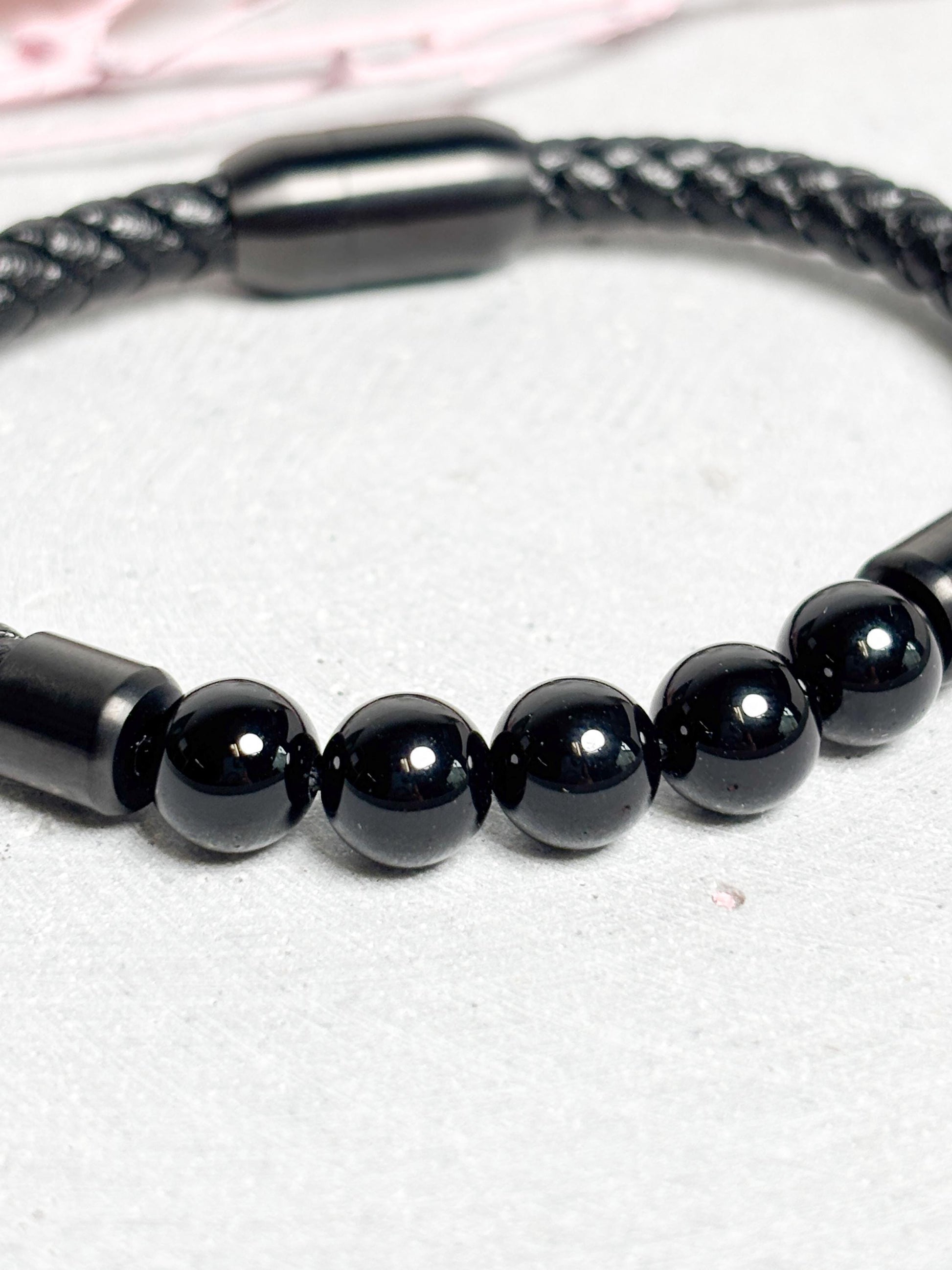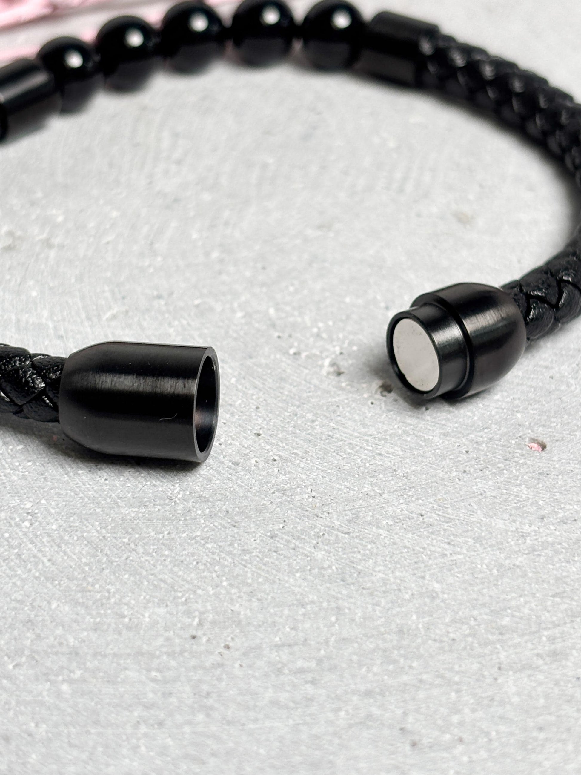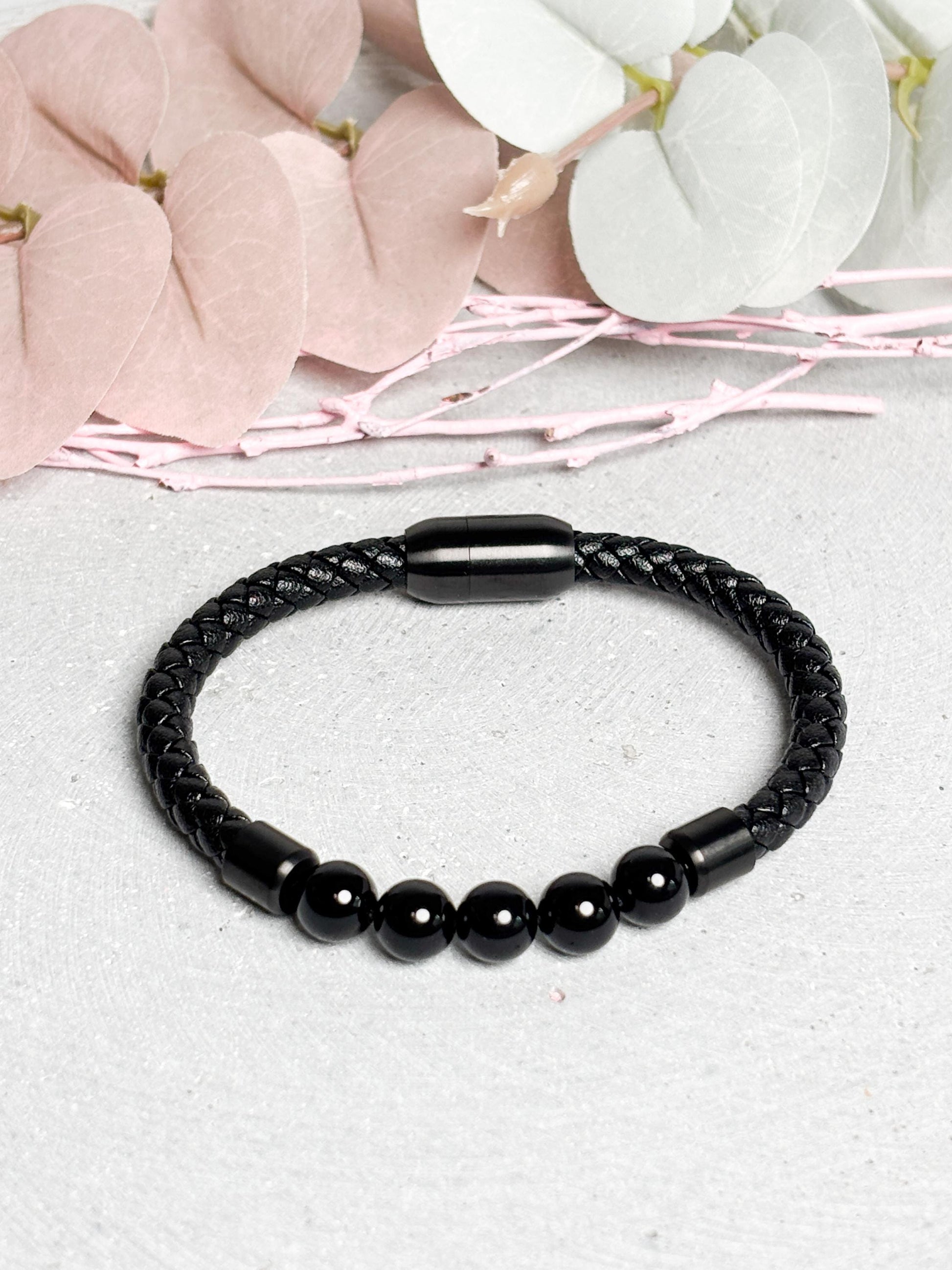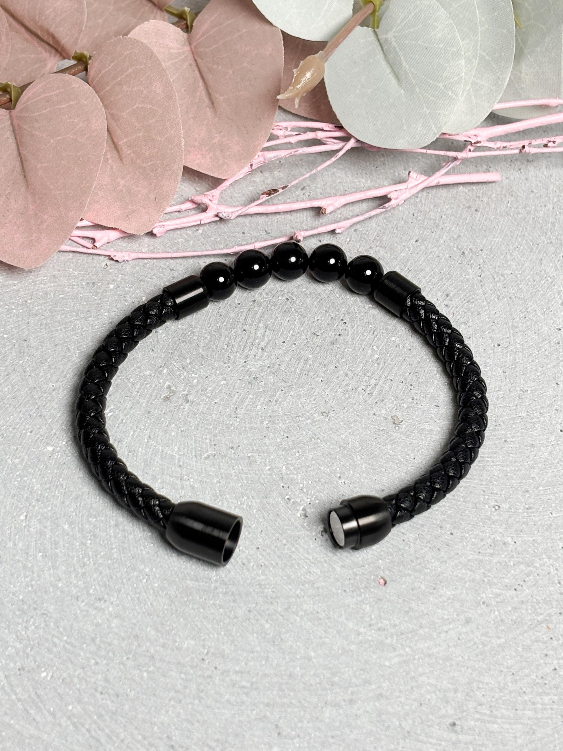 âą Material: geflochtenes Leder mit glatten schwarzen Perlen âą Farbe: Schwarz, glĂ€nzende Perlenoptik âą Verschluss: praktischer Magnetverschluss in Schwarz âą LĂ€nge: ca. 21 cm (passt vielen MĂ€nner-Handgelenken; bitte Umfang vorab messen) âą Breite: ca. 7 mm, angenehmes TragegefĂŒhl âą Stil: modern, minimalistisch, maskulin, ideal fĂŒr Alltag & Anlass