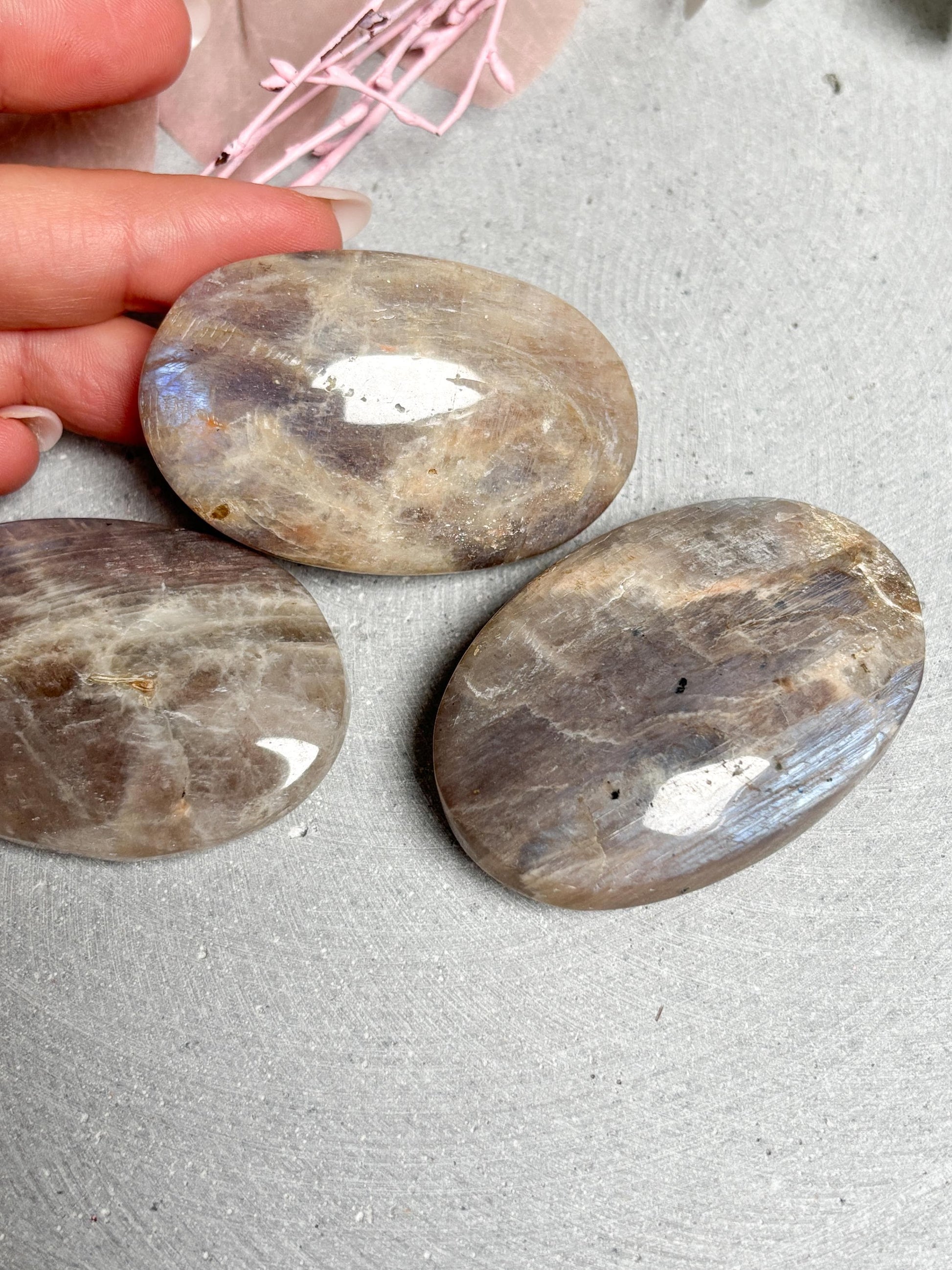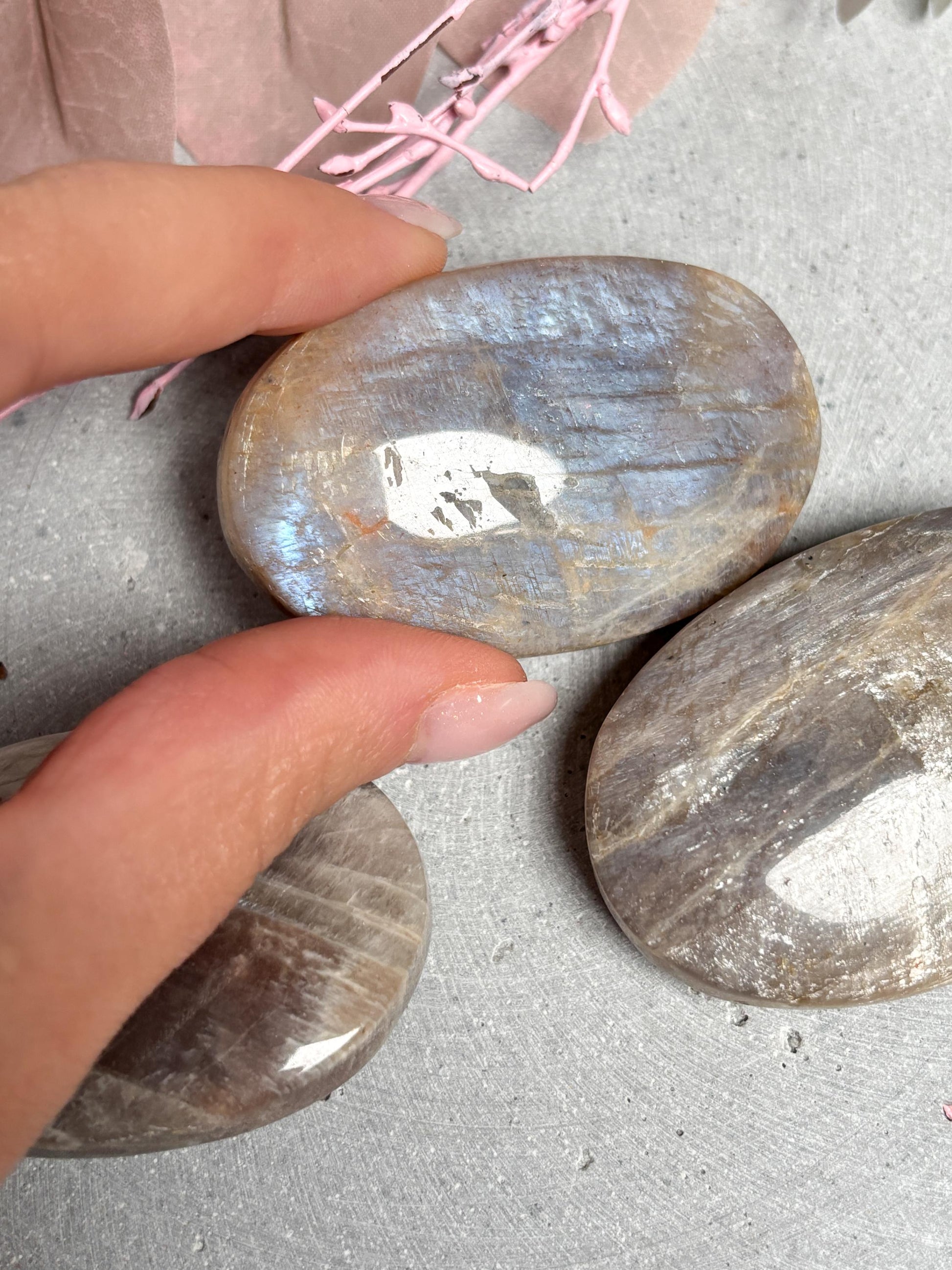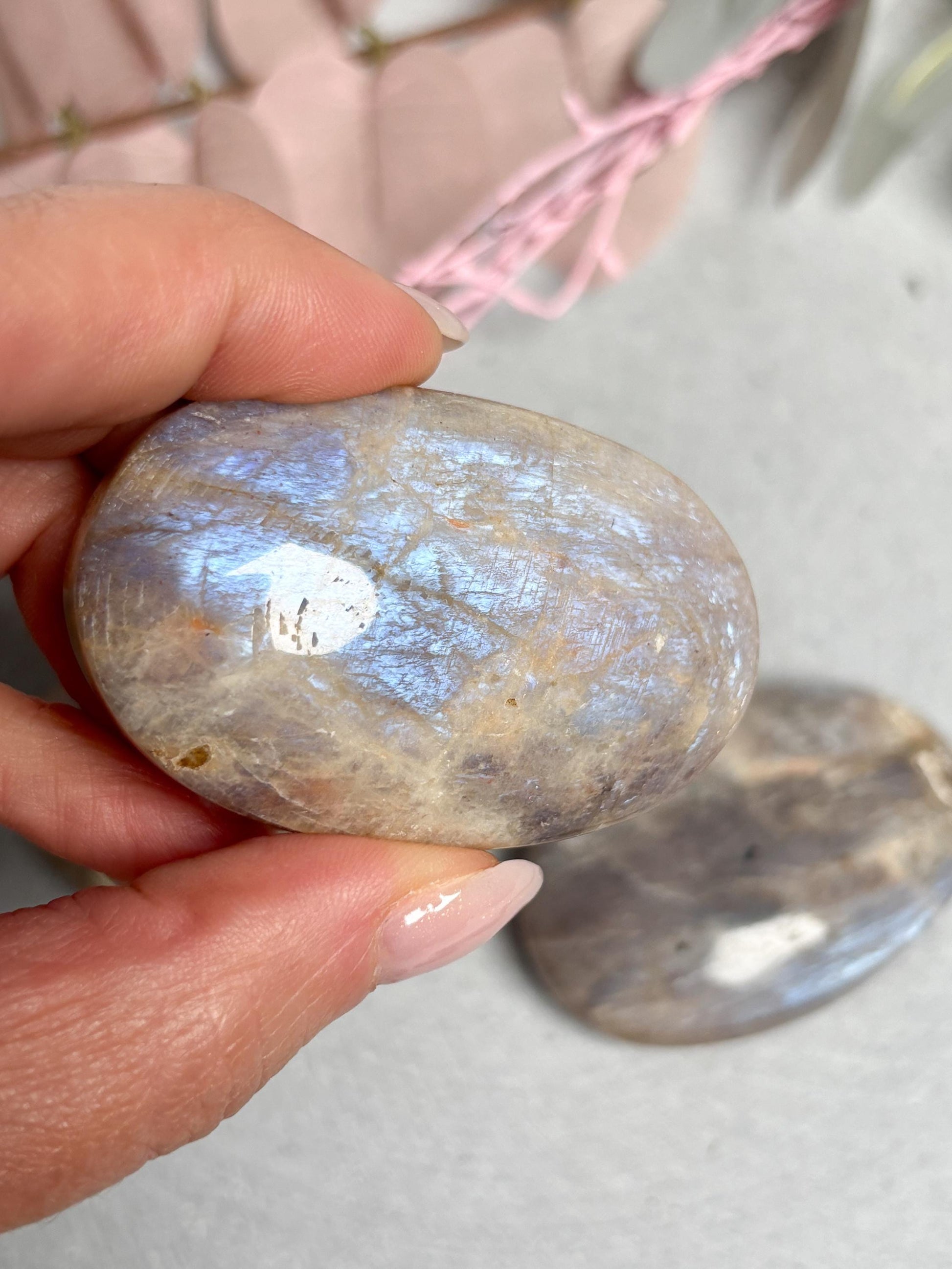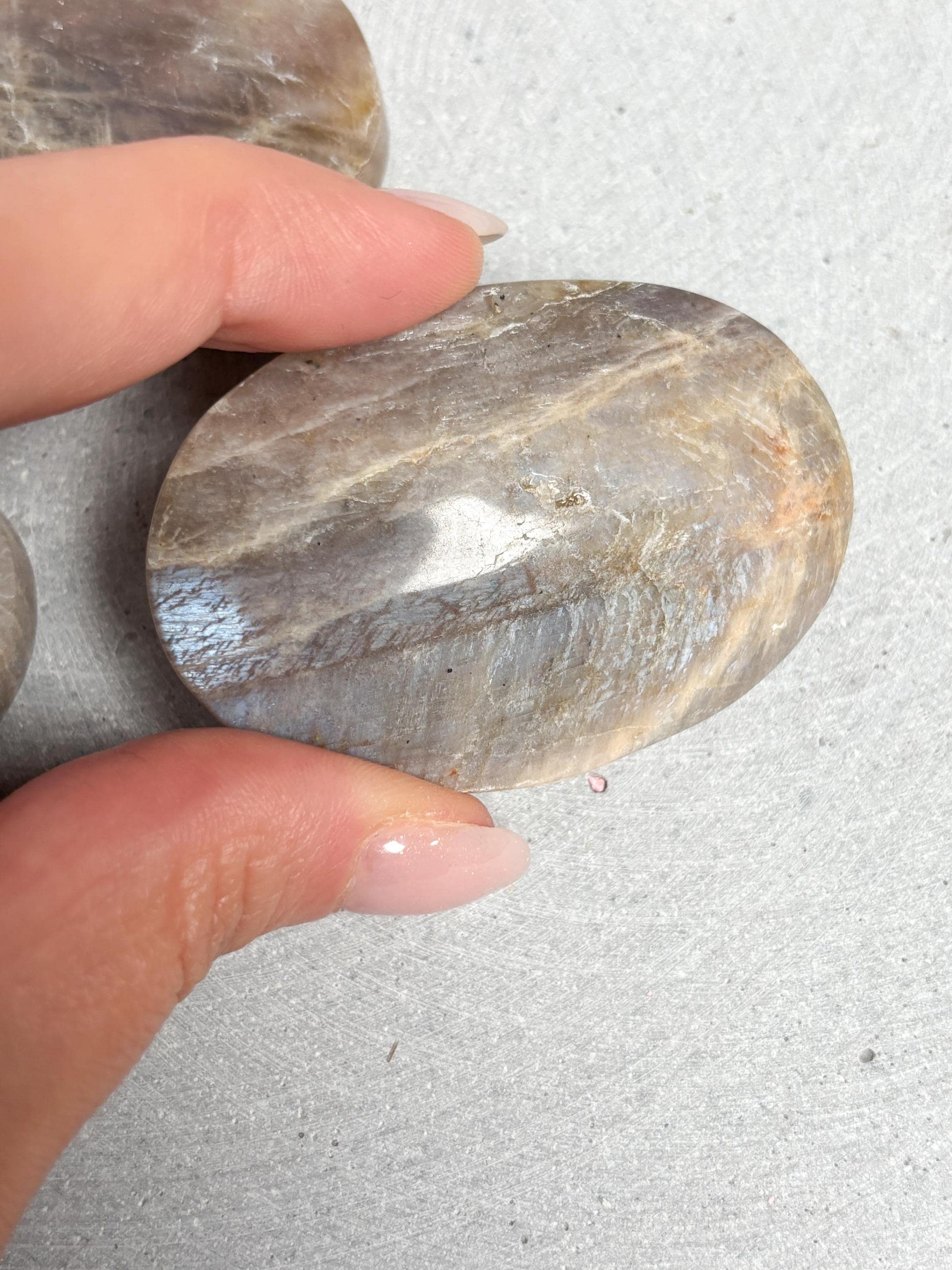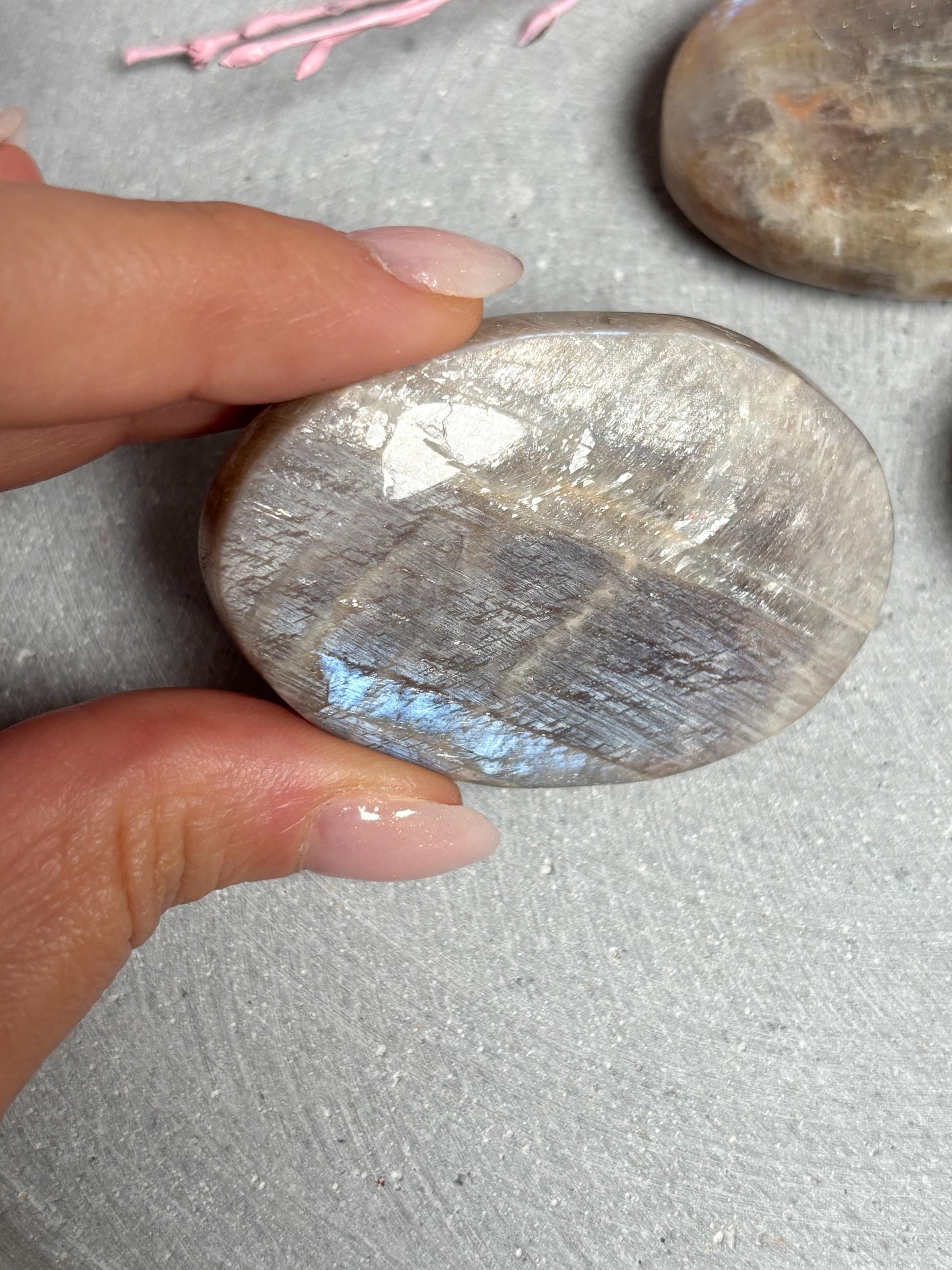 Mondstein Taschenstein polierter Edelstein ca. 5,8x2,8 cm, mit blauem Flash, Kristall Heilstein für Intuition & Balance