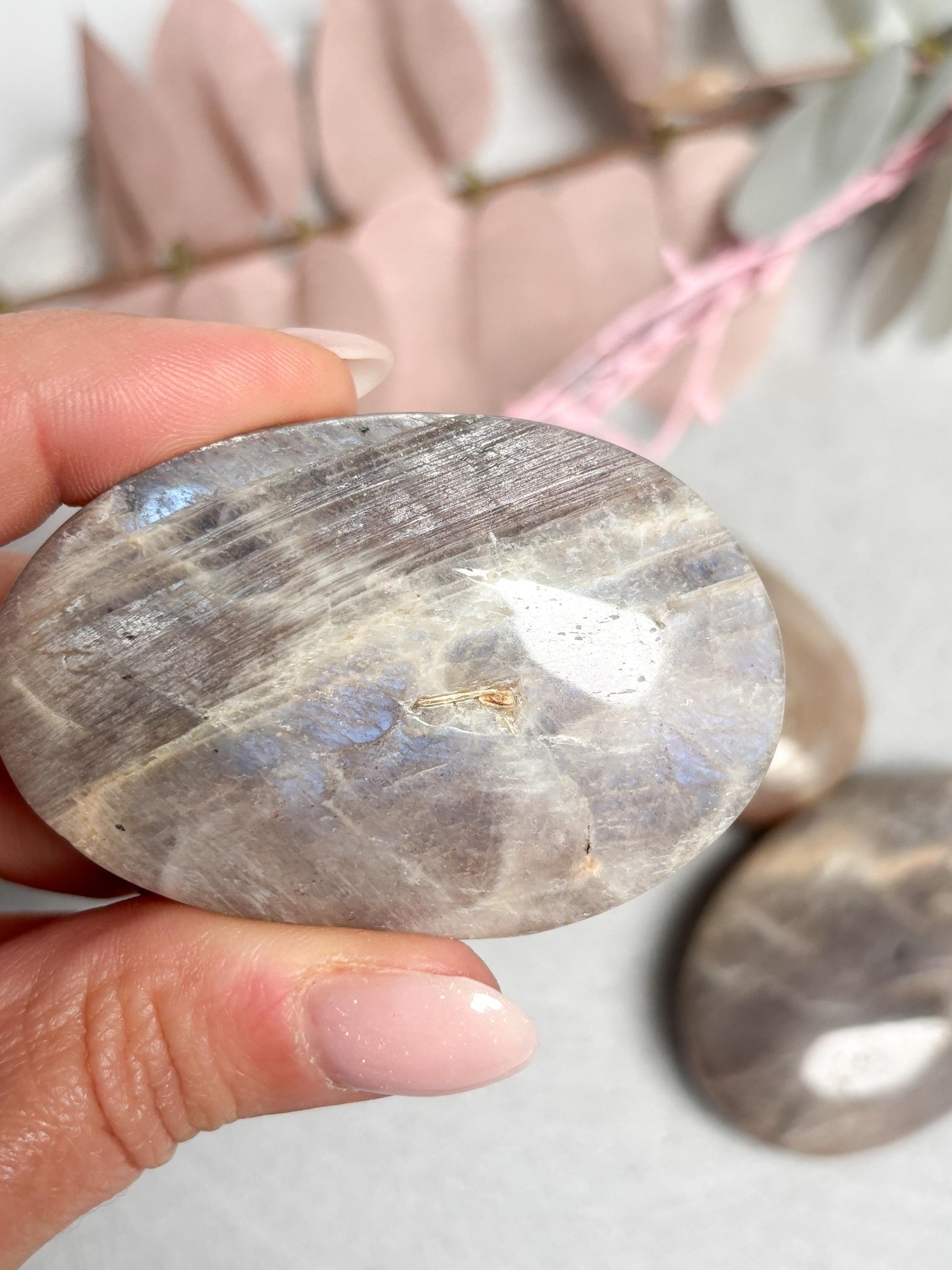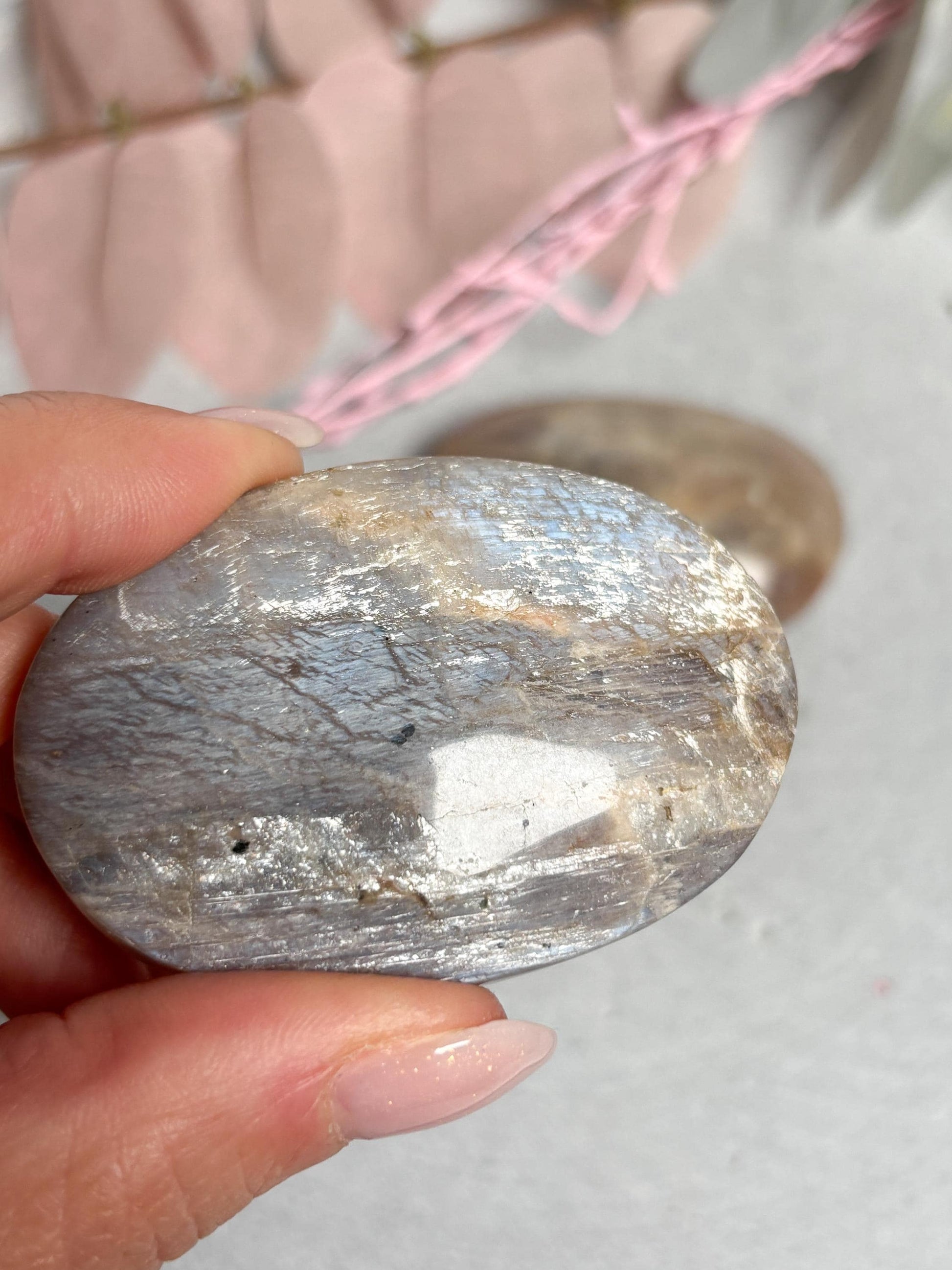 Dieser Taschenstein besteht aus echtem Mondstein mit wunderschönem blauem Flash, der je nach Lichteinfall intensiv schimmert. Jeder Stein zeigt ein einzigartiges Farbspiel von Weiß, Grau und Blau – ein Naturprodukt mit individueller Struktur. Größe ca. 5,8 x 2,8 cm, Gewicht leicht variabel. Der Stein liegt angenehm in der Hand und eignet sich ideal als Handschmeichler, Meditationsstein oder Begleiter im Alltag.