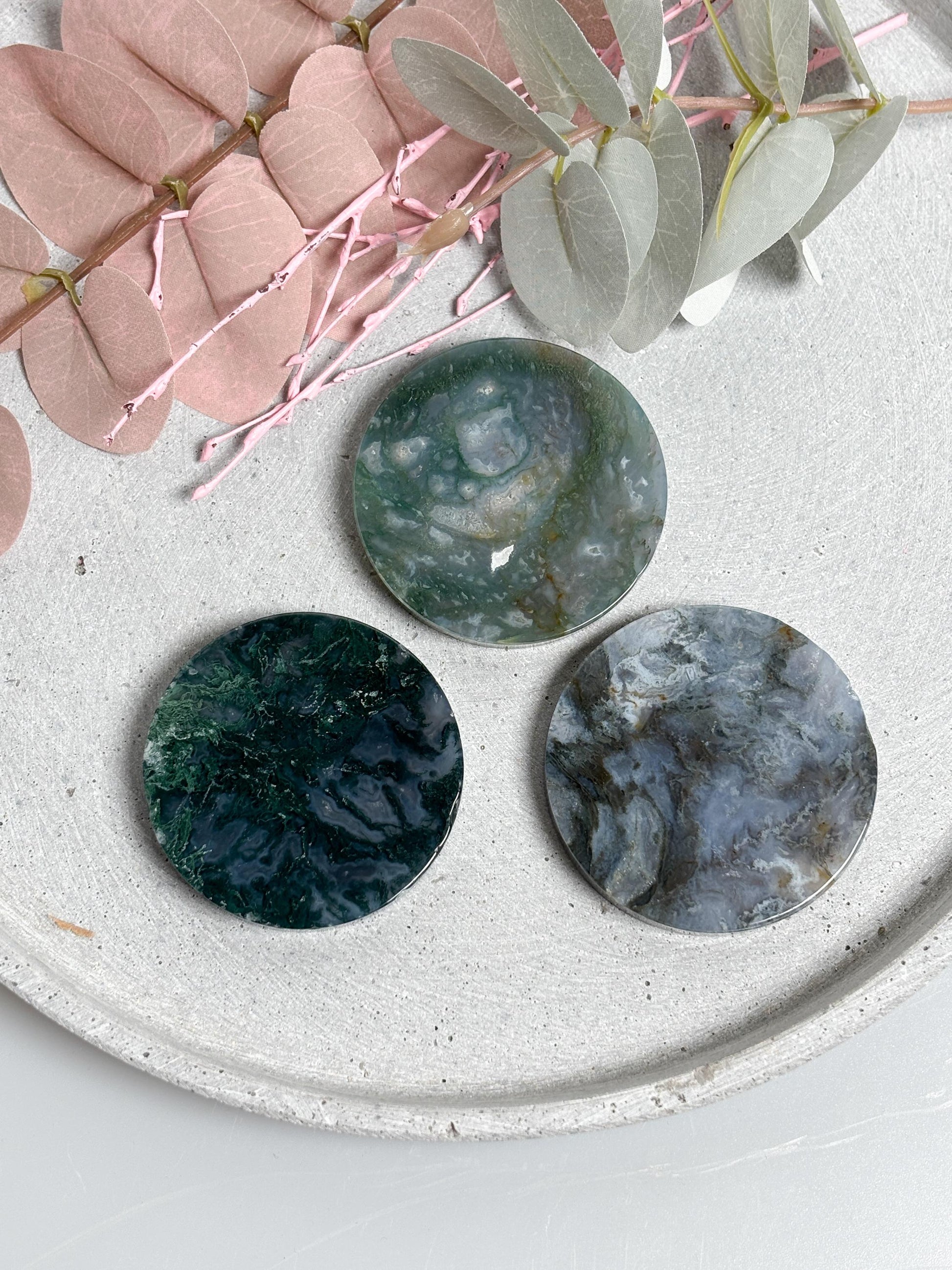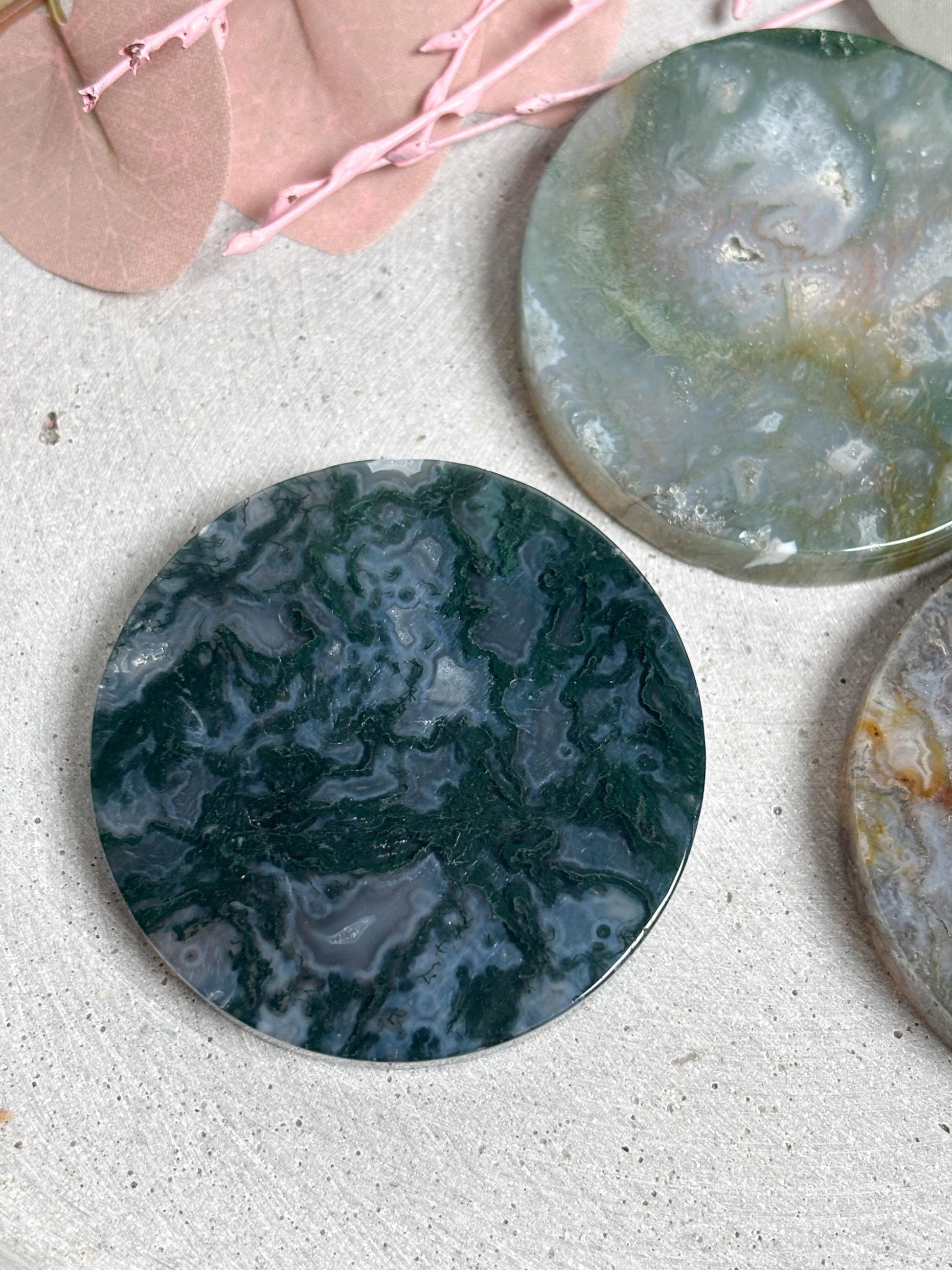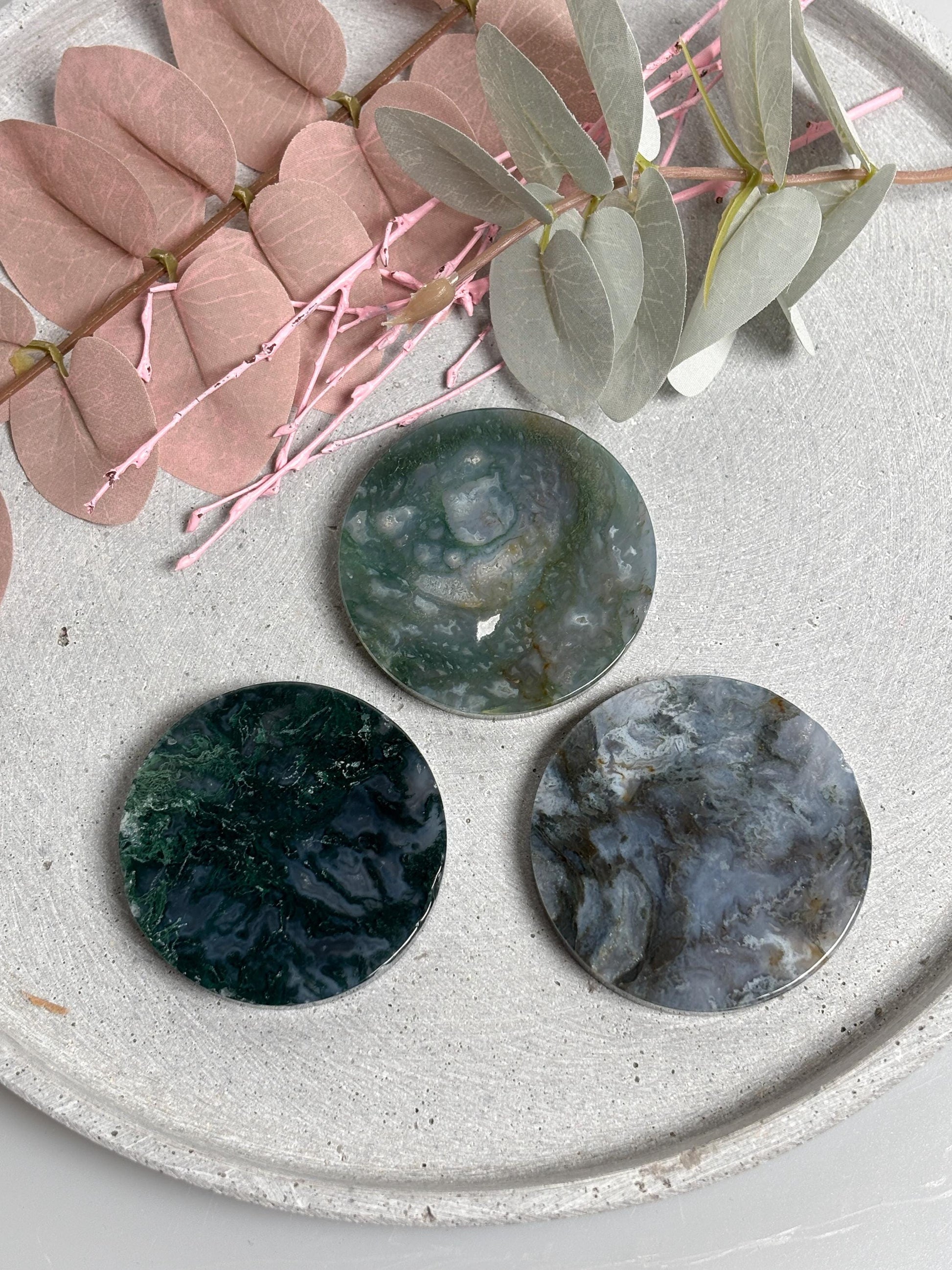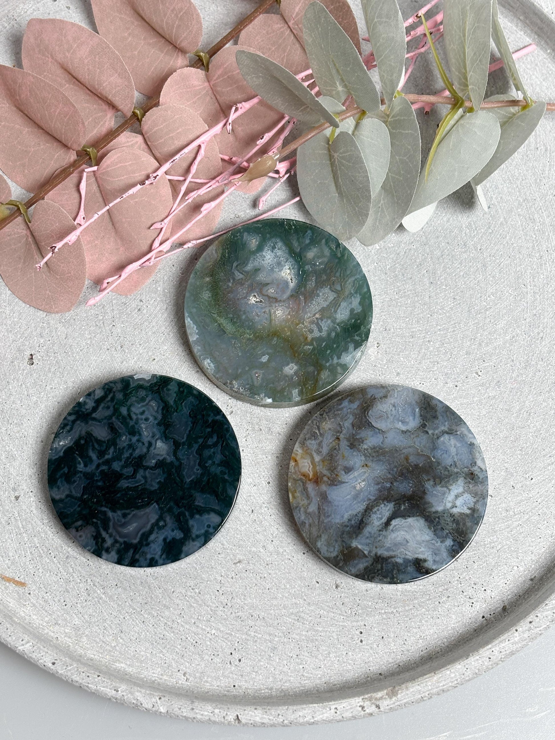 Moosachat Untersetzer aus Naturstein ca. 5,7cm große Scheiben mit einzigartigem Muster, ideal für Altare, Deko oder Kristallrituale