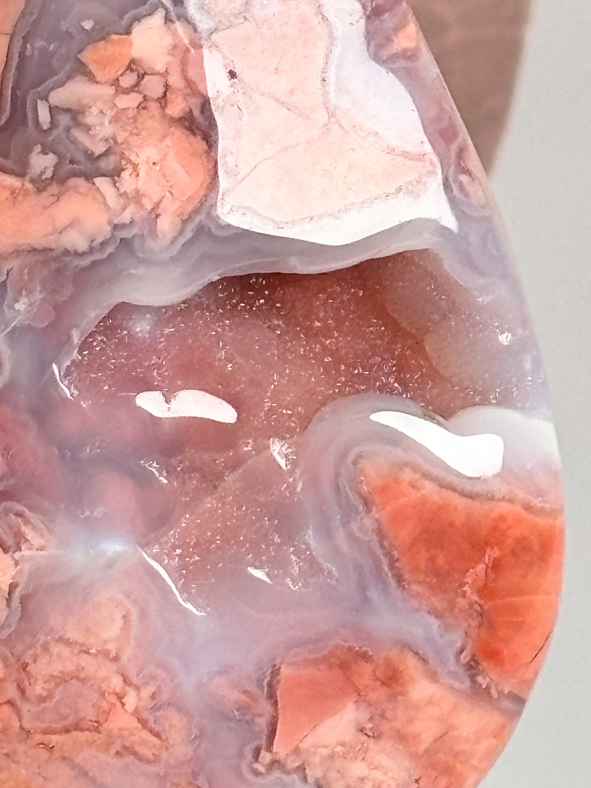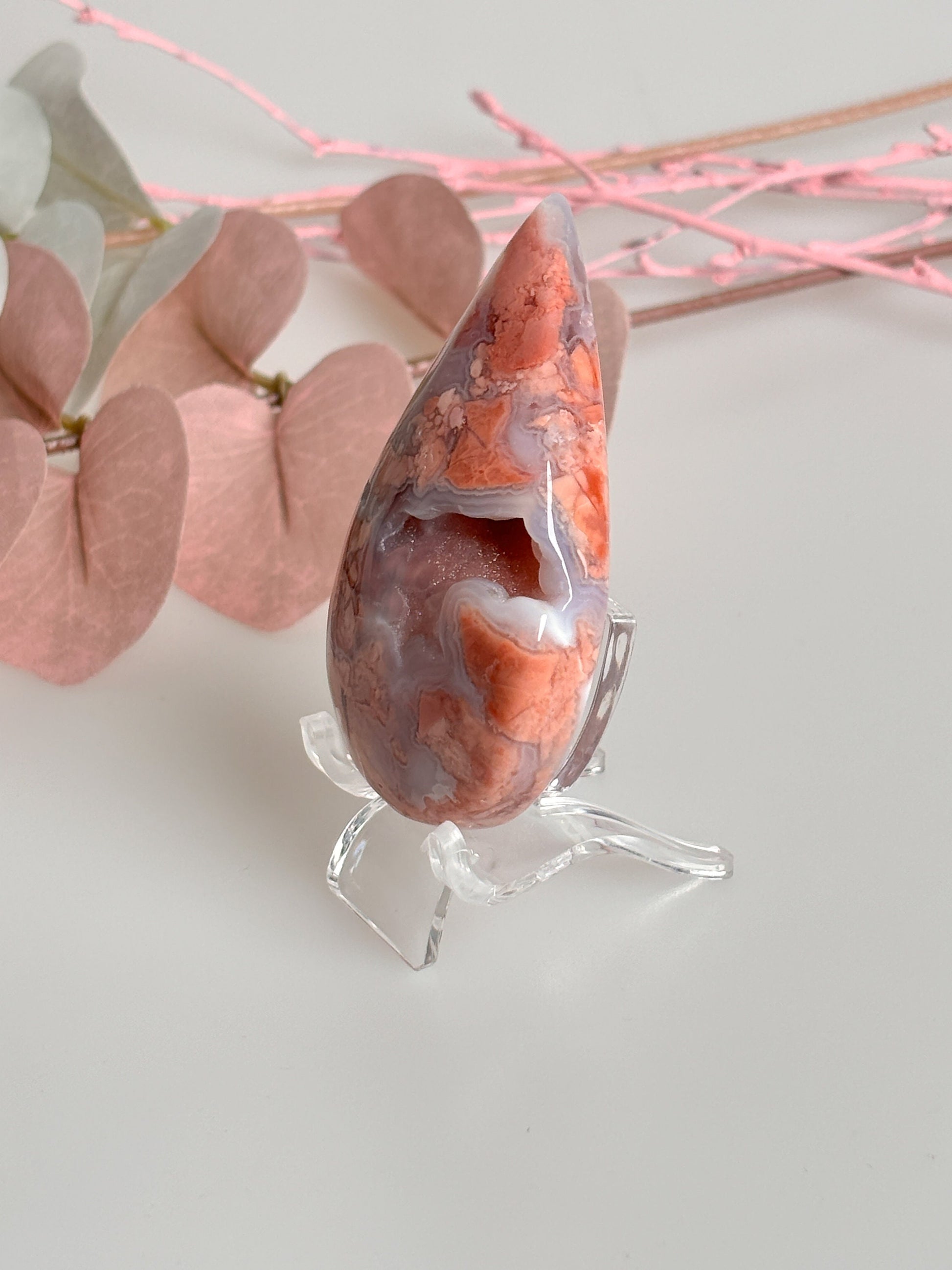 Dieser faszinierende Achat verfügt über zwei bezaubernde Drusen, die wie funkelnde Schätze aus dem Inneren des Steins hervorleuchten. Die Tropfenform des Steins sorgt für eine elegante und gleichzeitig moderne Ästhetik, die jeden Raum aufwertet.