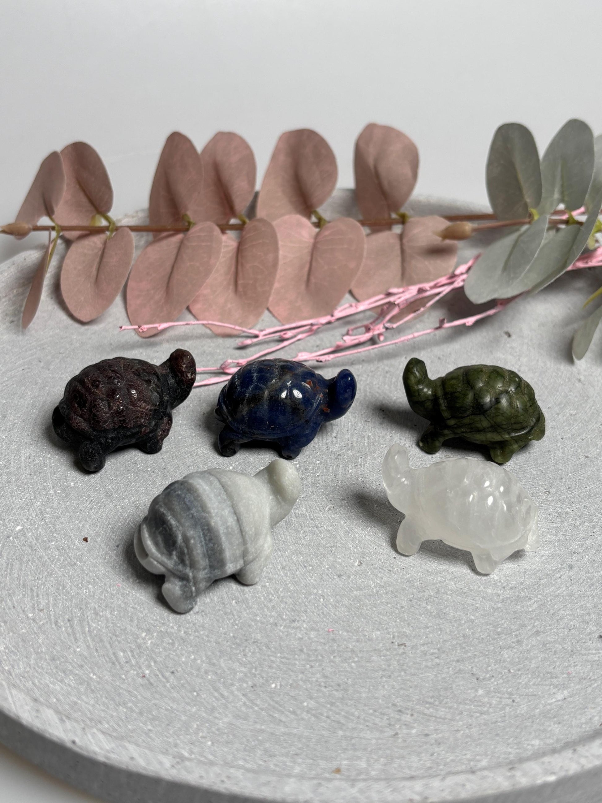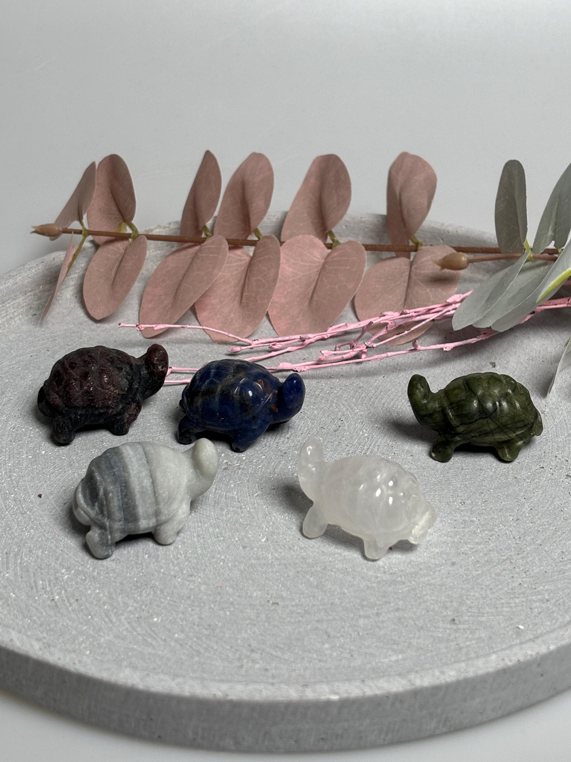 Schildkröte Figur aus Edelstein 4 cm Kristall Carving aus Zebra Calcit, Sodalith, Bergkristall, Mahagonie Obsidian oder Jade