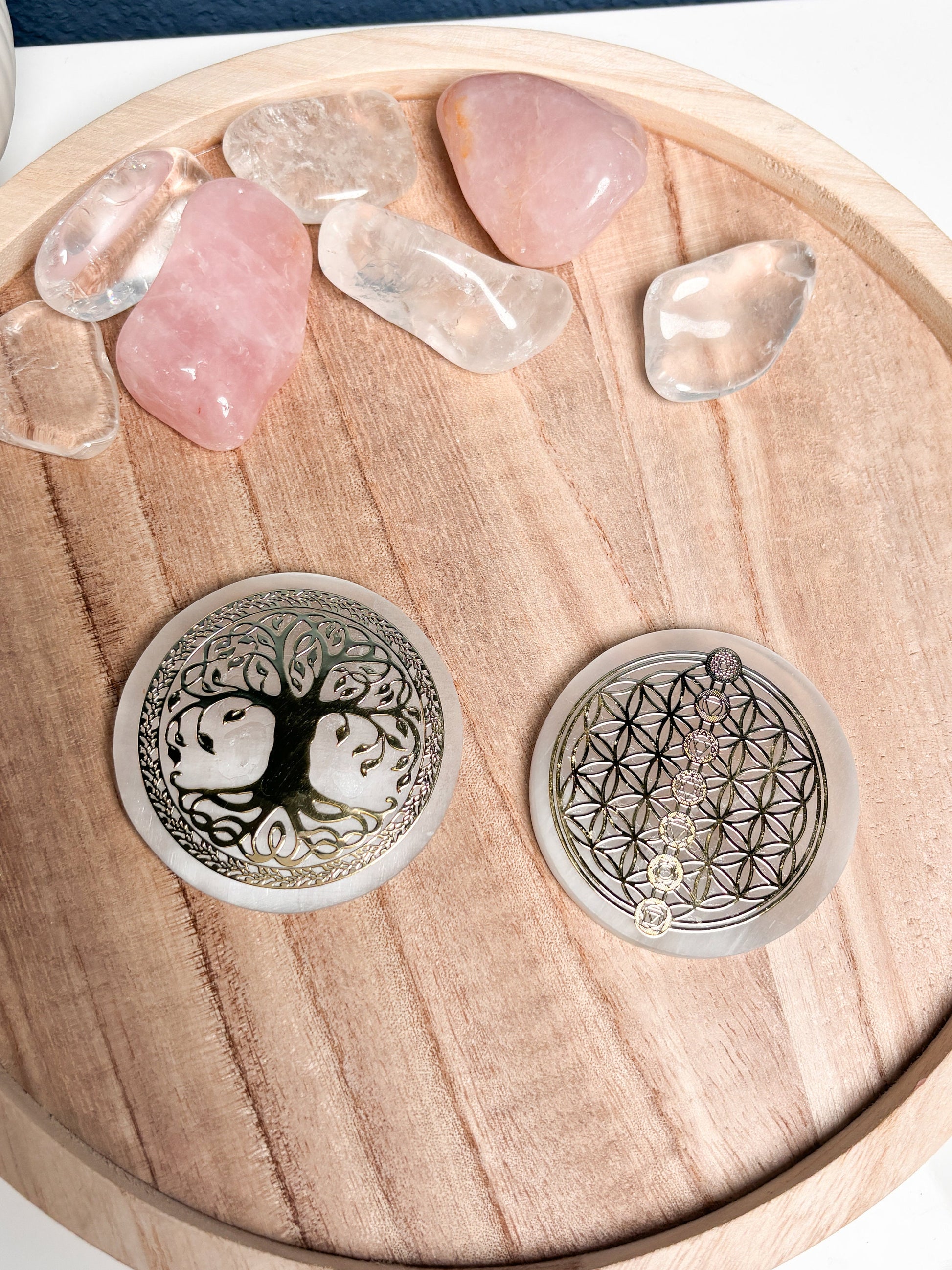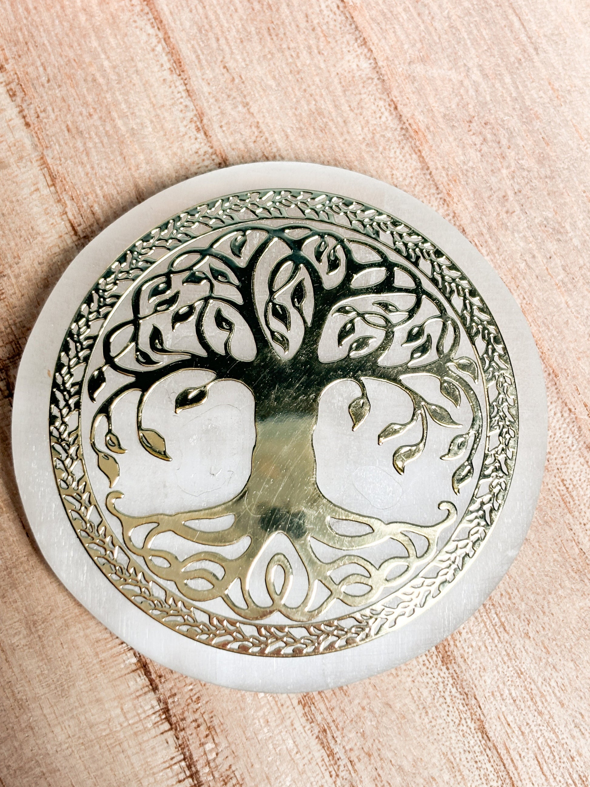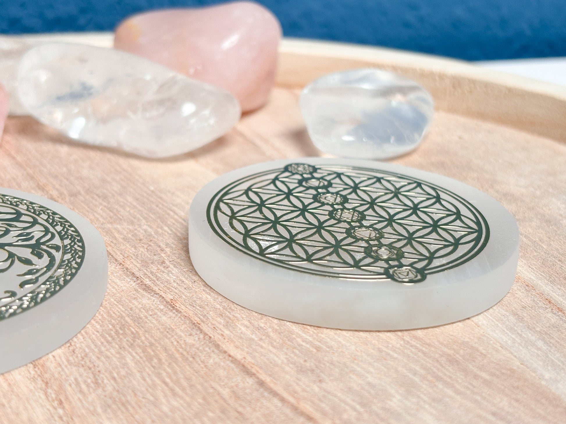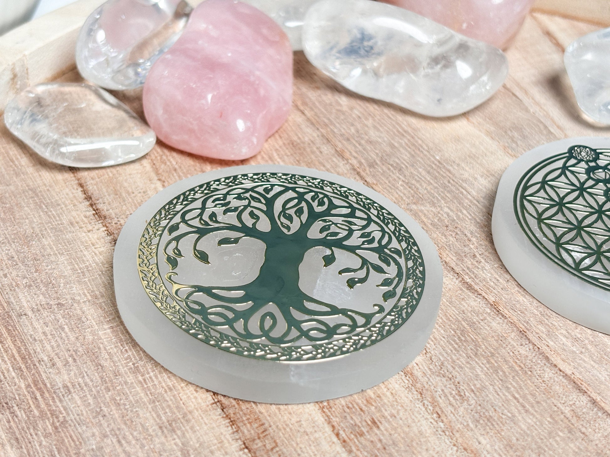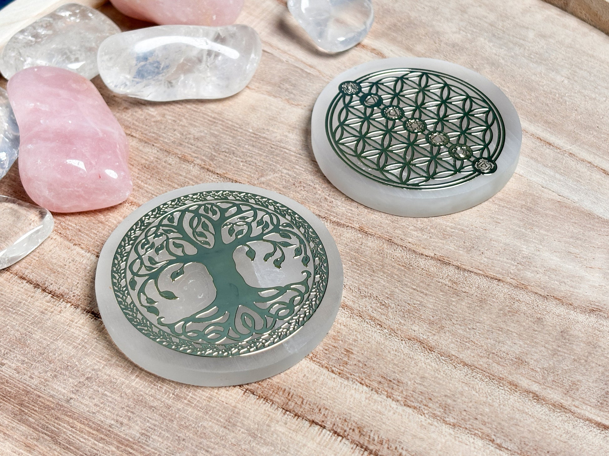 Selenite plates 8cm - Tree of Life & Flower of Life | Charge crystals | Decorative and spiritual | Etsy