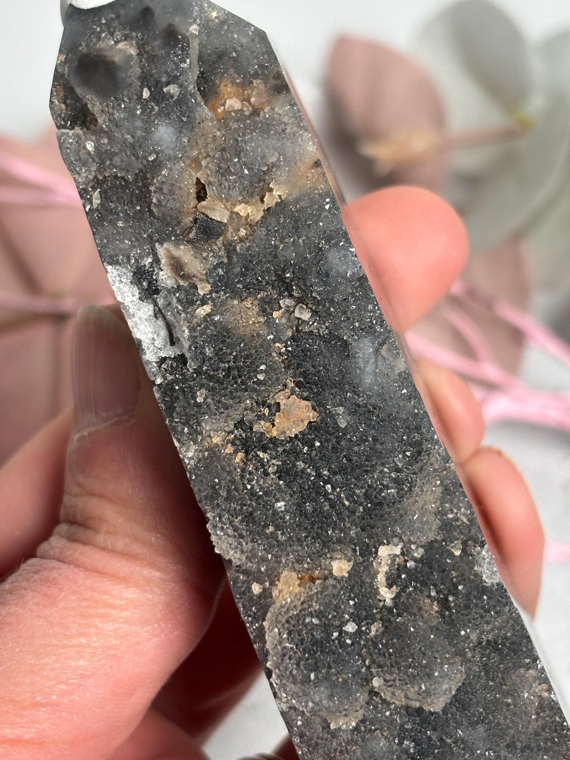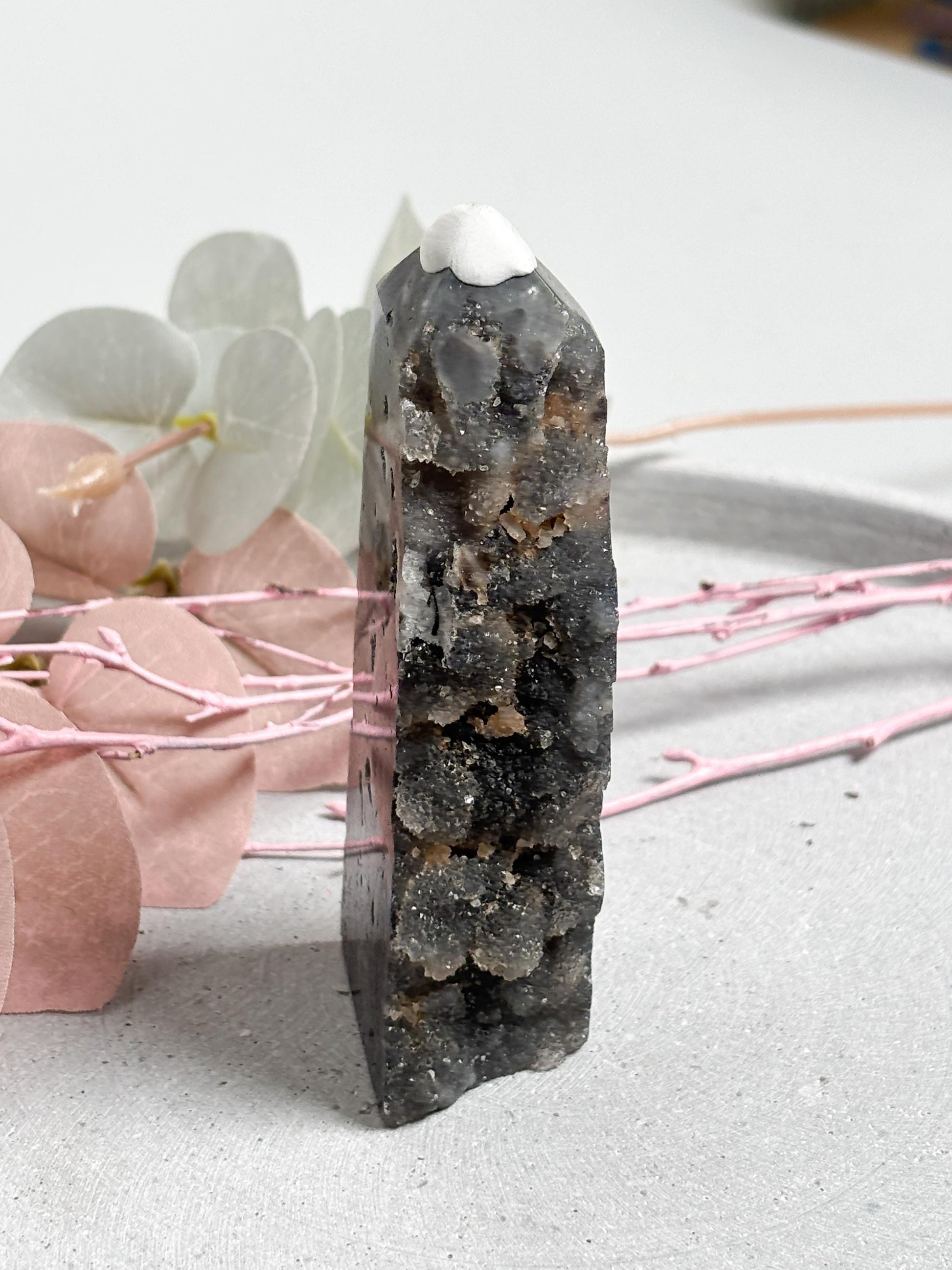 Dieser Sphalerit-Turm vereint natürliche Kraft mit faszinierender Struktur und ist ein echter Blickfang. Ideal als Dekostein, Meditationsobjekt oder harmonisches Element im Raum. Die glatte Vorderseite reflektiert Licht, während die drusige Rückseite Tiefe und Erdverbundenheit ausstrahlt – perfekt für dein Kristall- oder Altar-Setup.