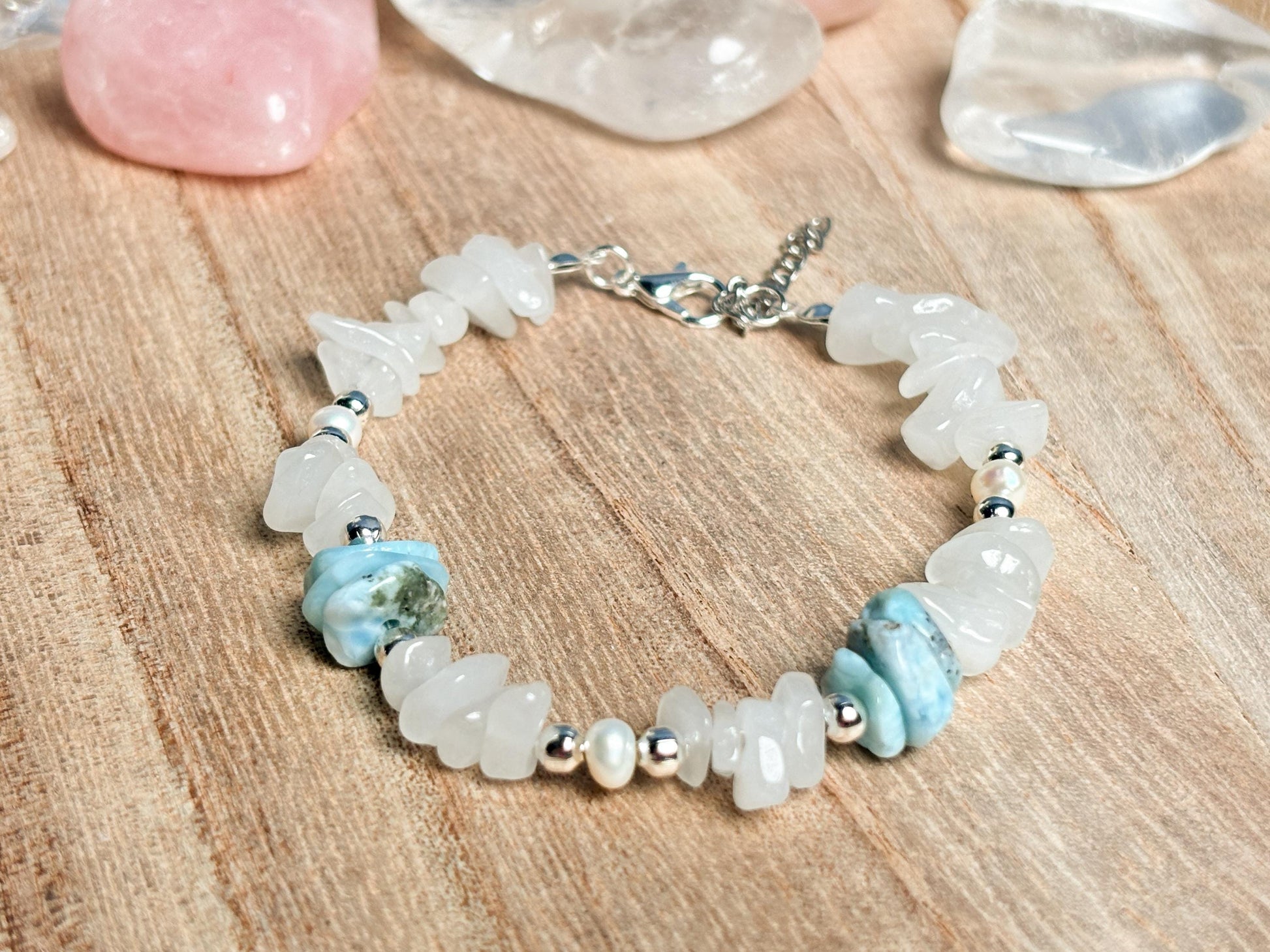 White Jade Chip Bracelet with Larimar & Freshwater Pearls - Elegant Gemstone Bracelet for Every Occasion
