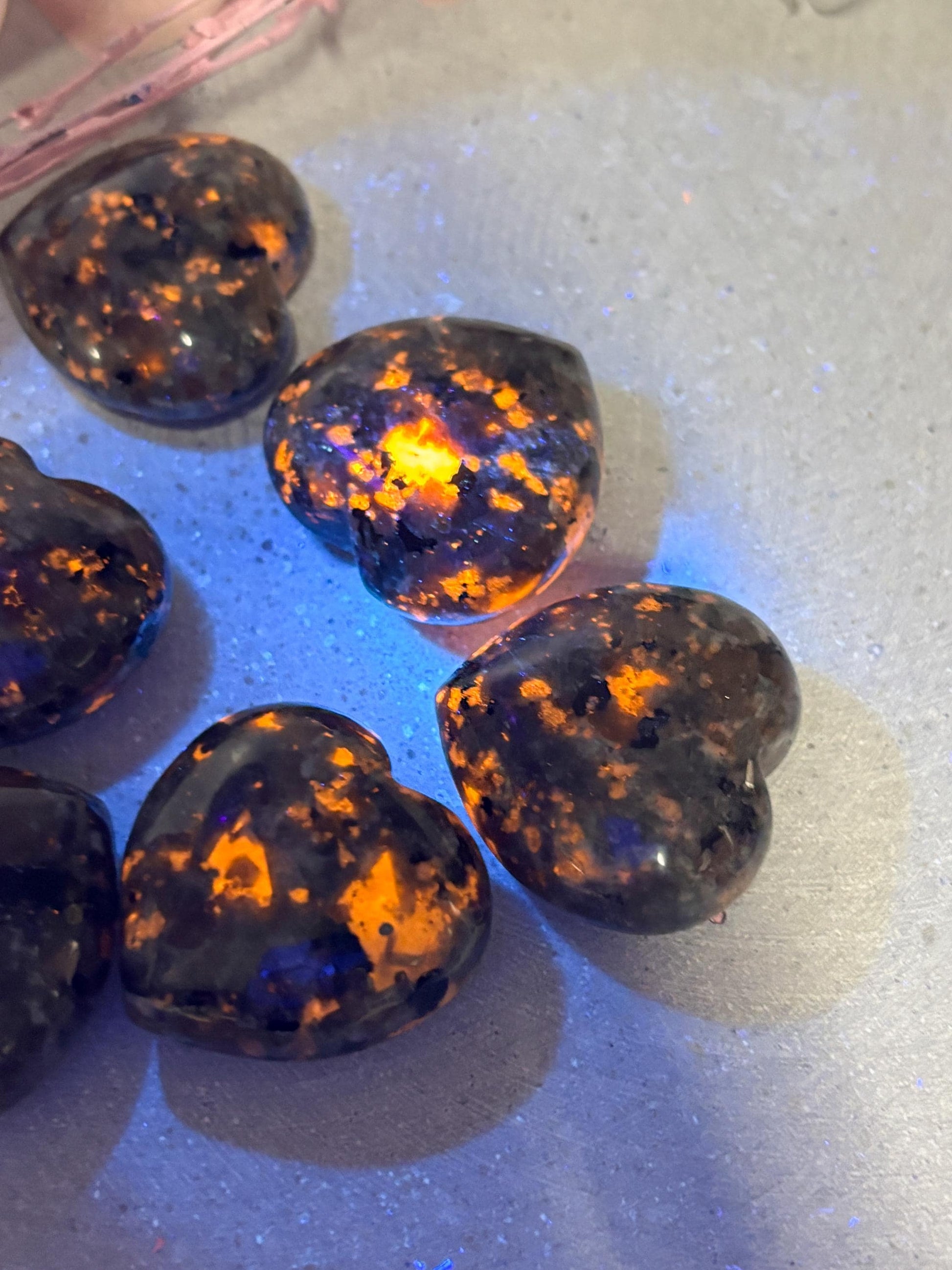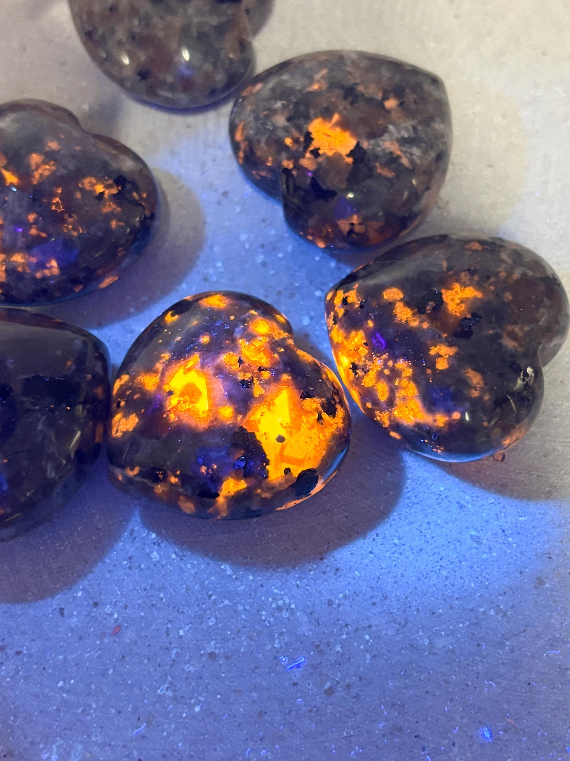 Dieses Yooperlite Herz zeigt unter UV- oder Schwarzlicht eine faszinierende Fluoreszenz in intensiven Orange- und Gelbtönen. Im normalen Licht erscheint der Stein in einem dezenten Grau-Blau.
