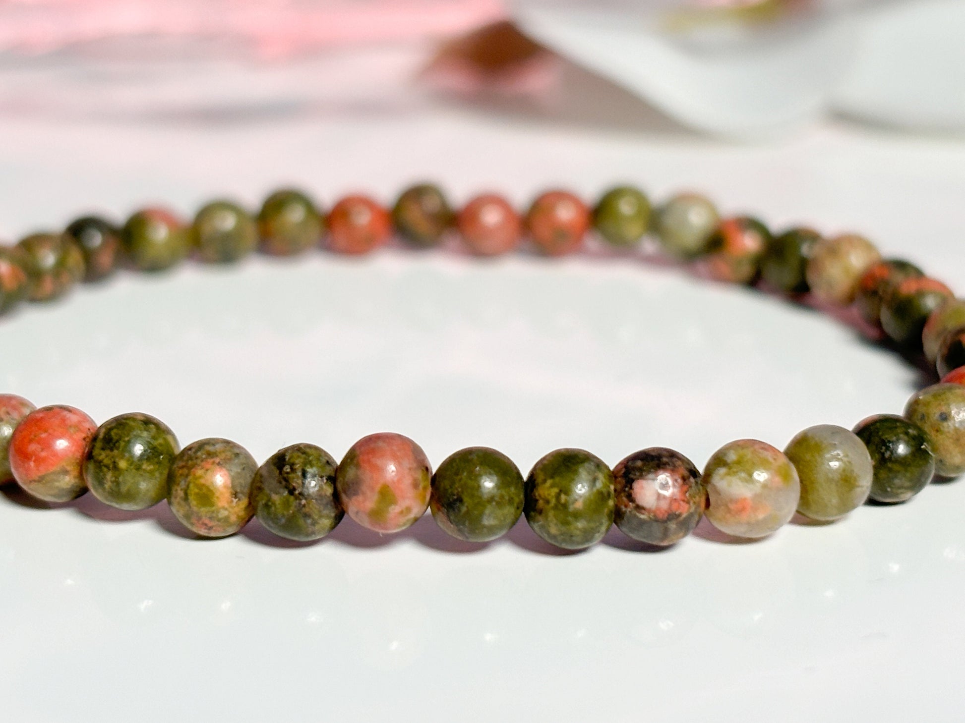The elastic design of the bracelet ensures a comfortable fit and makes it easy to put on and take off. The delicate 3mm unakite beads give the piece a delicate look that is both subtle and striking. It is the ideal everyday accessory that can be worn alone or combined with other bracelets.
