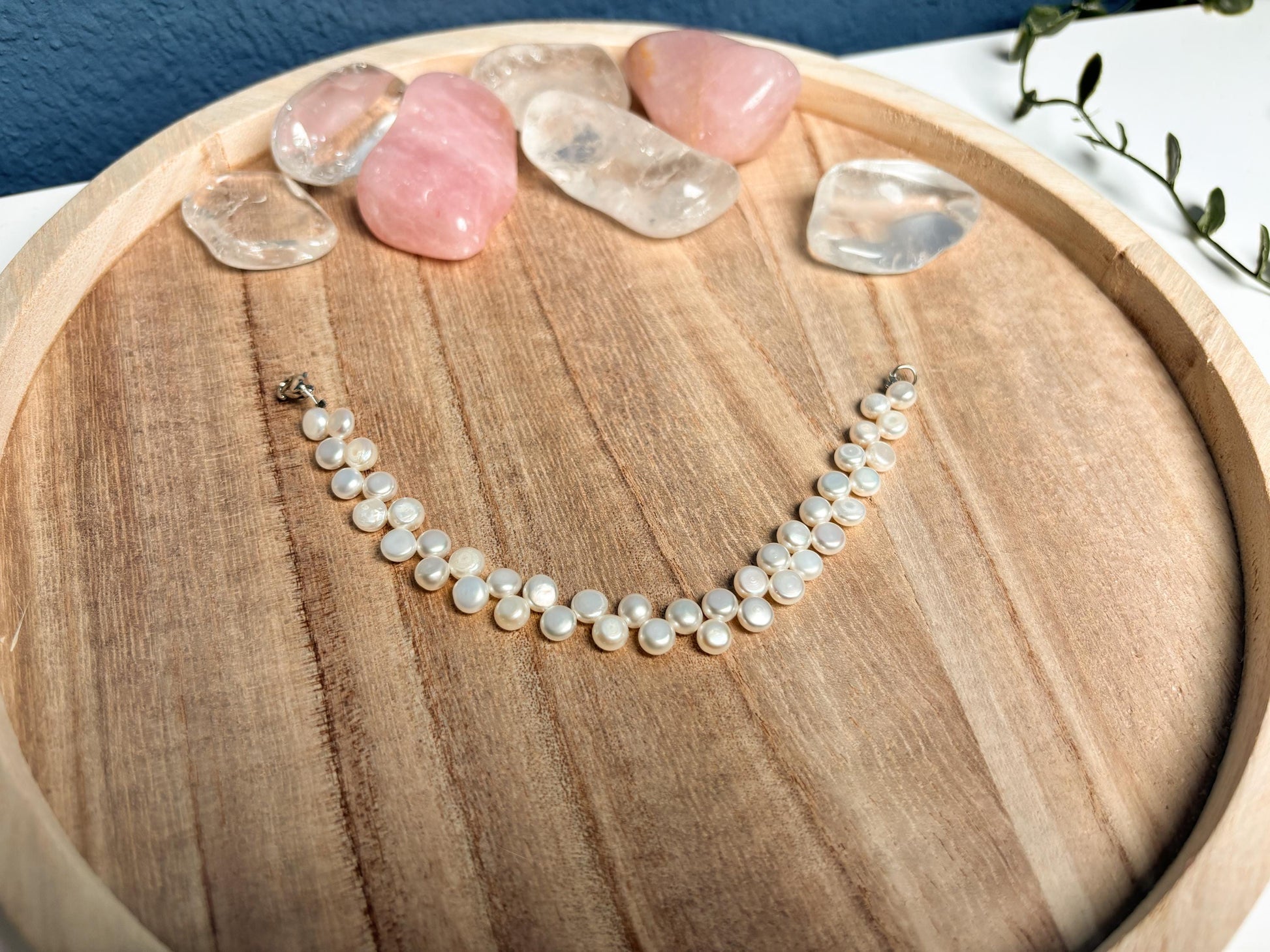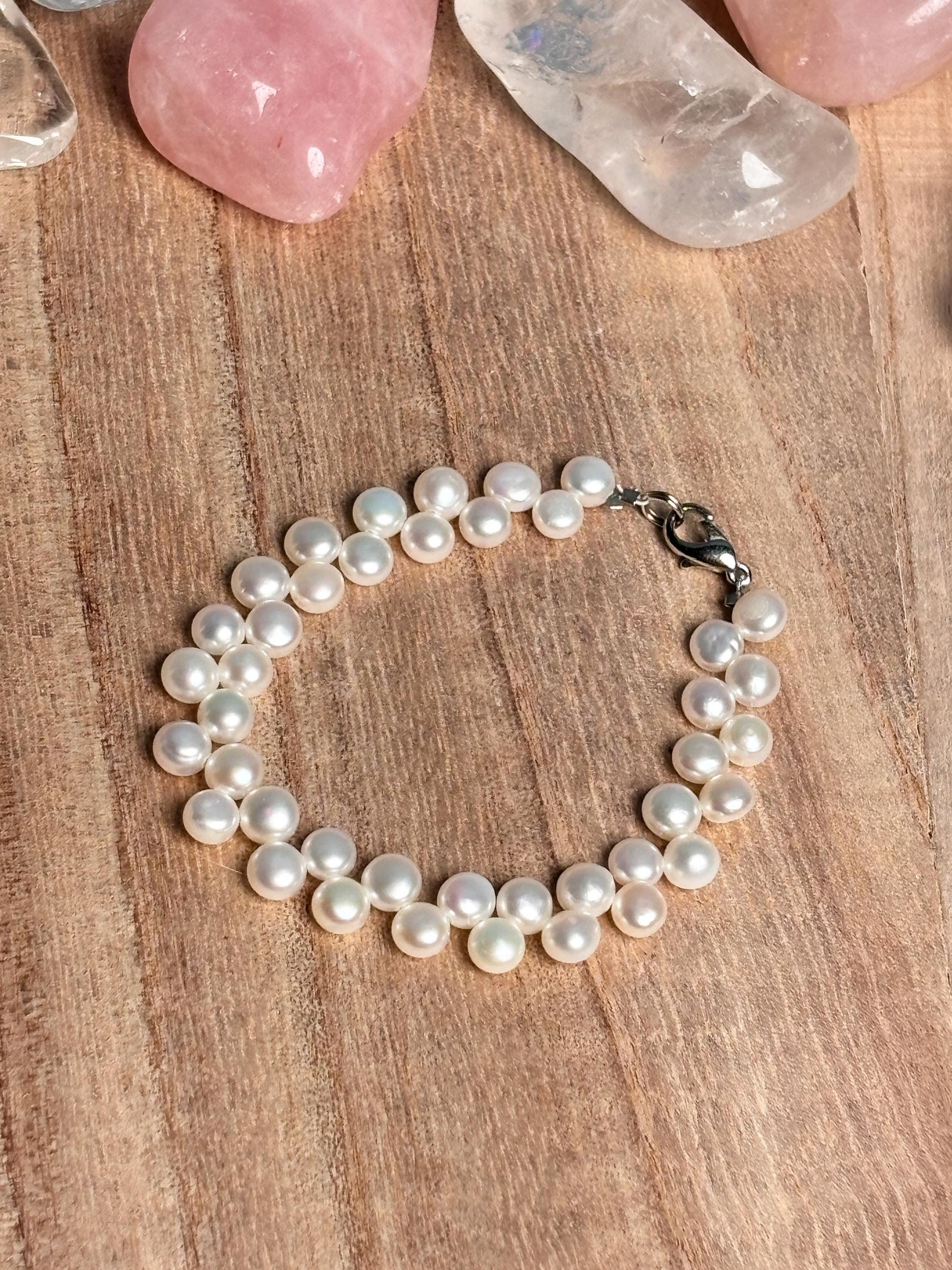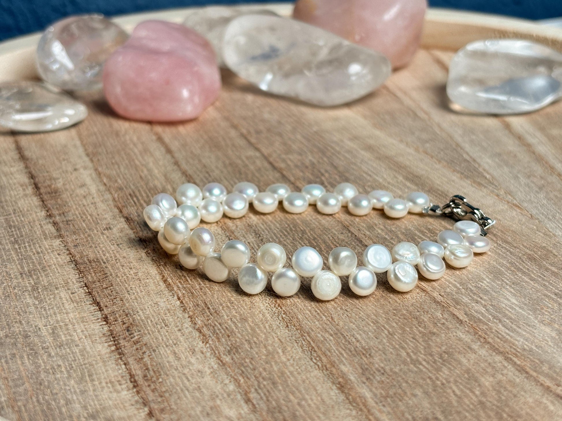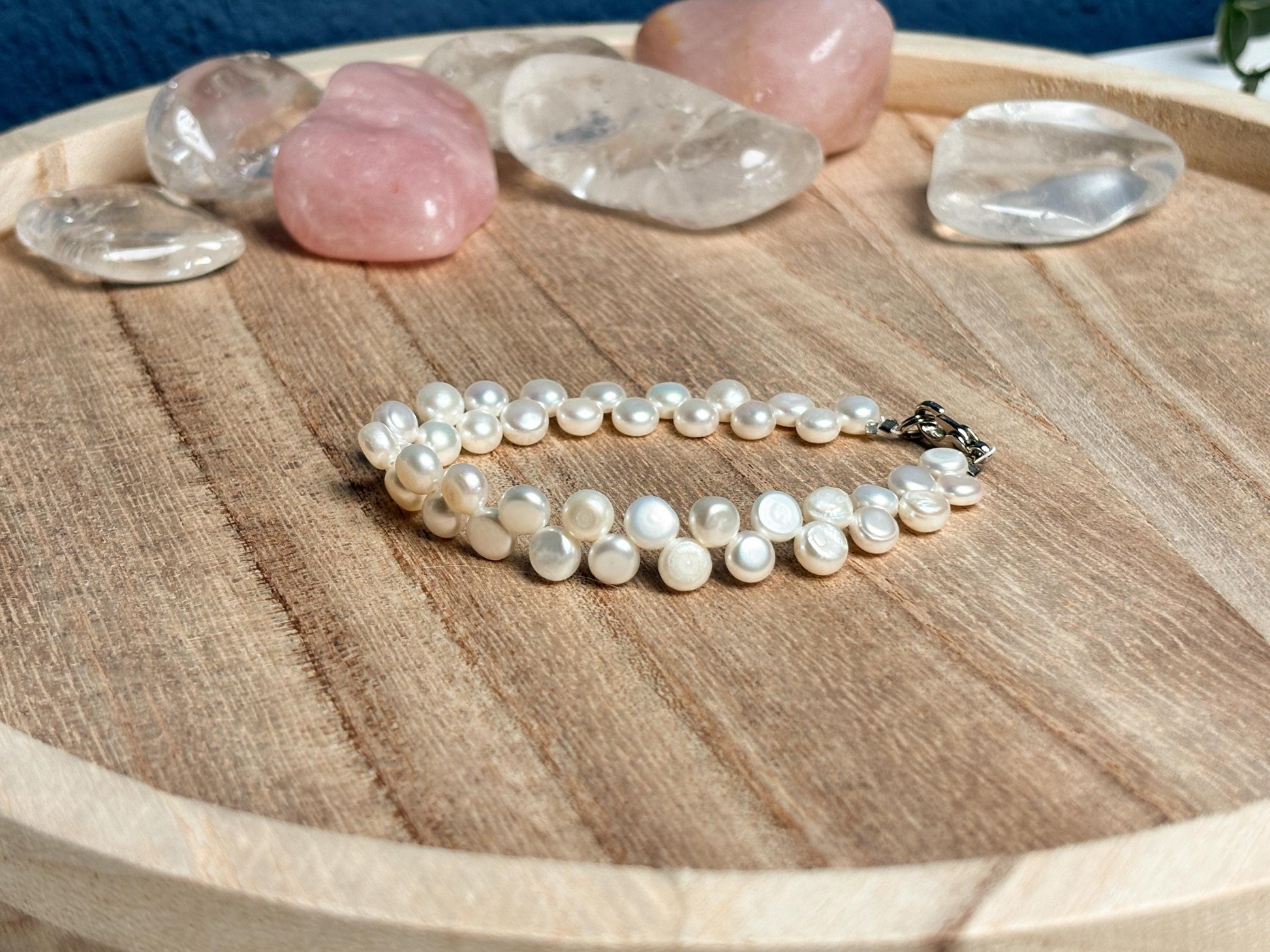**Wirkung und Bedeutung:** Perlen werden oft mit Reinheit, Weisheit und Schönheit assoziiert. Sie symbolisieren emotionale Balance und inneren Frieden und sind bekannt dafür, die eigene Intuition zu stärken. Tragen Sie dieses Perlenarmband, um Eleganz auszustrahlen und gleichzeitig von den beruhigenden Eigenschaften der Perlen zu profitieren.