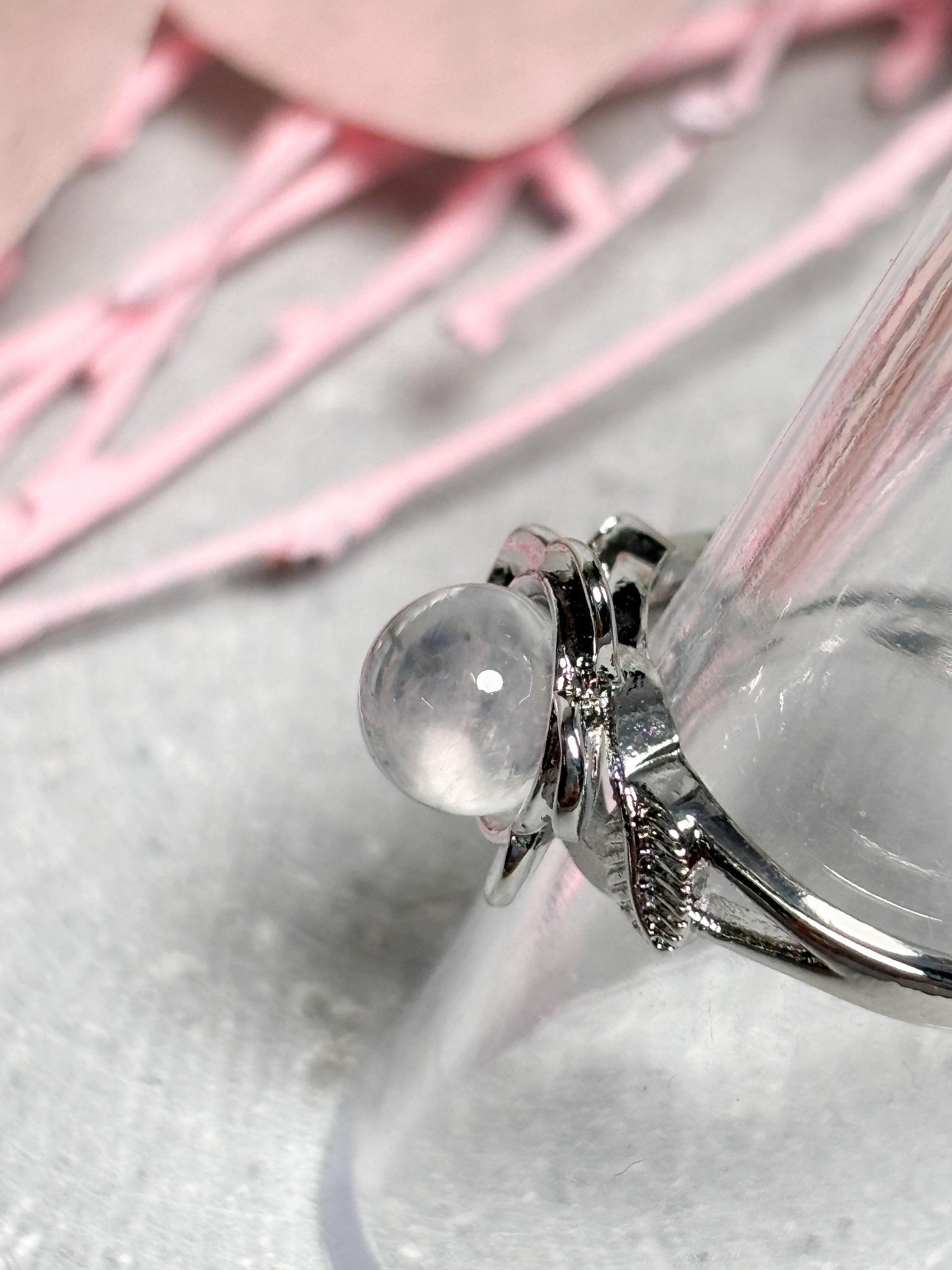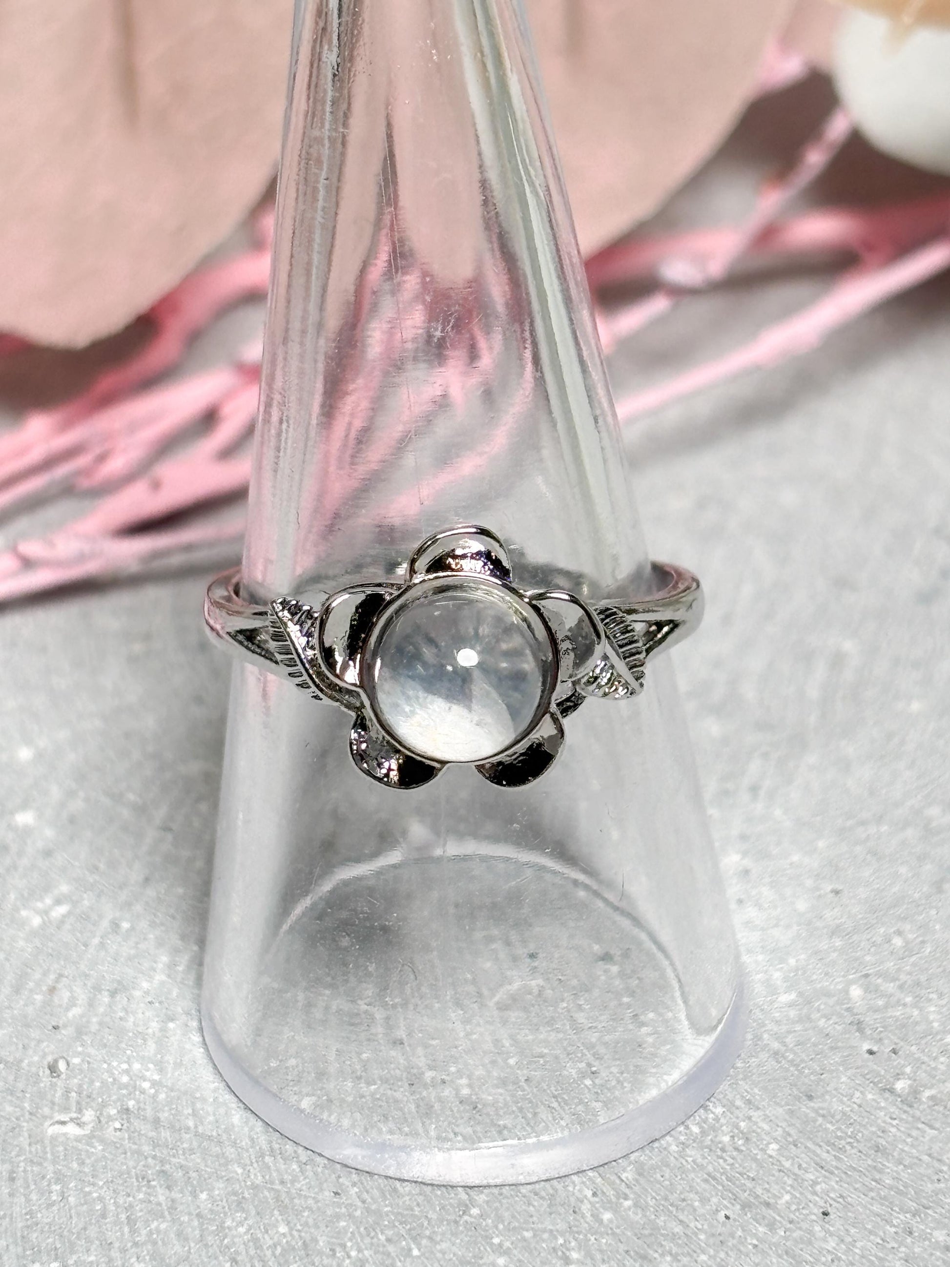 Edelstahl Ring Silber größenverstellbarer Ring mit Blumendesign und Bergkristall Perle, Kristall Schmuck, Flower Design Ring