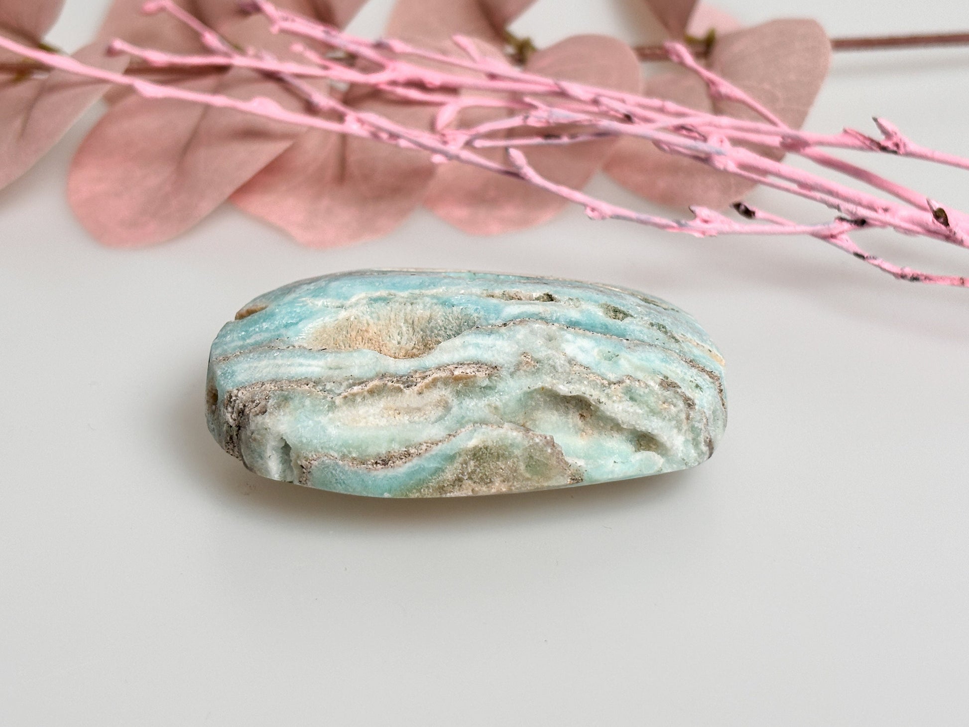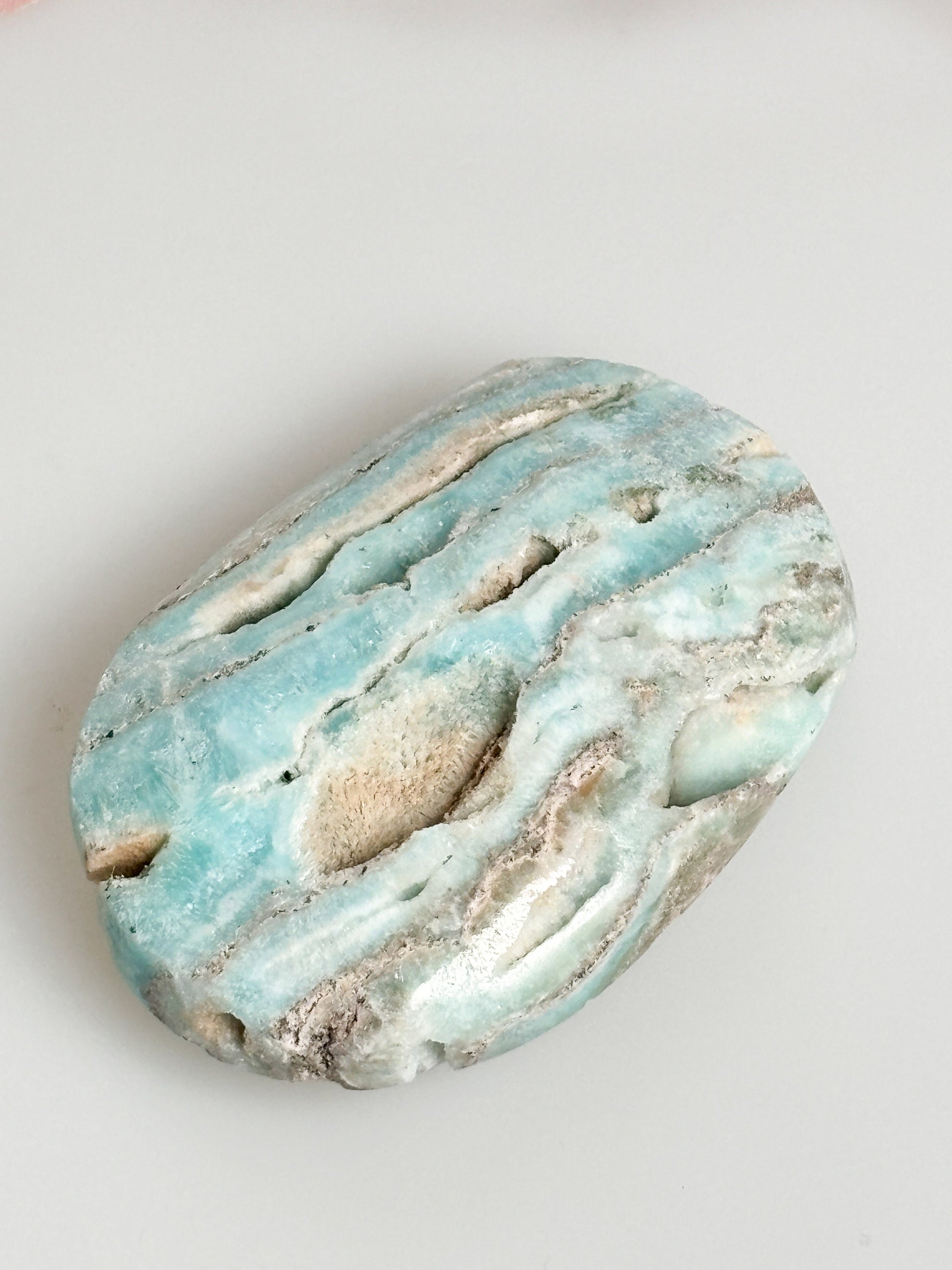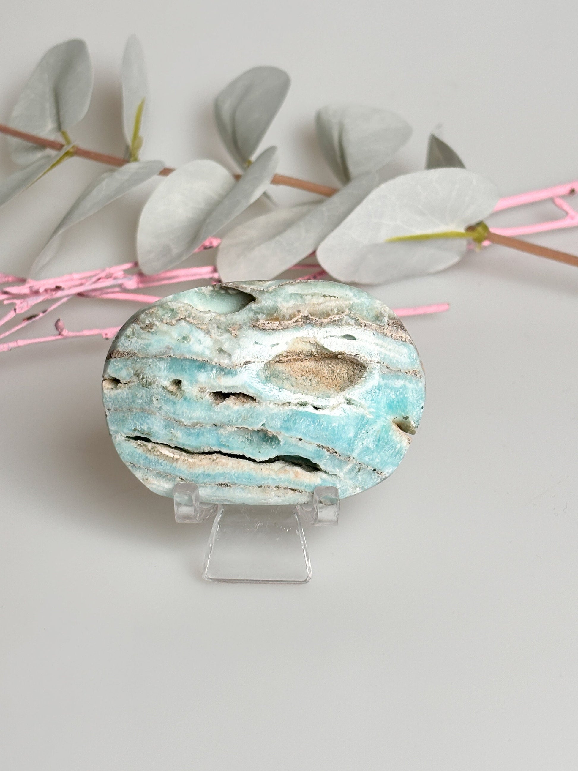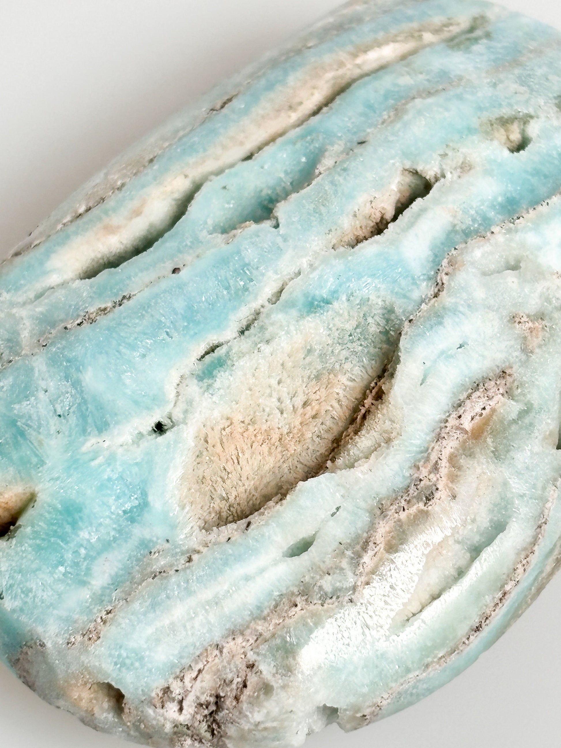 Caribbean Calcite, auch bekannt als Ocean Blue Calcite, ist eine Mischung aus blauem Calcit und weißem Calcit, die oft mit braunen Aragonitadern durchzogen ist. Diese Kombination von Farben und Texturen verleiht dem Stein eine erstaunliche visuelle Tiefe und ein faszinierendes Aussehen, das ihn zu einem Blickfang in jeder Sammlung macht.