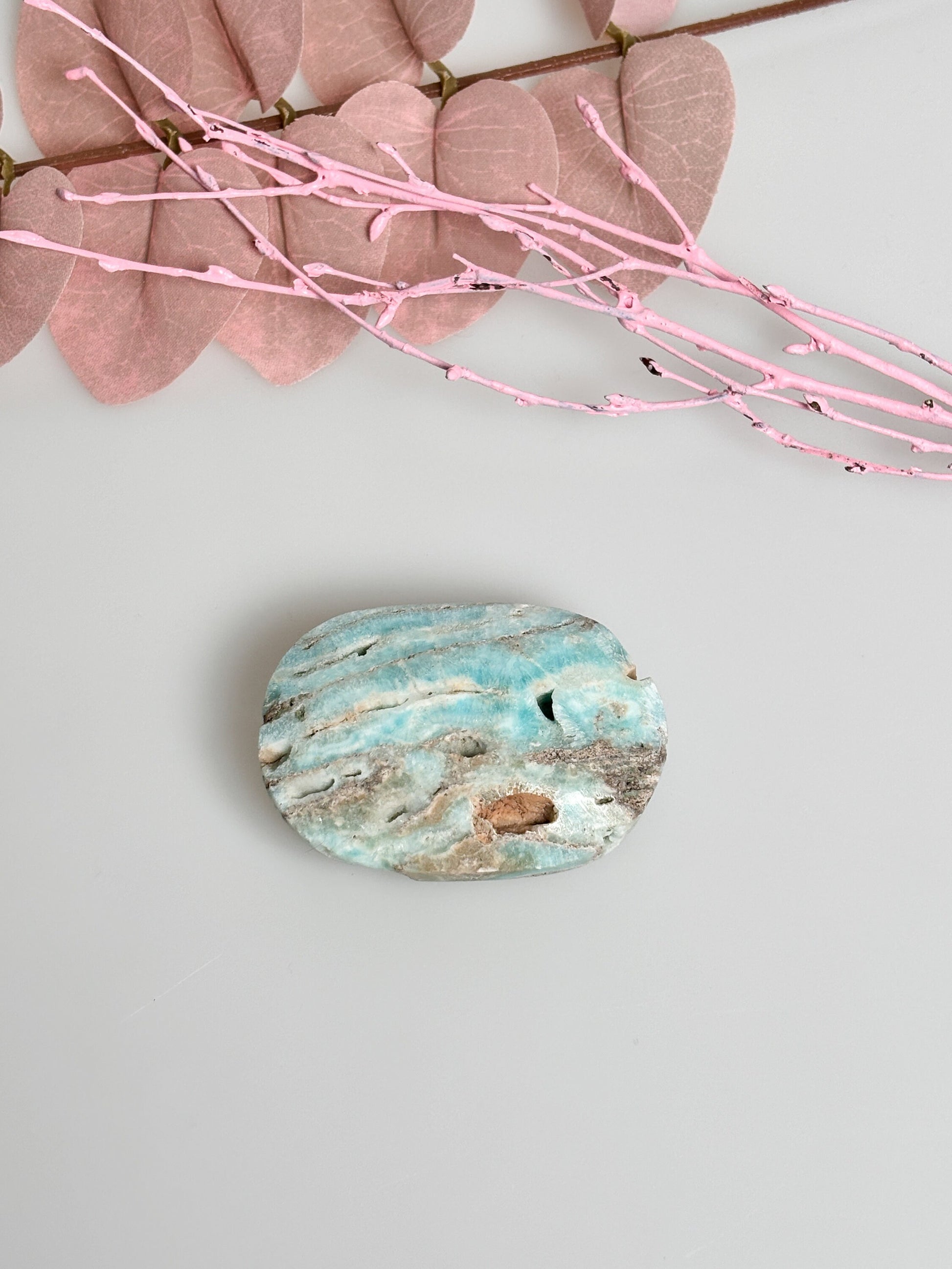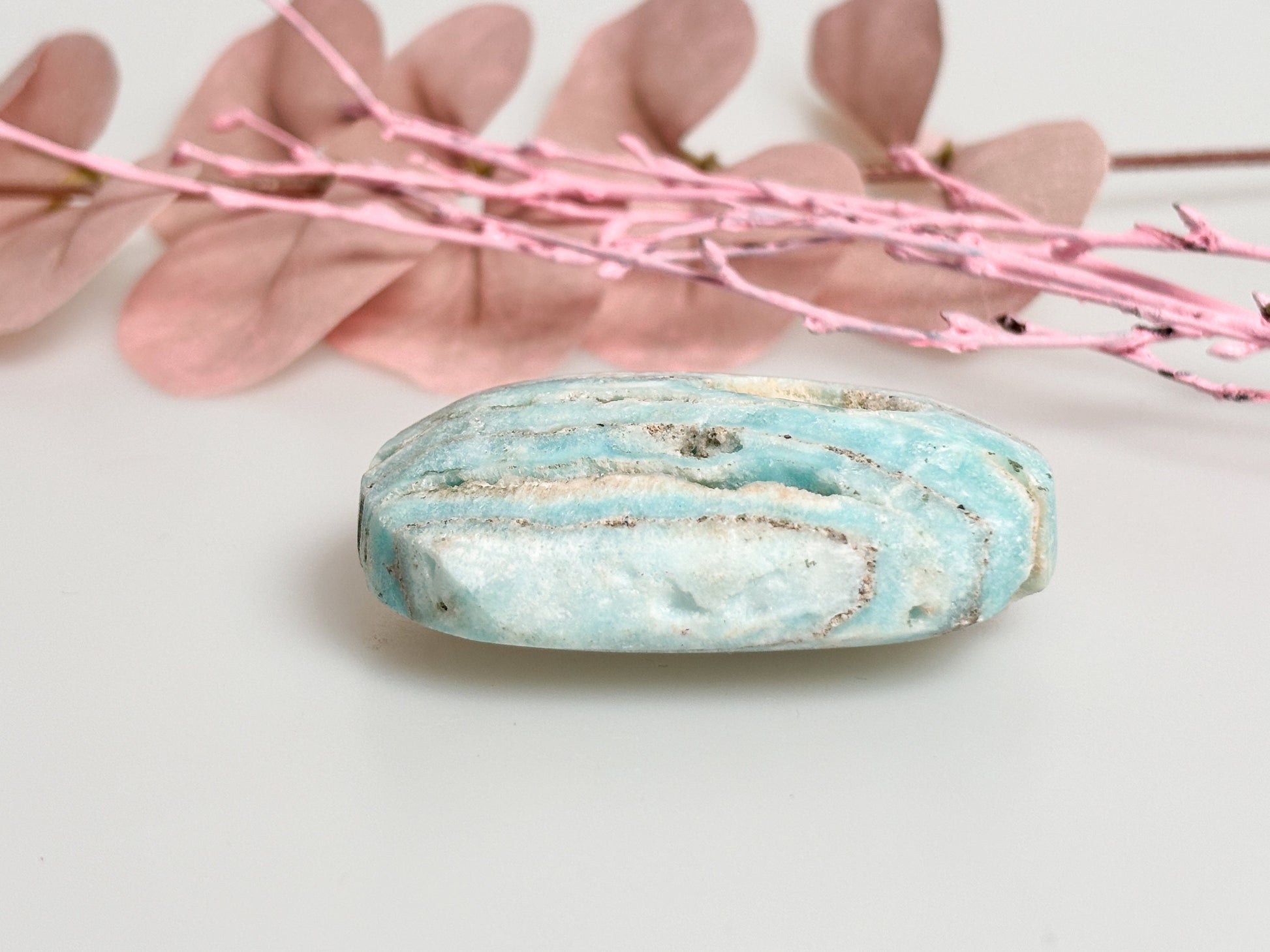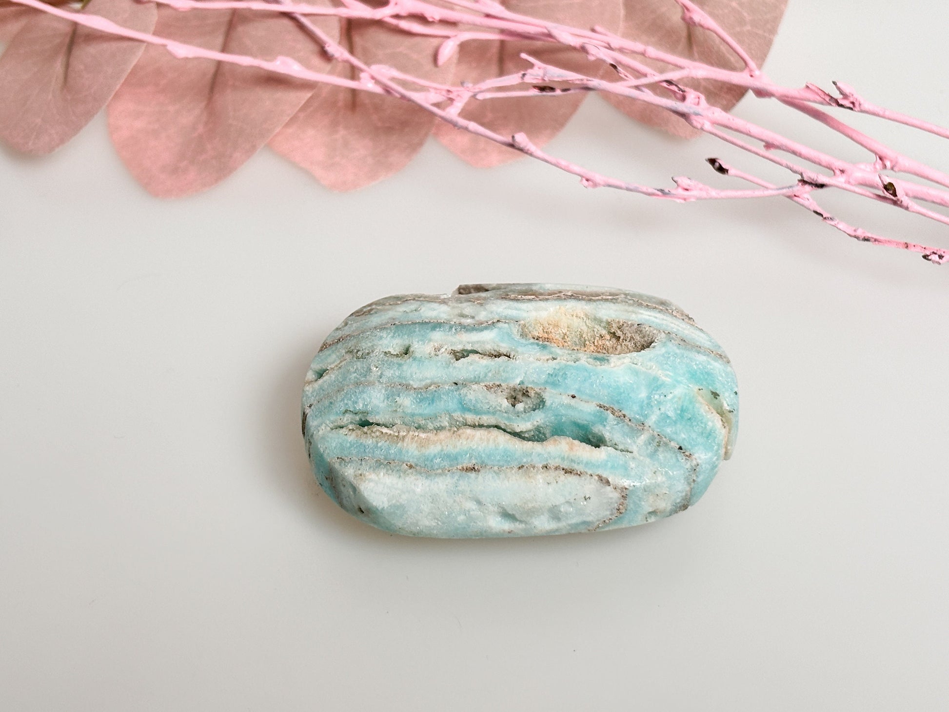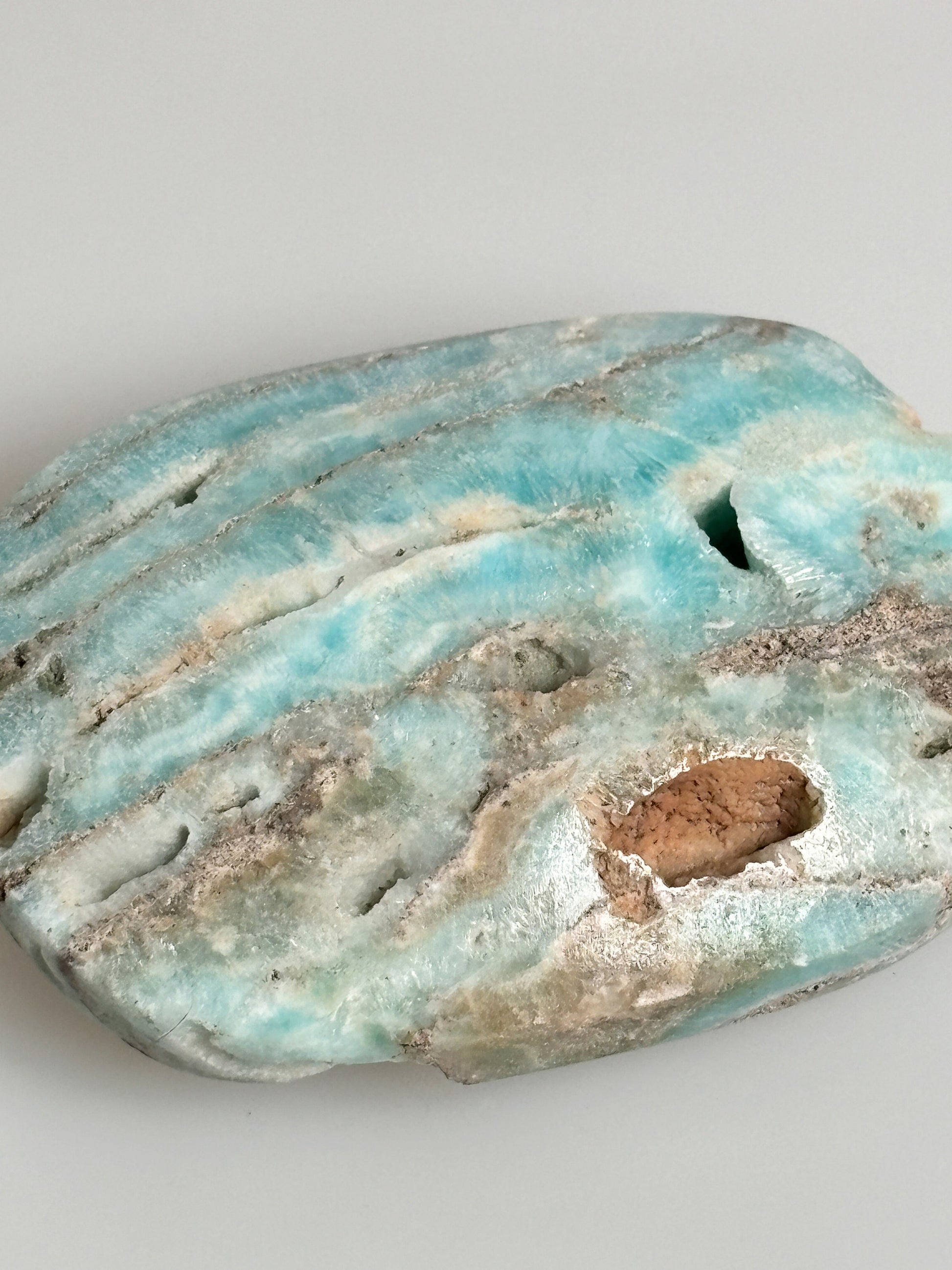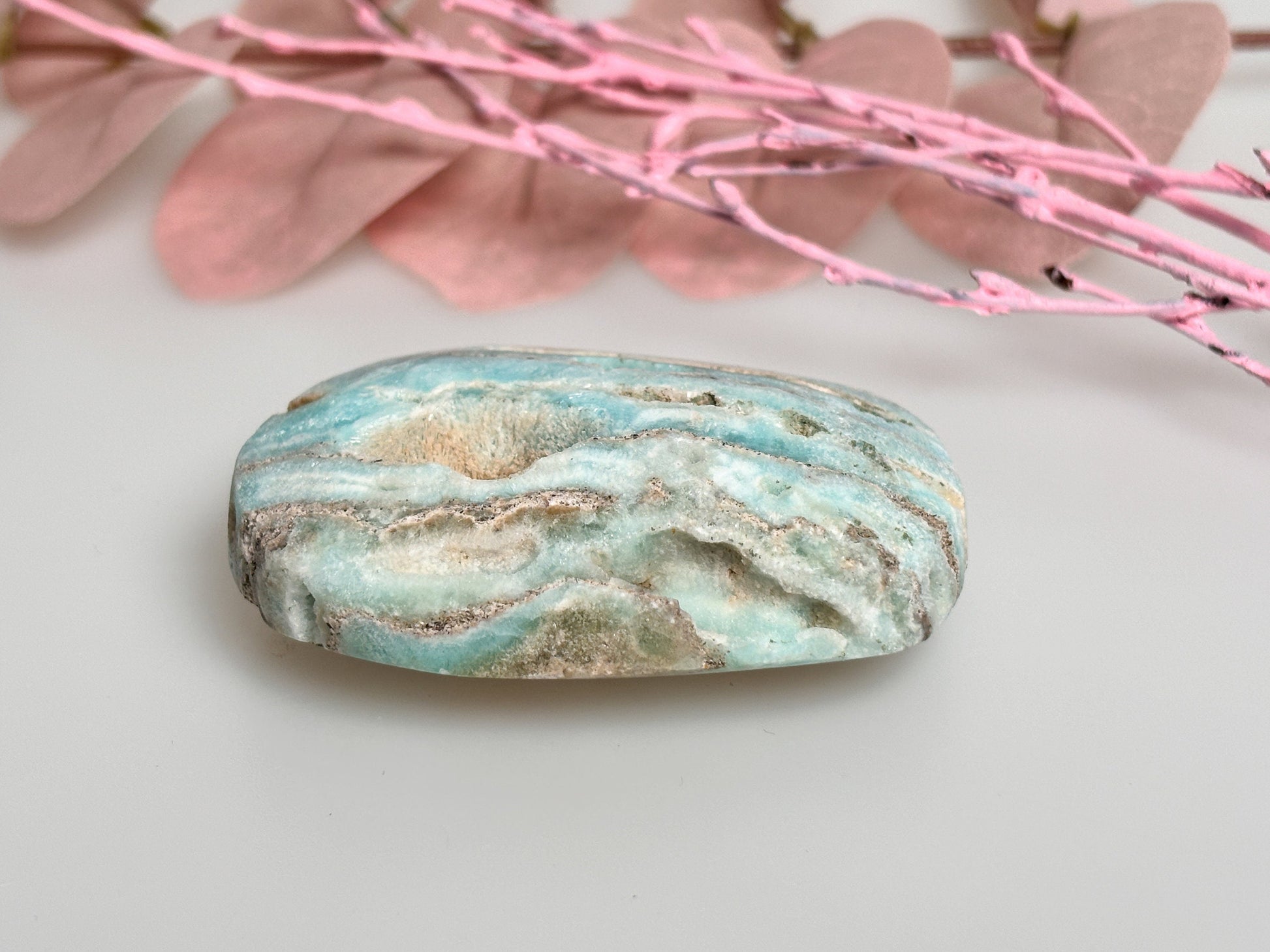 Caribbean Calcite, auch bekannt als Ocean Blue Calcite, ist eine Mischung aus blauem Calcit und weißem Calcit, die oft mit braunen Aragonitadern durchzogen ist. Diese Kombination von Farben und Texturen verleiht dem Stein eine erstaunliche visuelle Tiefe und ein faszinierendes Aussehen, das ihn zu einem Blickfang in jeder Sammlung macht.