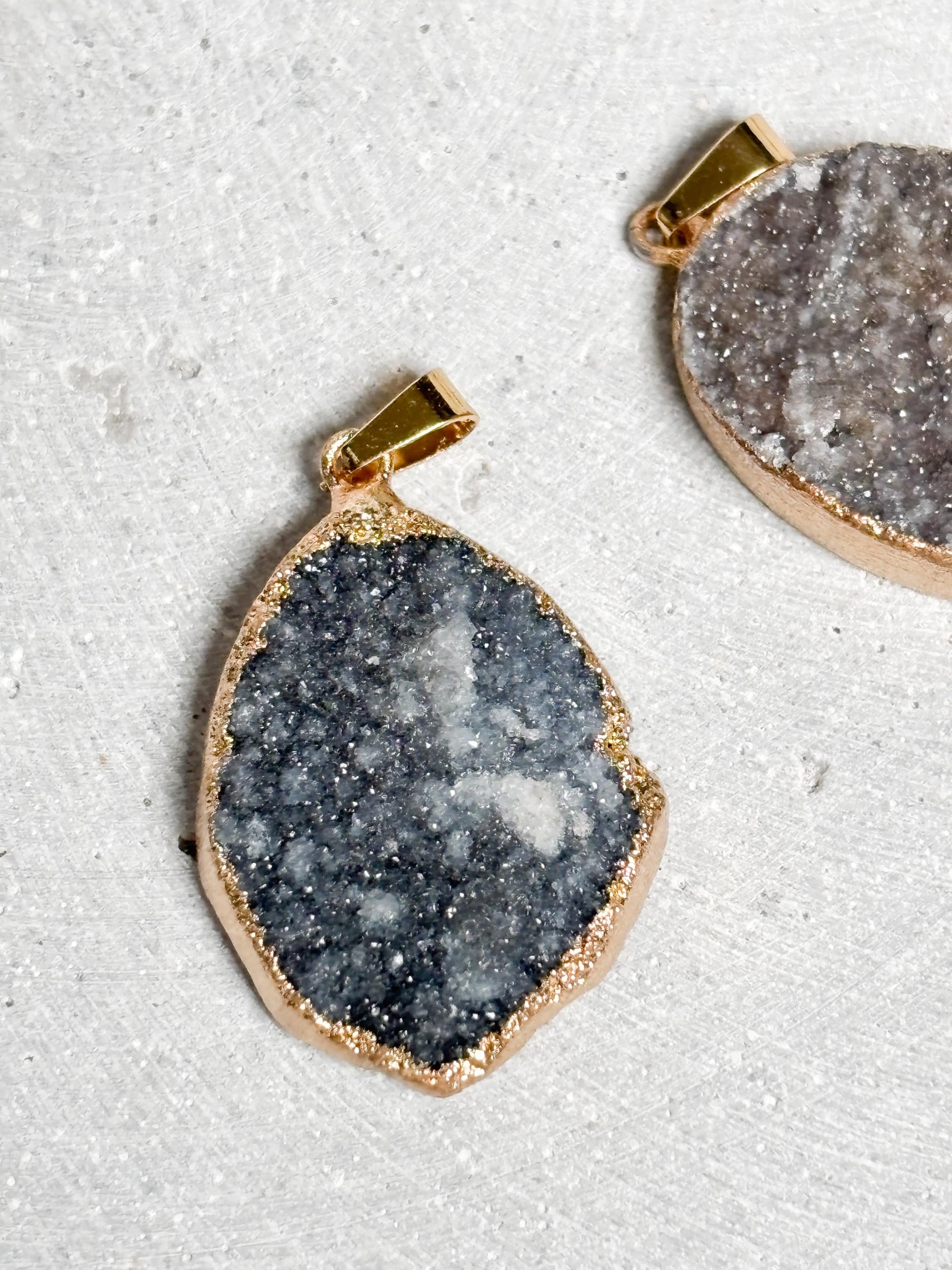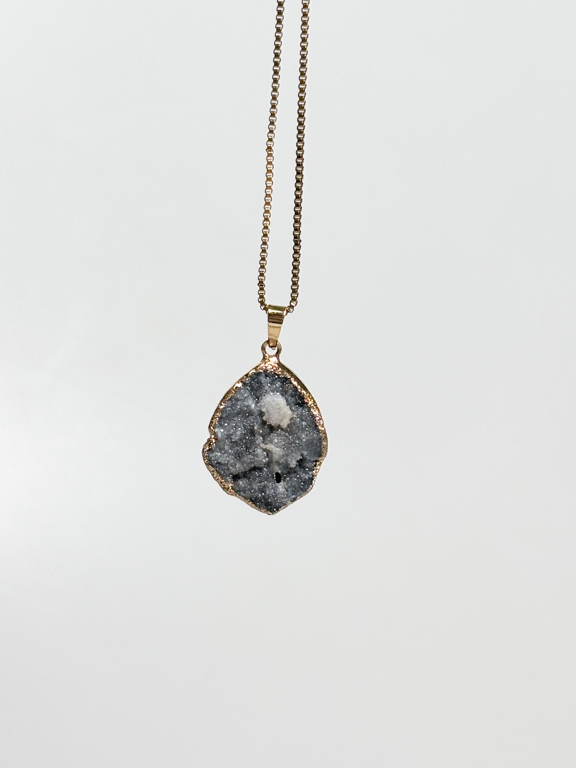 Graue Drusen verbinden Erdung und Eleganz – sie stehen für Ausgeglichenheit, Schutz und Stabilität. Ihr glitzernder Kristallkern erinnert an innere Stärke und Ruhe. Die feinen, schimmernden Kristalle sollen helfen, Stress zu lösen und Gelassenheit zu fördern. In Kombination mit der goldfarbenen Fassung entsteht ein stilvoller Anhänger mit natürlichem Glanz und harmonischer Energie – dezent und doch besonders.