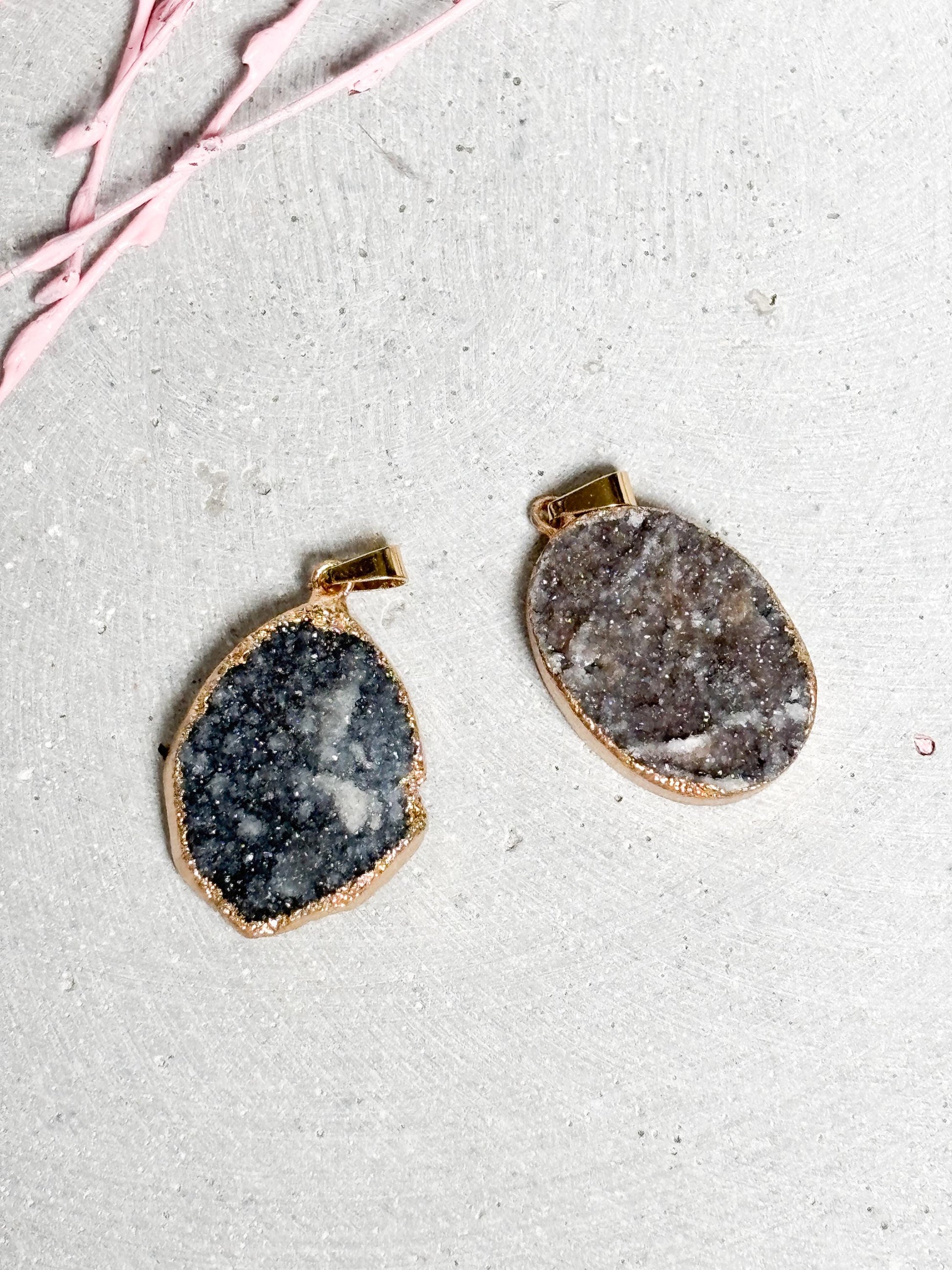 Grauer Drusen Anhänger ovaler Kristall Kettenanhänger ca. 2,5 cm, Geode mit goldfarbener Fassung, Edelstein Schmuck, Naturstein Anhänger