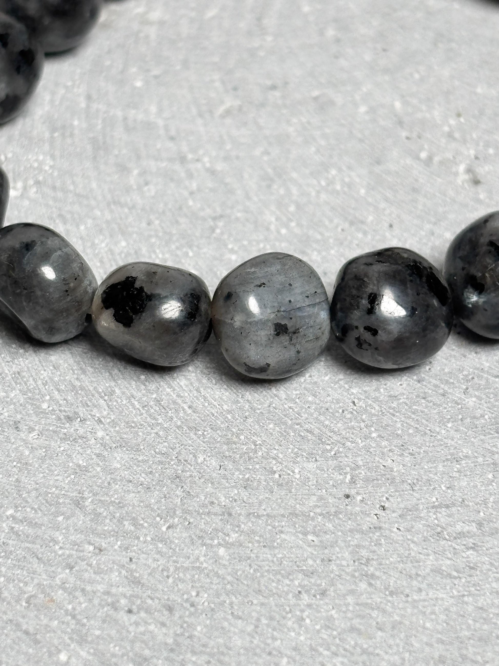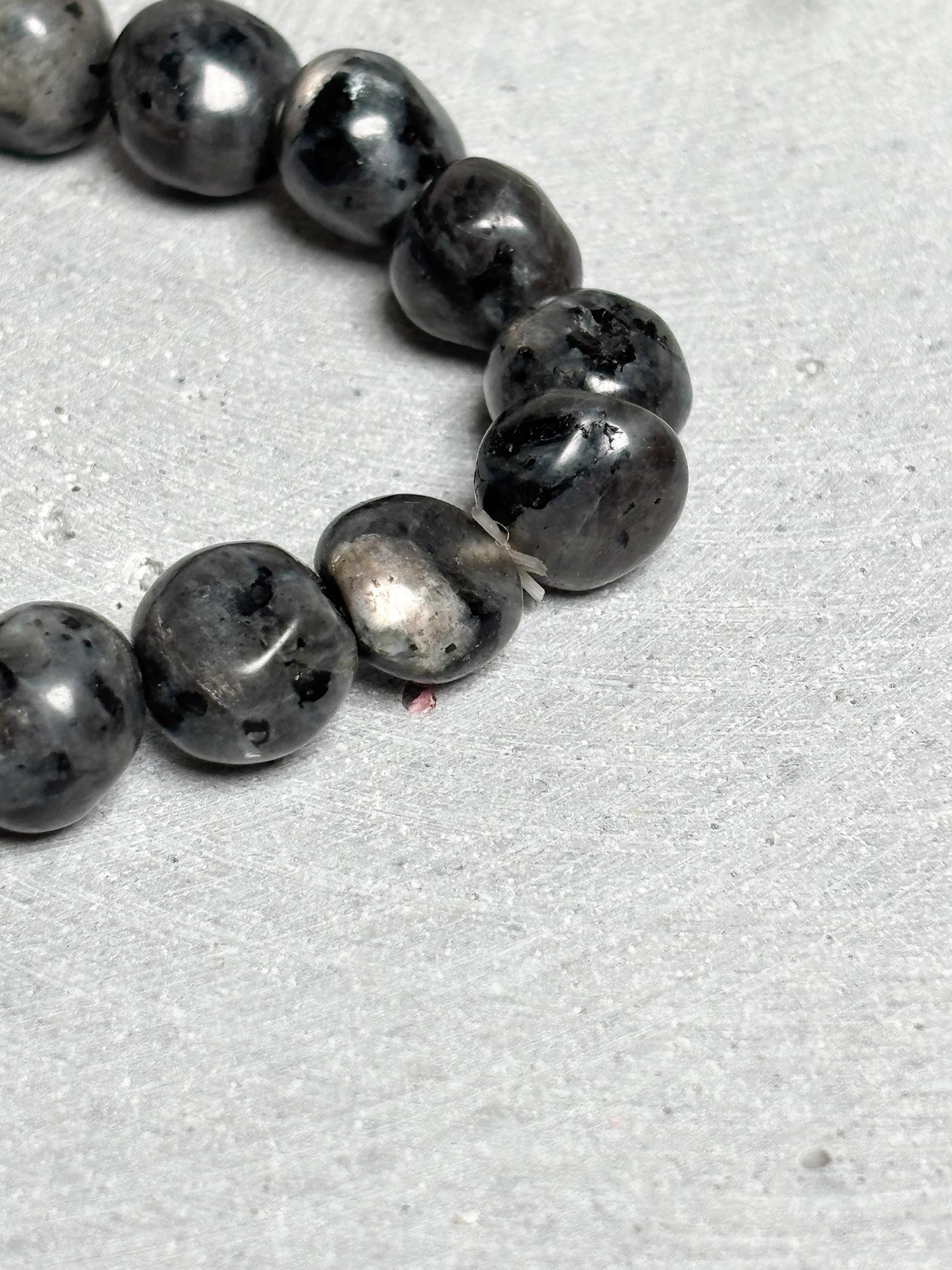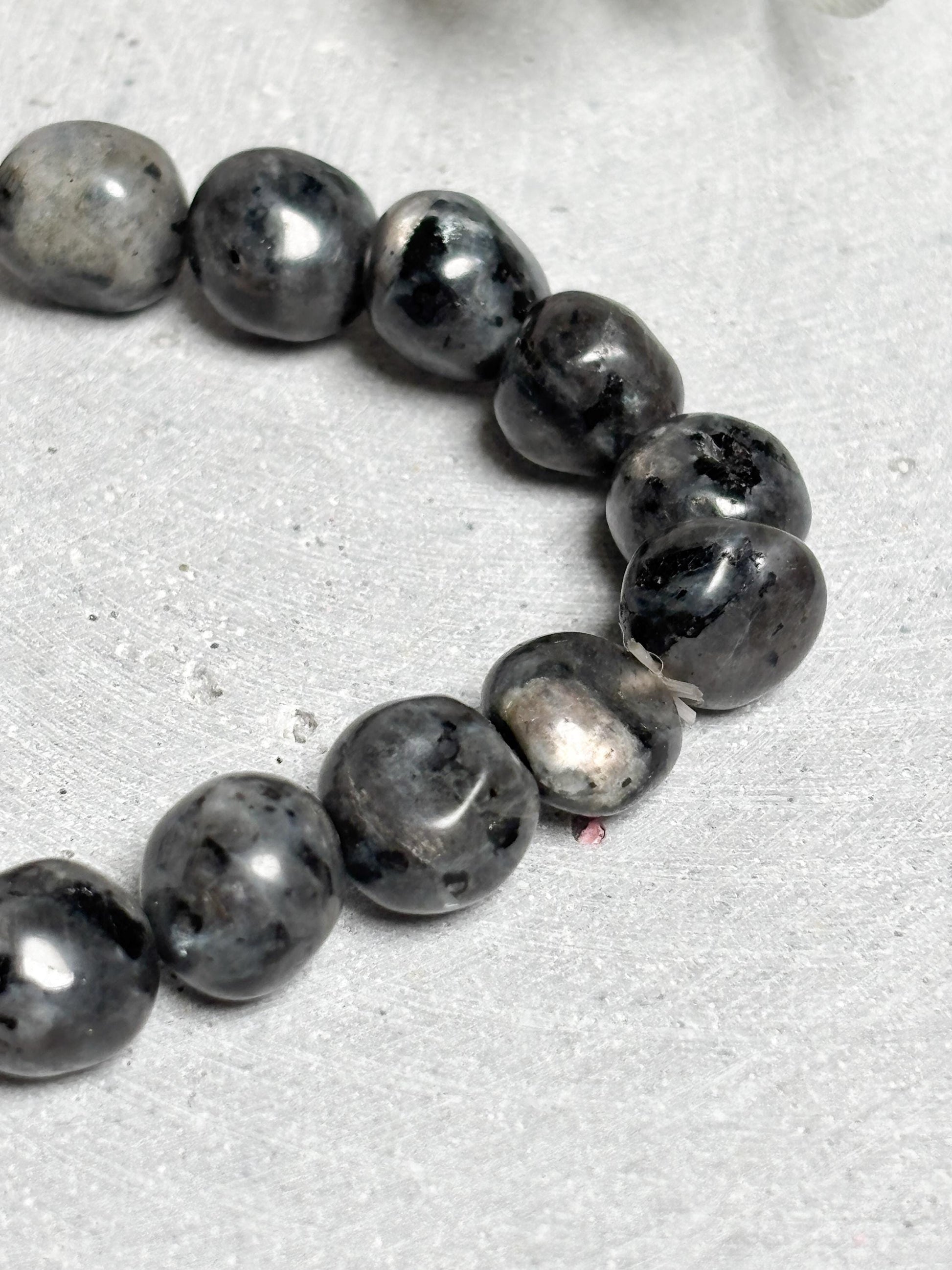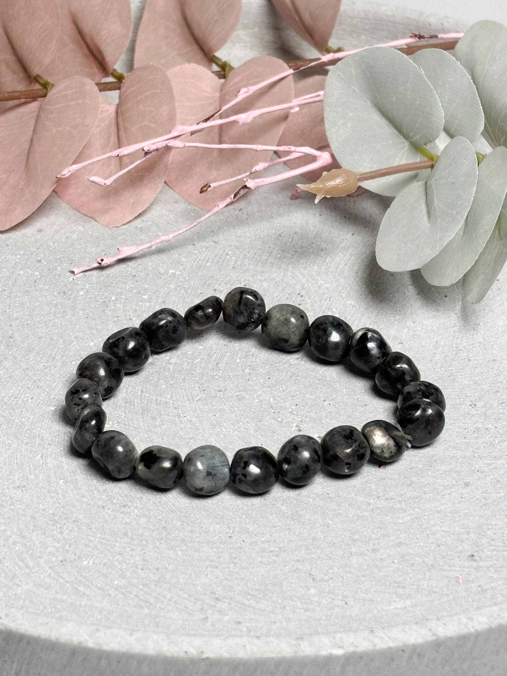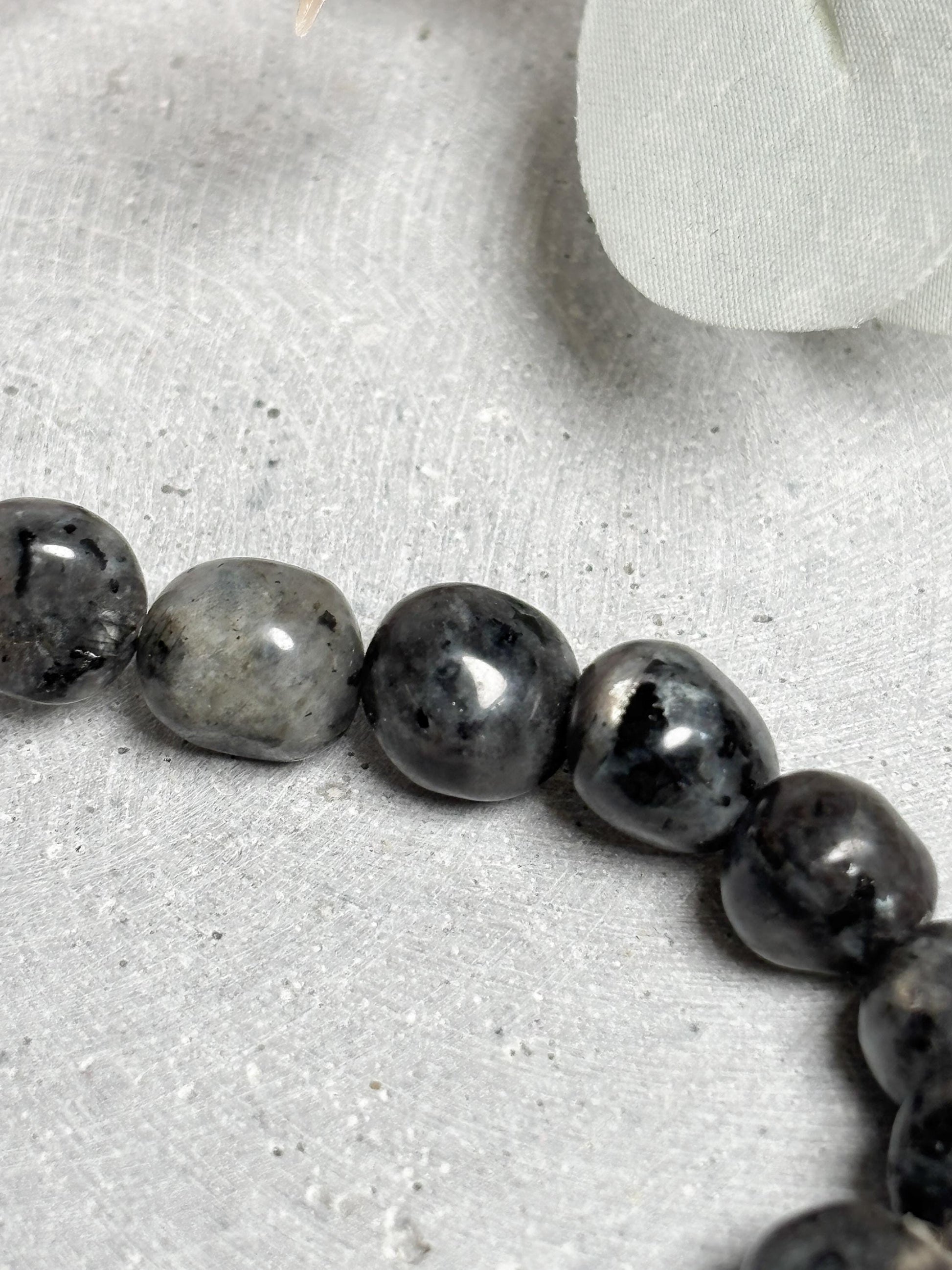 Das Larvikit-Armband ist ein eleganter Begleiter für Alltag und besondere Momente. Es lässt sich wunderbar mit silberfarbenem Schmuck kombinieren und harmoniert mit klaren, neutralen Tönen. Ideal auch für Meditation oder Energiearbeit – Larvikit wirkt ausgleichend und stärkt die innere Stabilität.