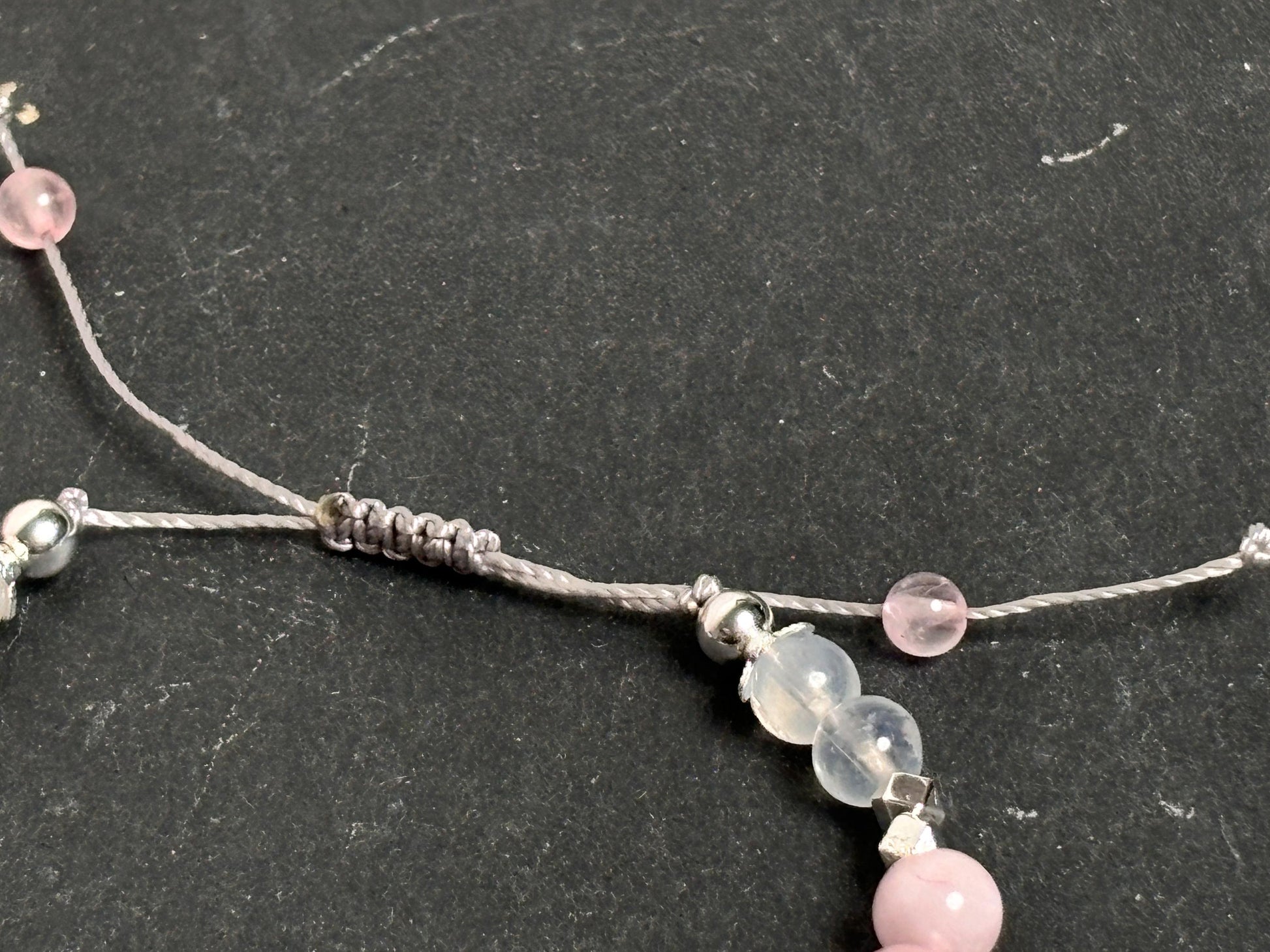 Materialien: 6mm Edelsteinperlen (Rosenquarz, Labradorit, Mondstein), Edelstahl-Zwischenteile, Makrameeband