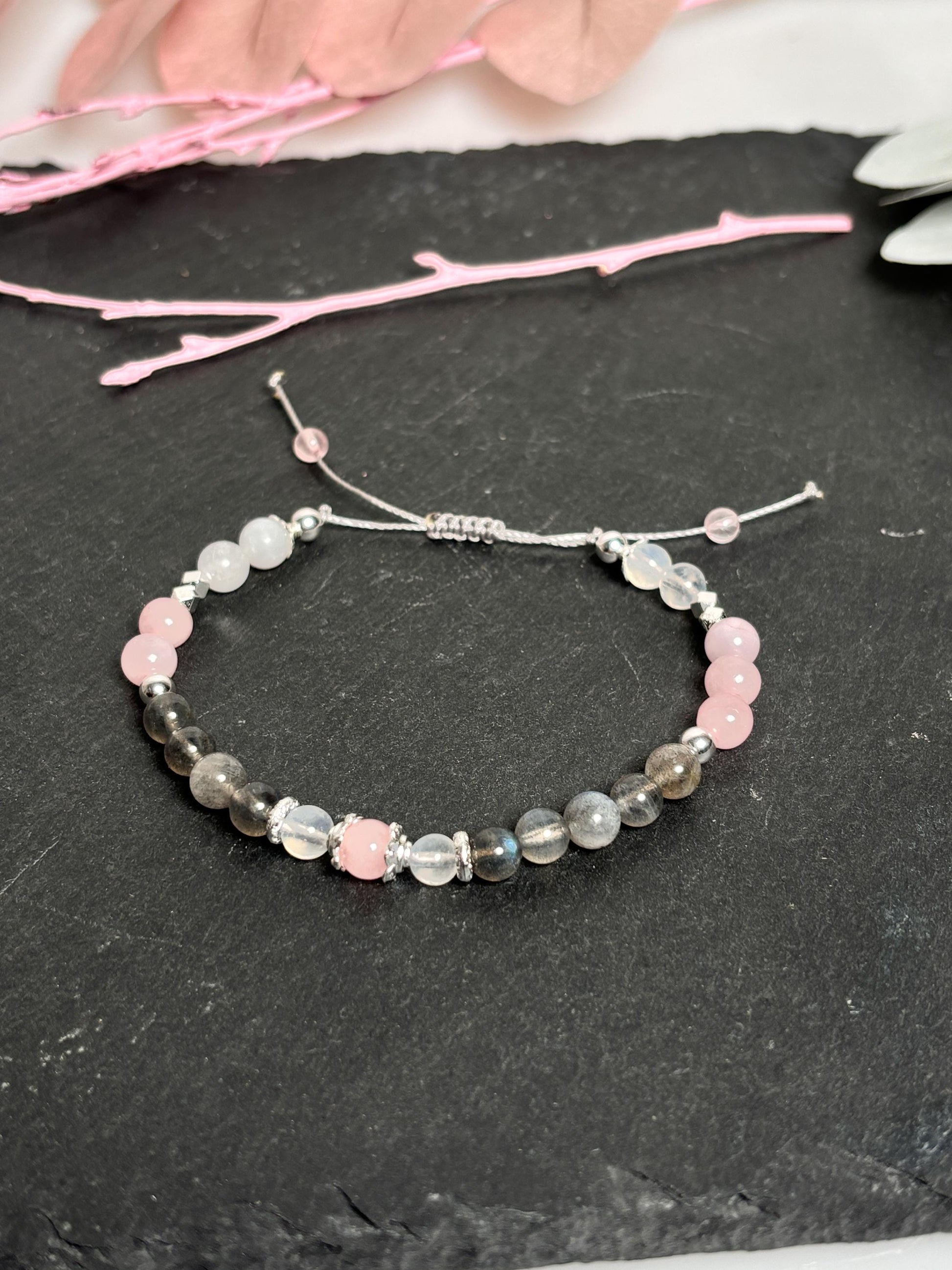Makramee Armband mit Rosenquarz, Labradorit & Mondstein Handgefertigtes Schmuckstück mit 6mm Perlen