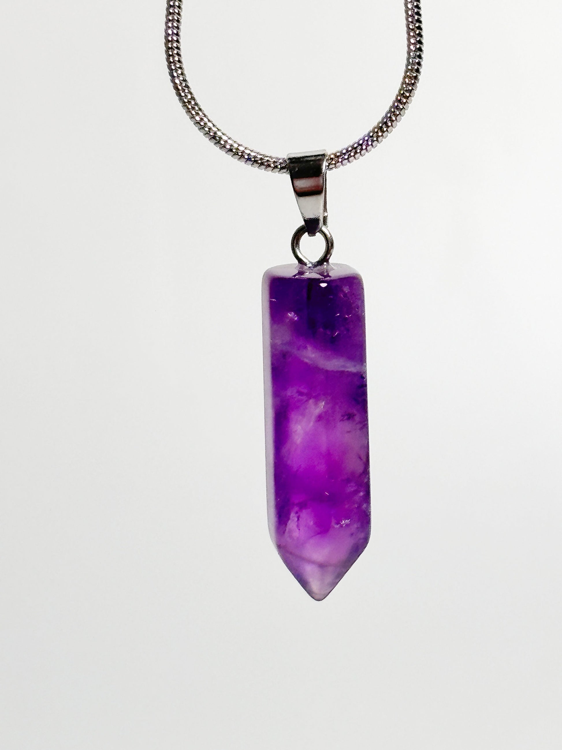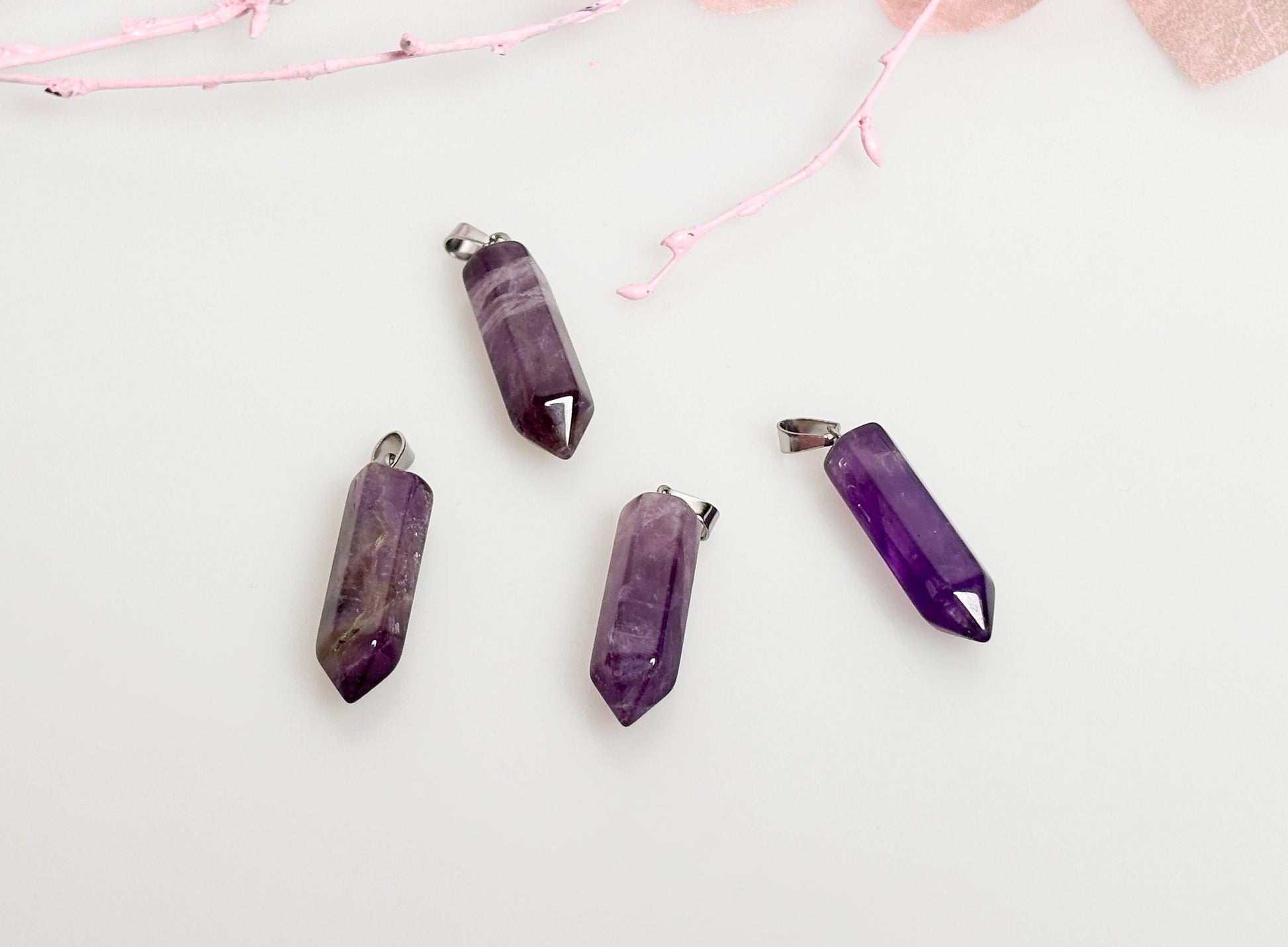 Tauche ein in die natürliche Schönheit und die spirituelle Kraft des Amethysts mit diesem atemberaubenden Kettenanhänger. Jeder Anhänger ist ein Unikat aus einer hochwertigen Amethystspitze und einer eleganten Silberöse.