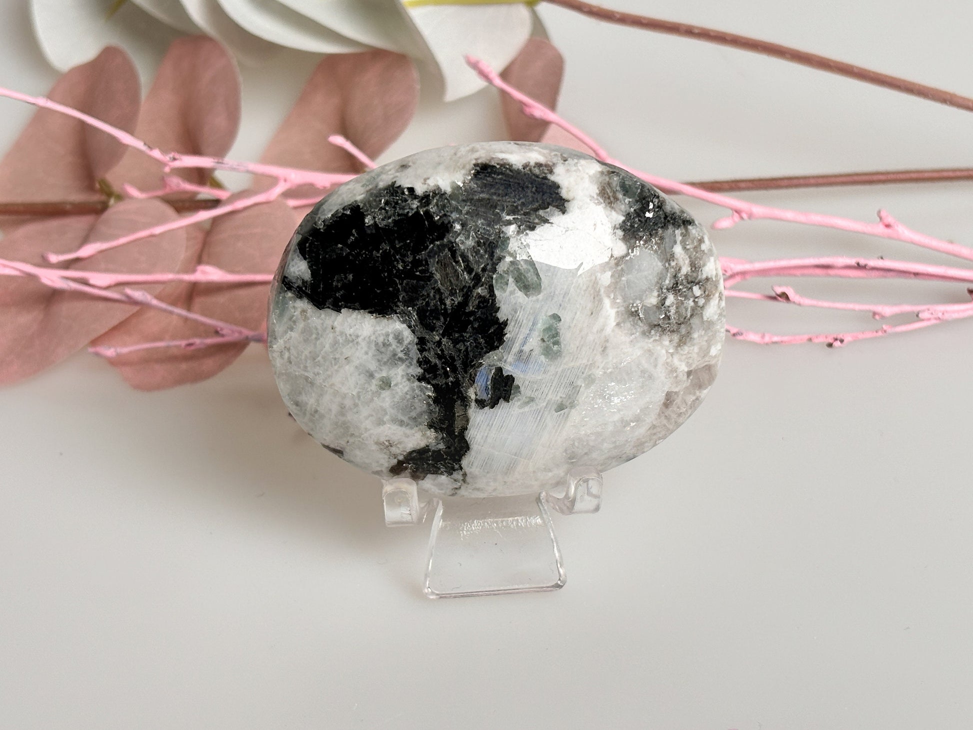 Optional bieten wir zu jedem Palmstone einen hochwertigen Halter an, der den Stein perfekt in Szene setzt und zugleich als elegantes Dekorationsstück dient. So können Sie die Schönheit des Regenbogen Mondsteins in Ihrem Zuhause oder Büro genießen und gleichzeitig von seiner energetischen Wirkung profitieren.