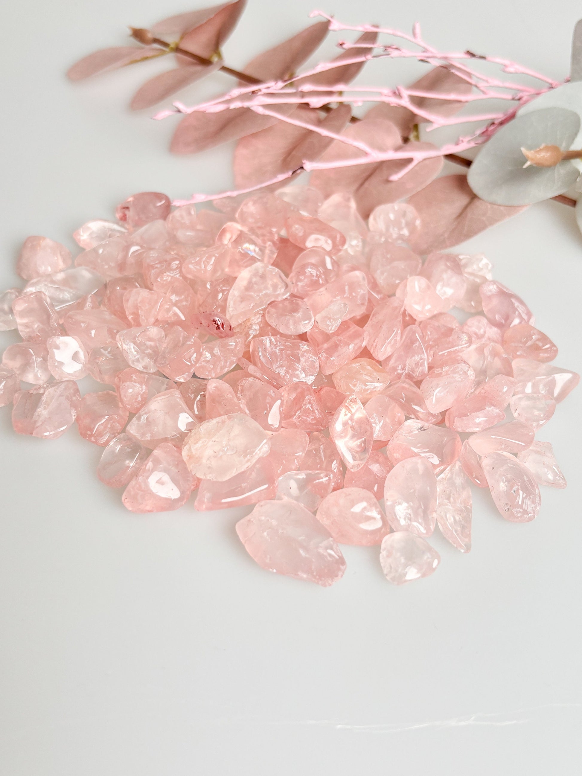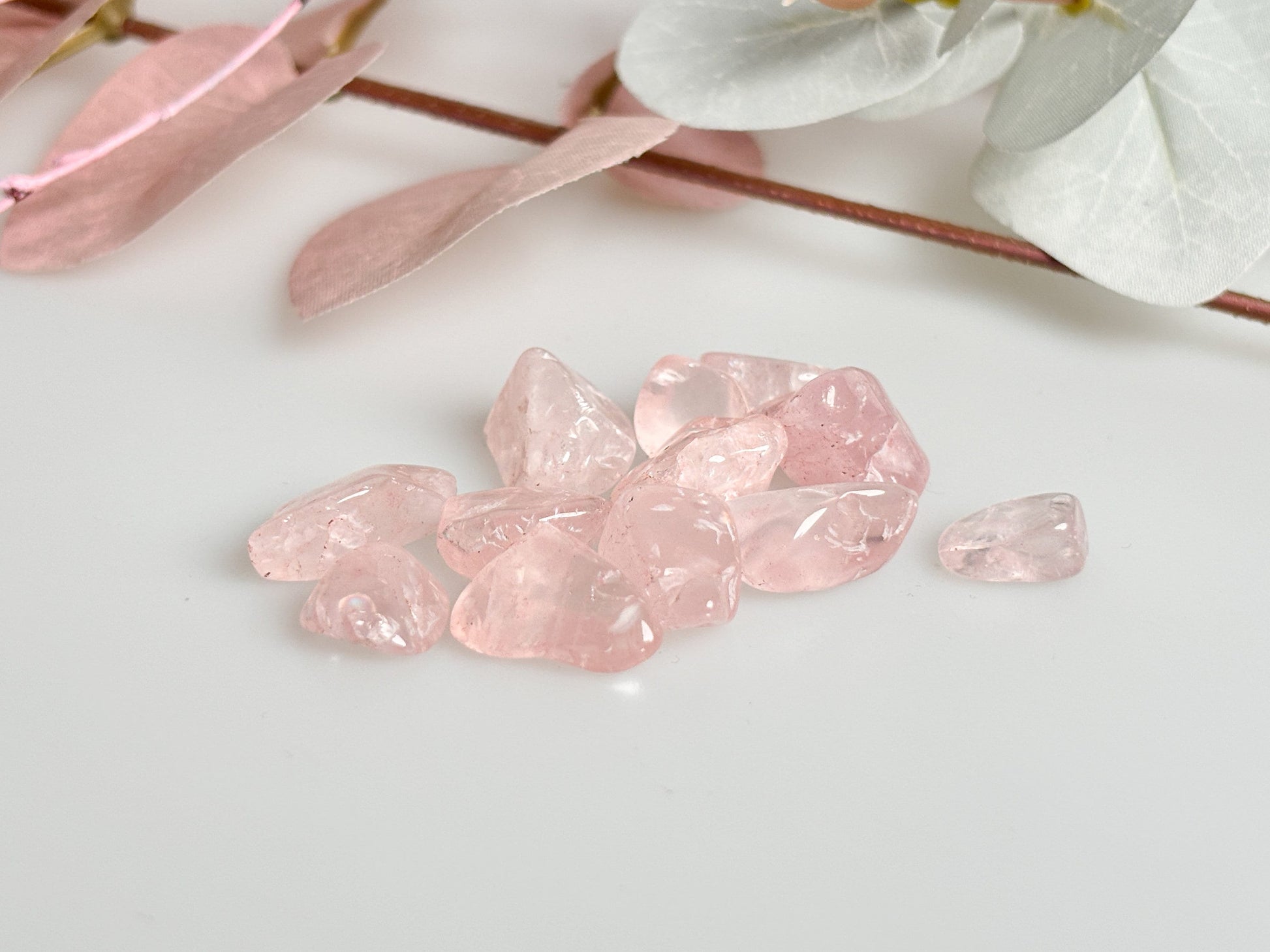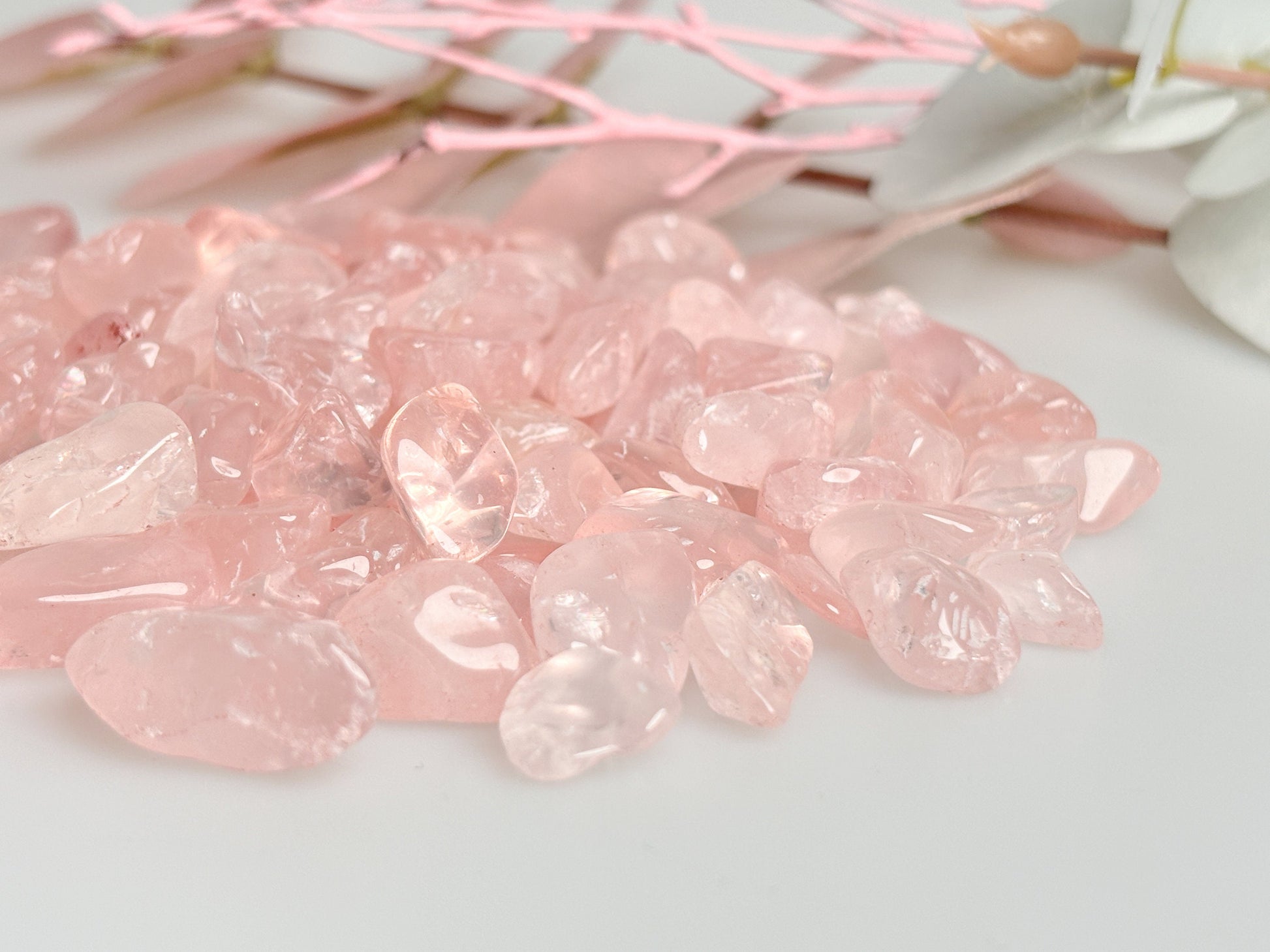 Erleben Sie die kraftvolle Energie des Rosenquarzes mit unseren hochtransparenten Rosenquarz Chips. Diese edlen Steine eignen sich perfekt zur Wasserenergetisierung oder als dekoratives Highlight in Ihrem Zuhause. Die Chips sind ca. 1,5 cm groß und strahlen in einem zarten Rosa, das sofort Ruhe und Harmonie ausstrahlt.
