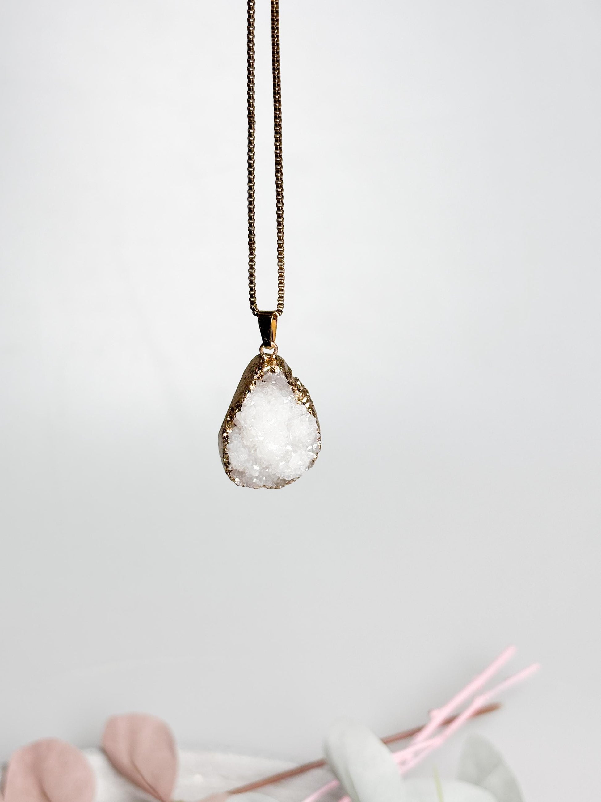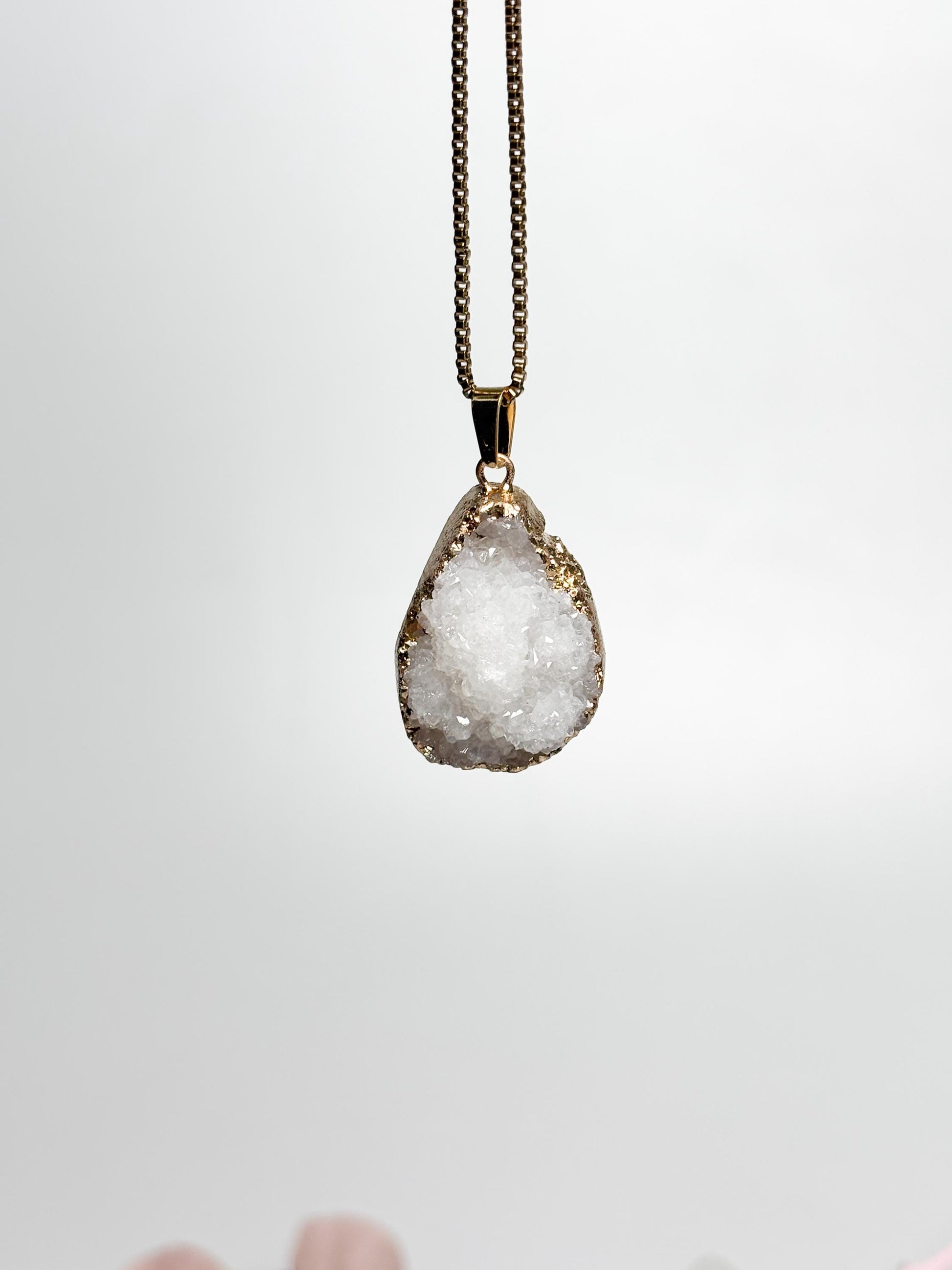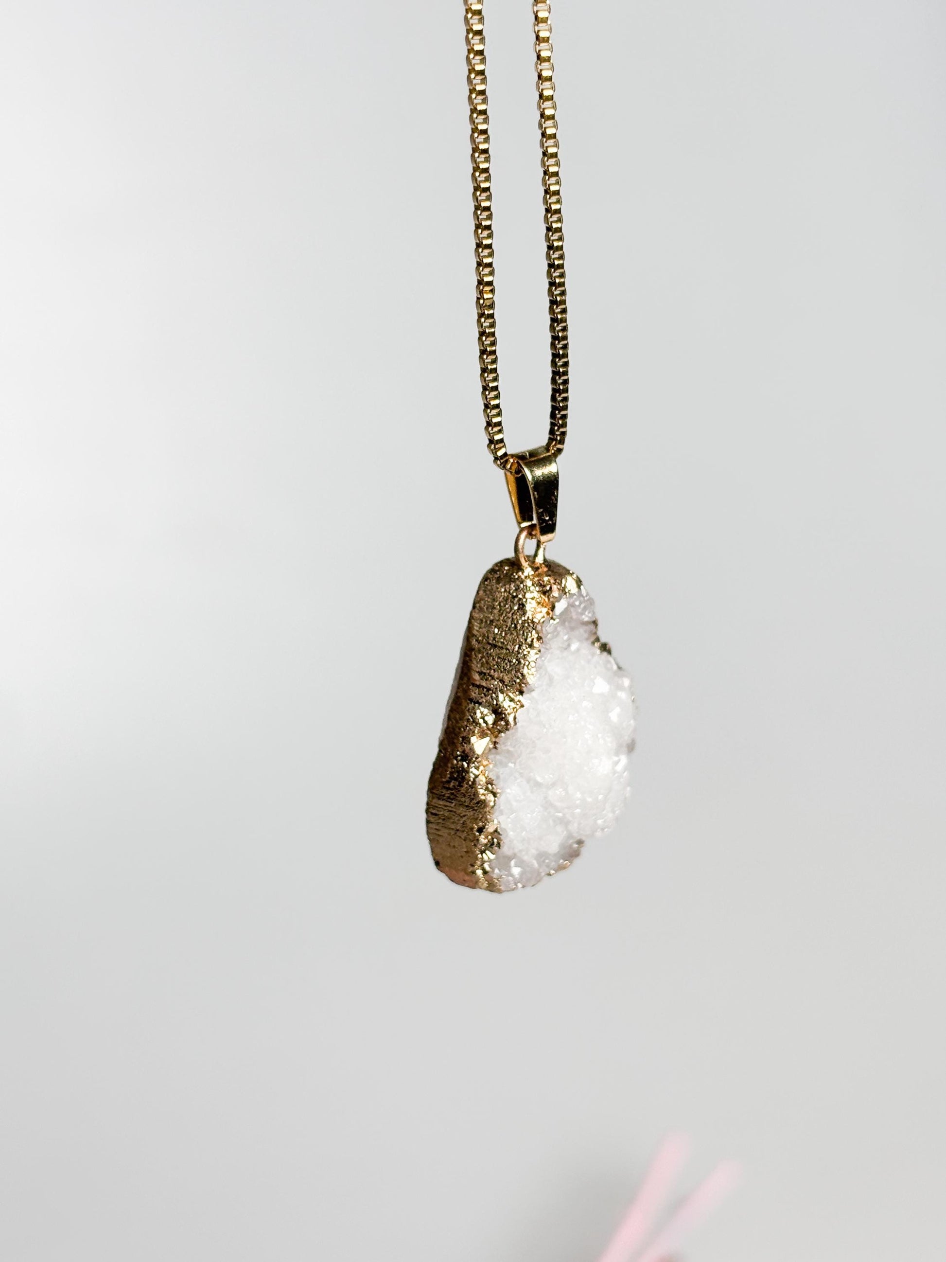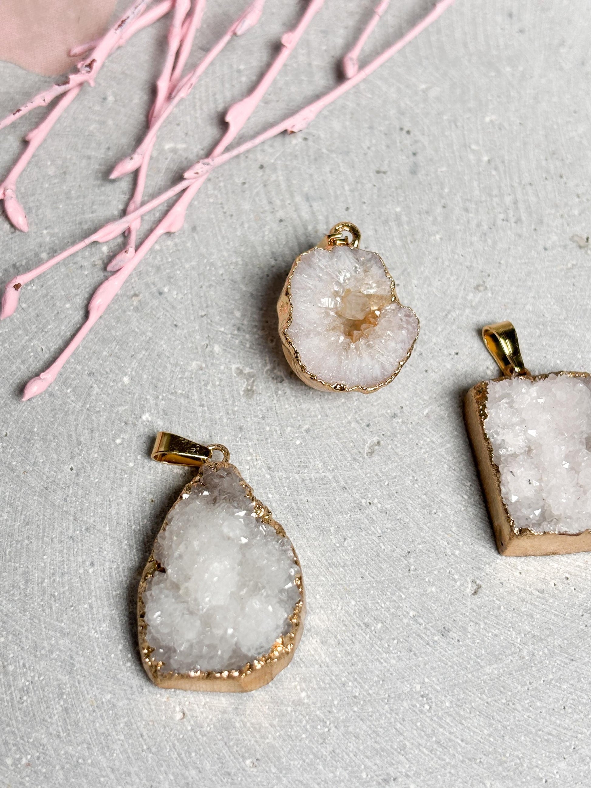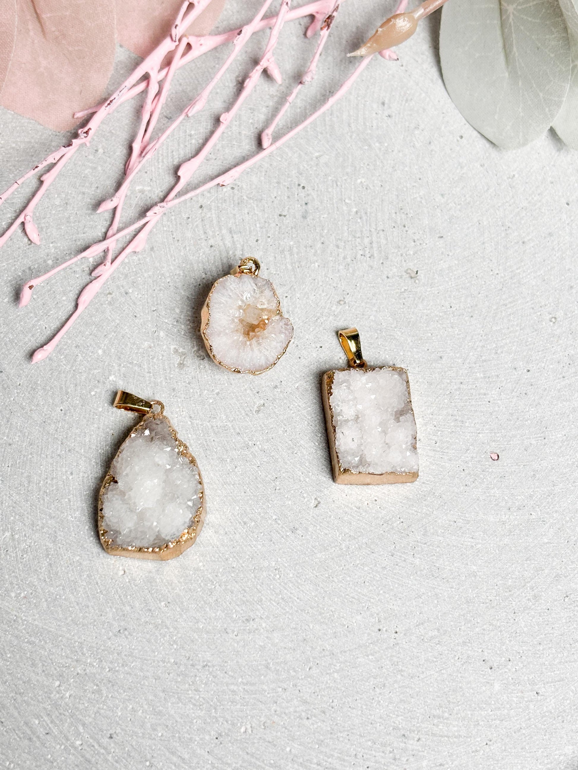 Weiße Drusen Anhänger Kristall Kettenanhänger in verschiedenen Formen, goldfarben gefasst, Edelstein Schmuck, Geoden Anhänger